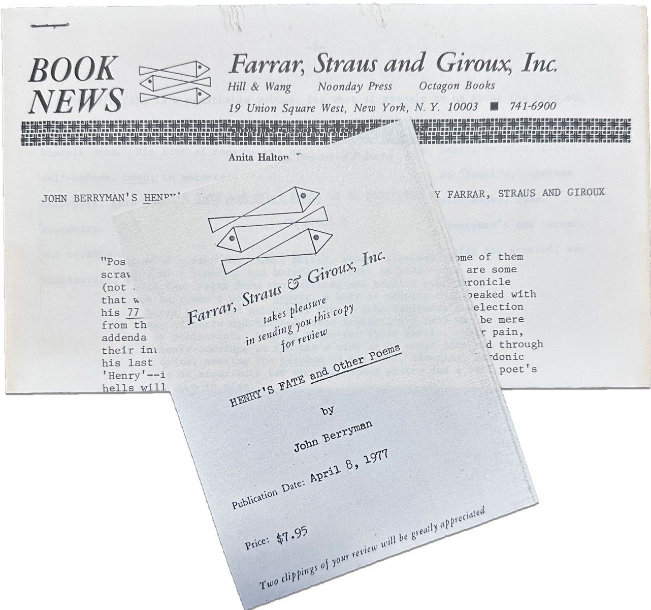 New York: Farrar, Straus, & Giroux, 1977. First Edition. A review copy with slip and FSG "Book News" - a two page publicity letter - laid in. Black cloth; dustjacket; 8vo. Published posthumously, it includes a number of uncollected Dream Songs as well as unfinished poems. A Fine copy in a lightly rubbed dustjacket. Scarce as a review copy.