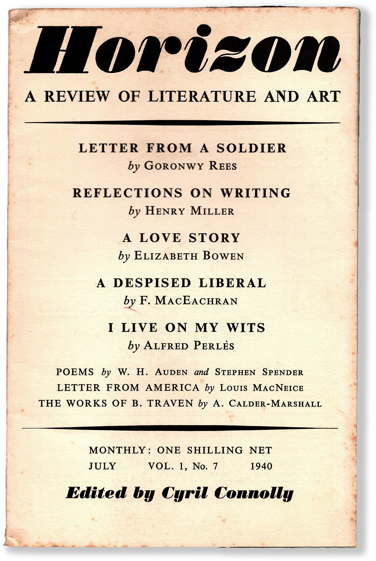 London: Horizon, 1940. First Edition. Light beige printed wraps (there is also an issue in gray covers); 8vo. July 1940 issue with the poem "Spring in Wartime" by Auden, also Spender, Lee, and others; a story by Elizabeth Bowen and prose by Miller. One plate. Light soiling, wear and toning, else very good.