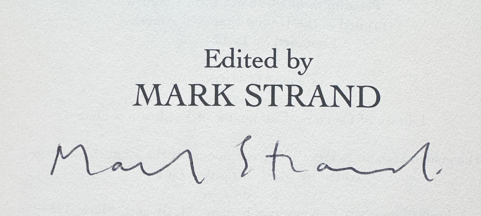 New York: The Ecco Press, 1994. First Edition. Cloth-backed boards in dust jacket; small 8vo. 180 pp. Signed by the editor, poet Mark Strand. Anthology edited by Mark Strand, issued after he became poet laureate; he contributes the preface as well as the selection of poems "meant to be enjoyed": from Anonymous to Ashbery.... A fine copy in a very near fine dust jacket.