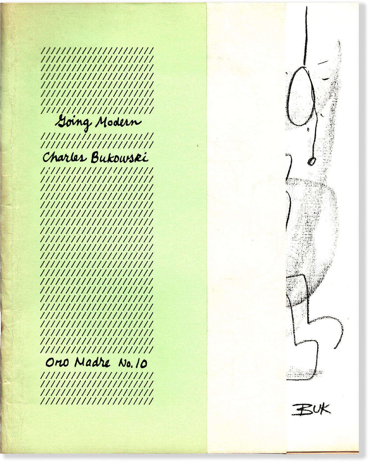 Fremont, CA: Ruddy Duck, [1984]. First Edition. Staple bound wrappers; 8vo. 10 pp. This issue of Oro Madre magazine (no. 10) edited by Loss & Jan Glazier was suppressed, most of the edition destroyed. This copy has a slip from the publisher stating that the "issue was created in full collaboration with and with the personal support of Charles Bukowski... including the selection of its contents and its title". Bukowski's publisher according to Loss Glazier of Ruddy Duck blocked distribution and ordered the print run destroyed. It was never sold by the press, but copies have made their way into the marketplace and into the standard bibliographies. Nevertheless, a scarce and under appreciated BUK "A" item. Staples rusty, else easily very good, little wear.