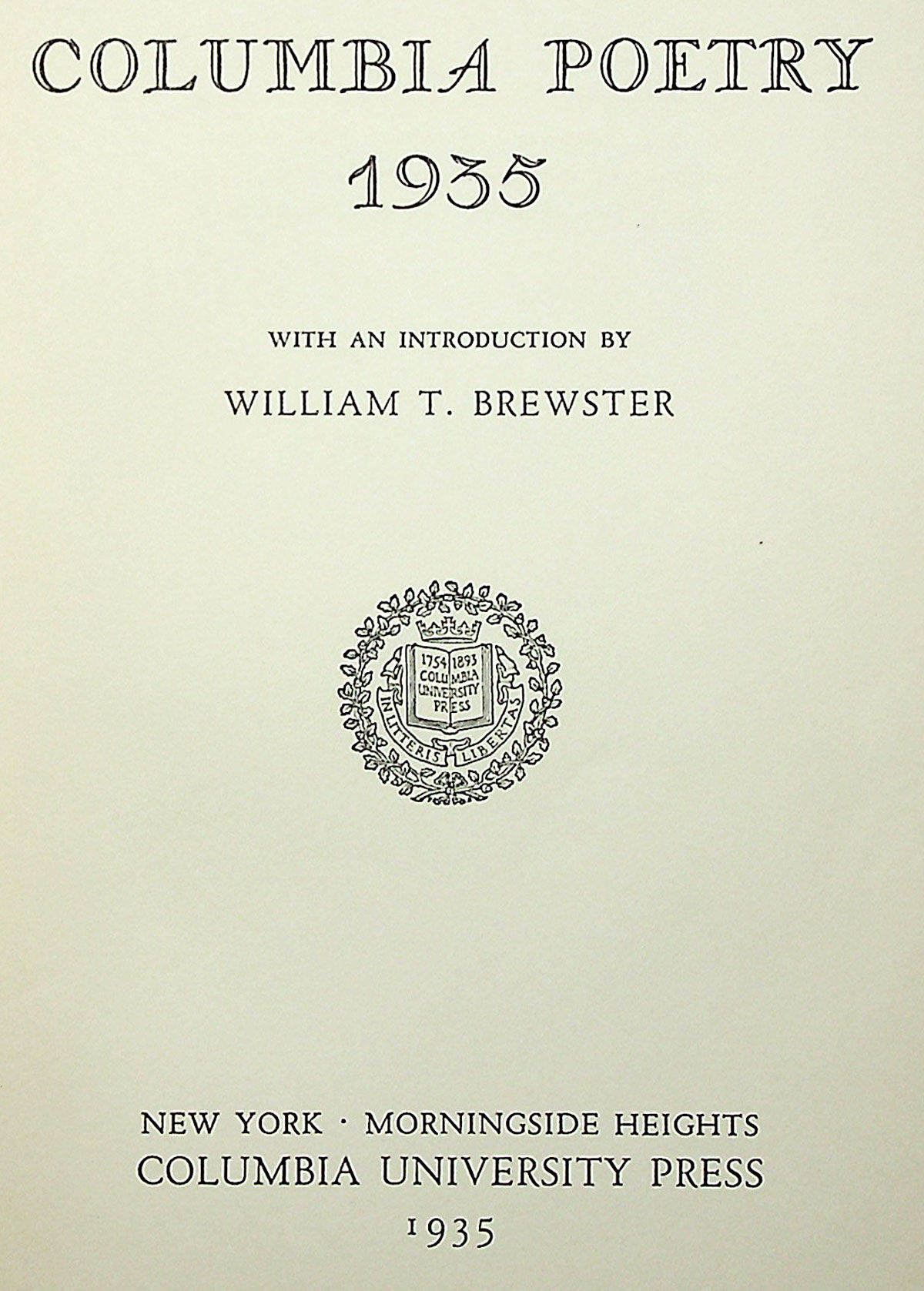 New York: Columbia University Press, 1935. Green cloth with paper spine label; 12mo. 45 pp. Berryman's first book appearance. His bibliographer notes only stiff blue-green wrappers, but copies including this seem to exist that were contemporaneously bound in cloth. Spine label worn; bookplate on ffep, else Very Good. STEFANIK B1. [66036].