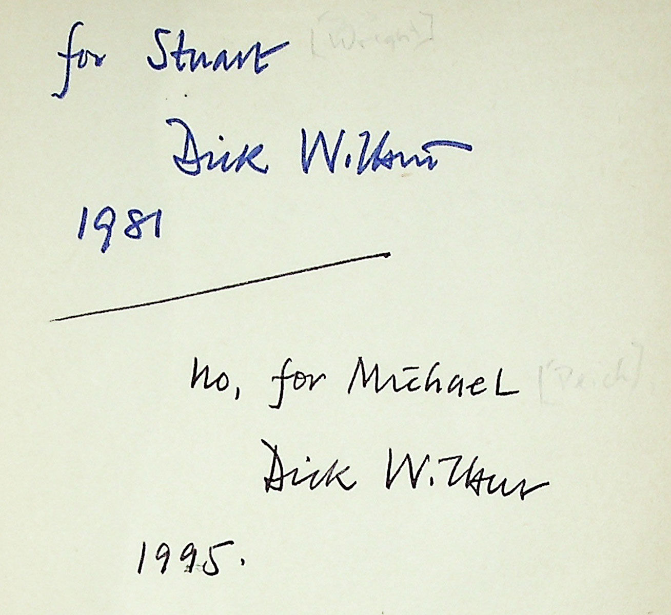 New York: Harcourt Brace, 1956. First Edition. Pale blue-green cloth in dustjacket; small 8vo. 50 pp. Inscribed twice on the front free end paper on the title page by the poet: first to "Stuart [Wright?] in 1981, then to __ another well-known small press publisher/printer of poetry in 1995. Both signed "Dick Wilbur". The poet's third collection, winner of the Pulitzer Prize and National Book Award. Includes arguably Wilbur's most famous poem: "Love Calls Us to the Things of This World". Top edge toned else about Fine in a rubbed at extremities Near Fine, price-clipped dustjacket. It does not have the ubiquitous NBA winner sticker, thus the earliest published state of the dustjacket.