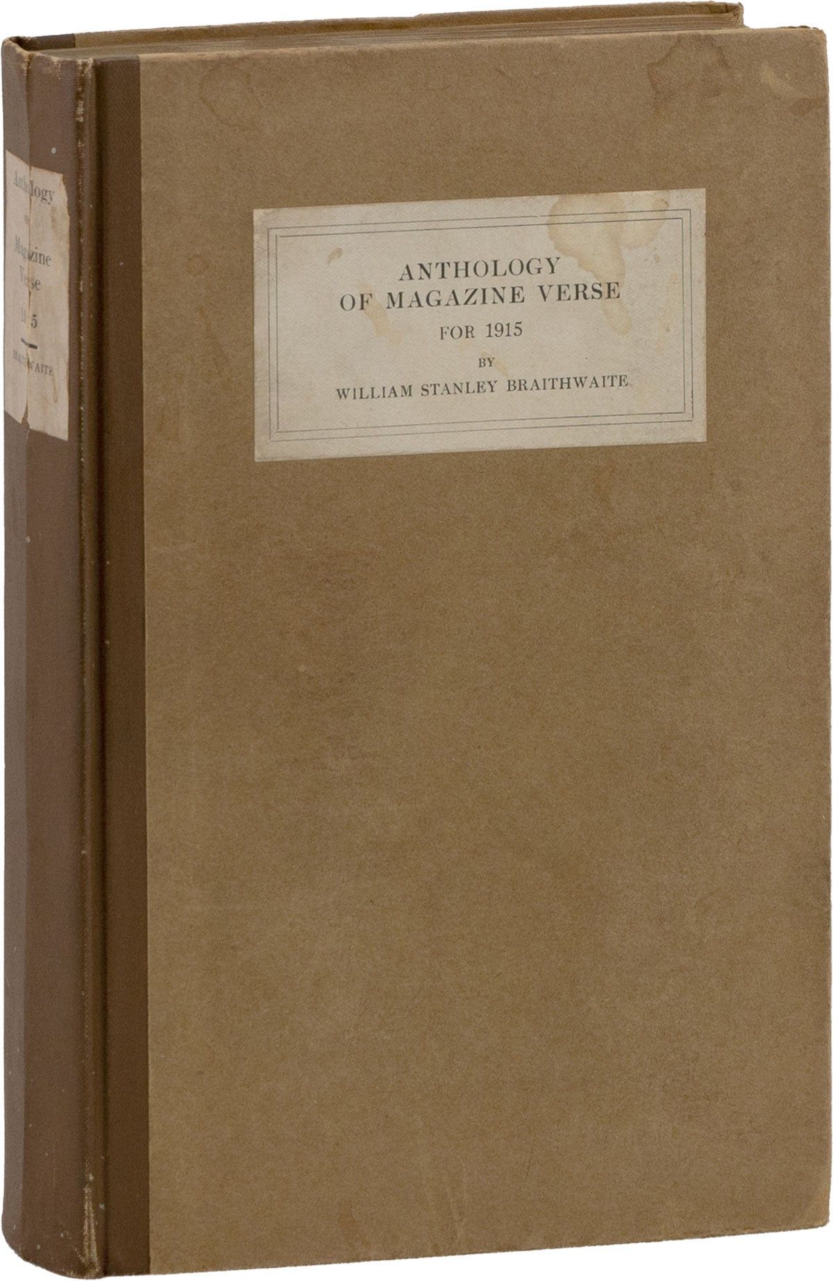 New York: Gomme & Marshall, 1915. First edition. 296 pp. Brown cloth-backed boards, with paper labels, t.e.g. The first book appearances of many important poems: Wallace Stevens "Peter Quince at the Clavier" (Edelstein B5), Robert Frost "The Road Not Taken". "Death of the Hired Man" and "Birches", Sara Teasdale, Edward Arlington Robinson, James Weldon Johnson, .H. D., Vachel Lindsay, Amy Lowell, and many others. Braithwaite was an African-American living in Boston, his anthology would be published from 1913 until 1929. In this volume he reviews books of the year; reviewing Frost's first two books: "With Mr. Masters, Robert Frost has contributed the most valuable additions to American poetry of the year". A close to very good copy, spot on the front label, spine creased lengthwise with chips to the label. Lacking the scarce dustjacket.