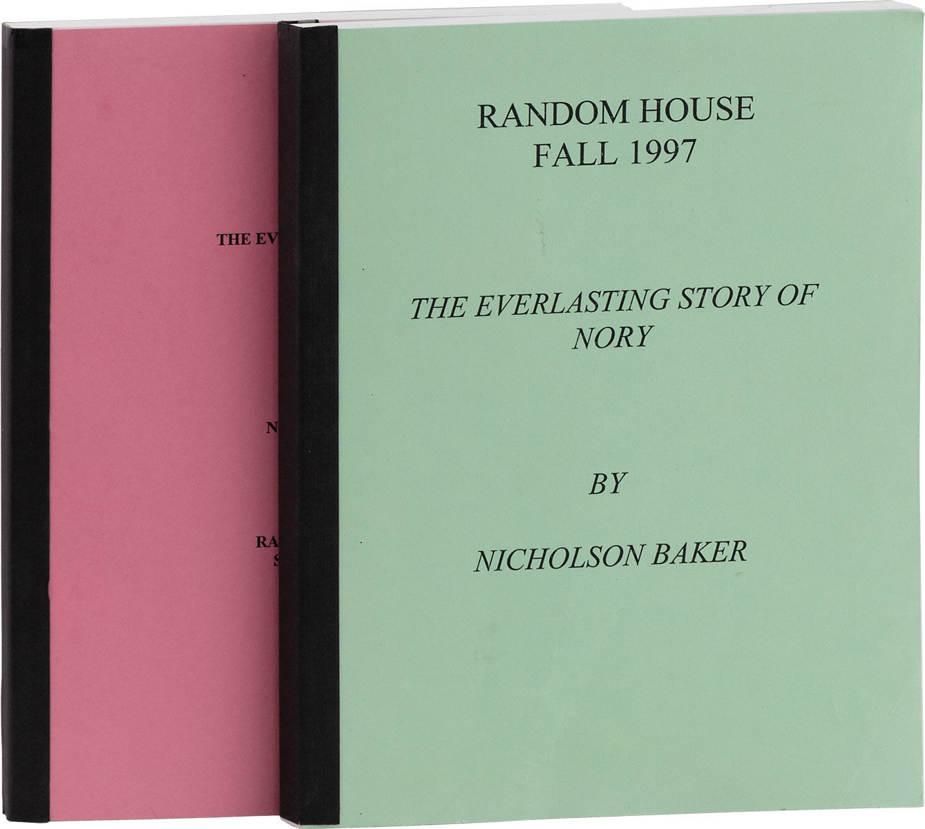 New York: Random House, 1998. First edition. Advanced proofs in tape bound paper covers 8 1/2 x 11 inches. TWO COPIES: One in green covers dated Fall 1997 (1-23-97), the Second in pink covers Summer 1998 (dated 4-2-97). Clearly the book was postponed from the Fall 1997 list to the Summer (passing over the Spring) list. We note no significant changes, but the page numbers vary from 264 for the later version from 268 for the earlier. Both preceding the glossy advance proofs. A novel in the voice of a nine year old American girl in England, and reminiscent in its obsession on the details of life of his first two novels. Near fine. For two:.