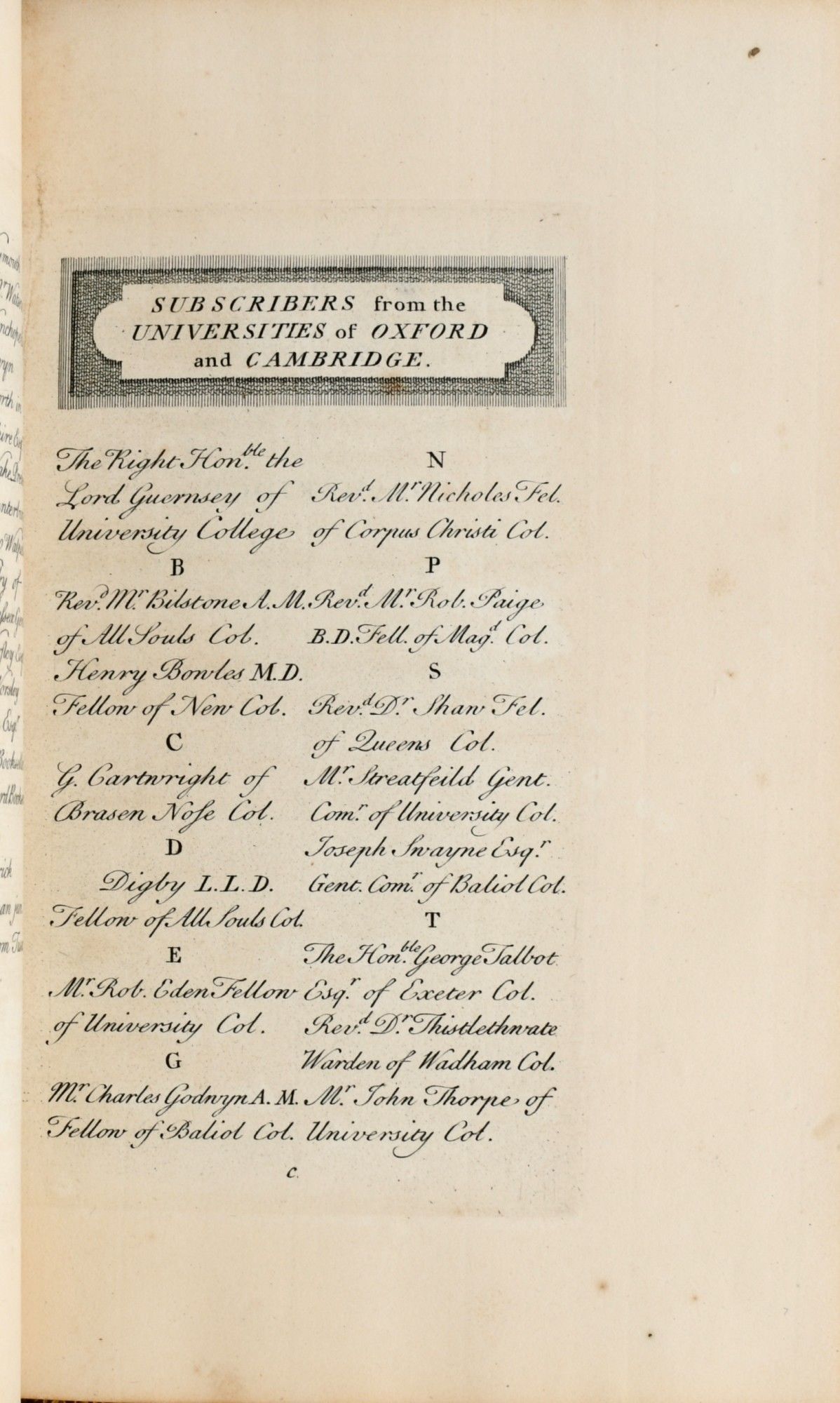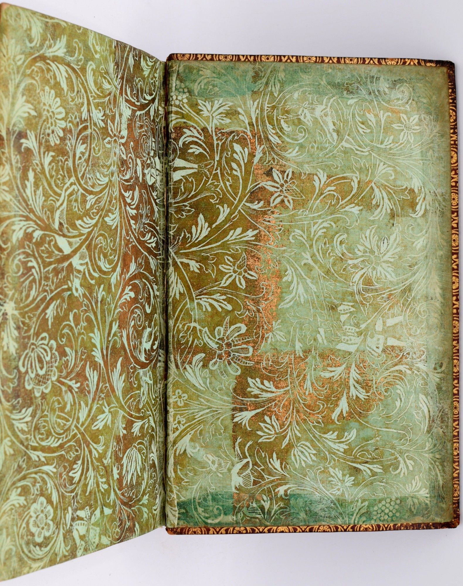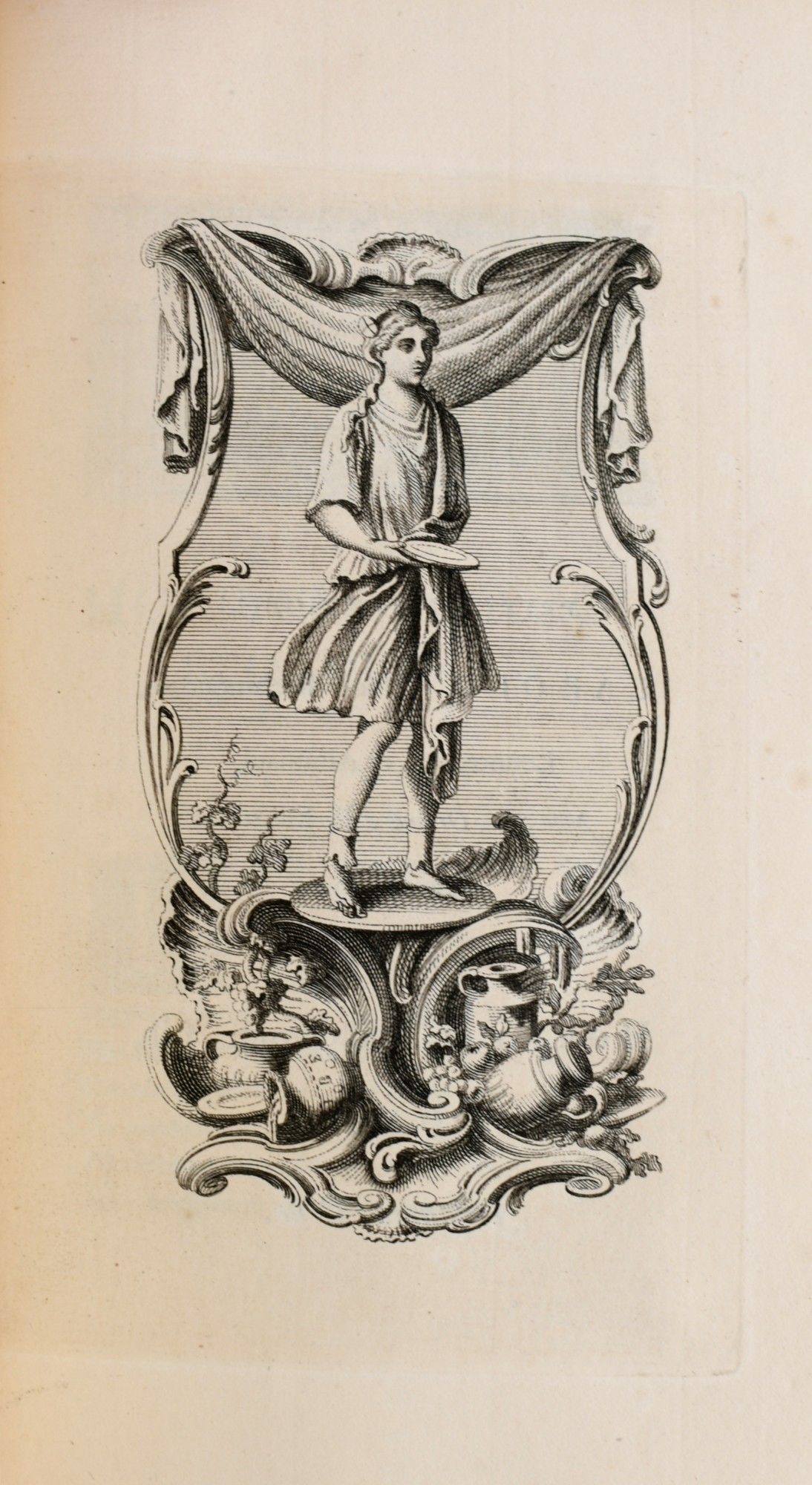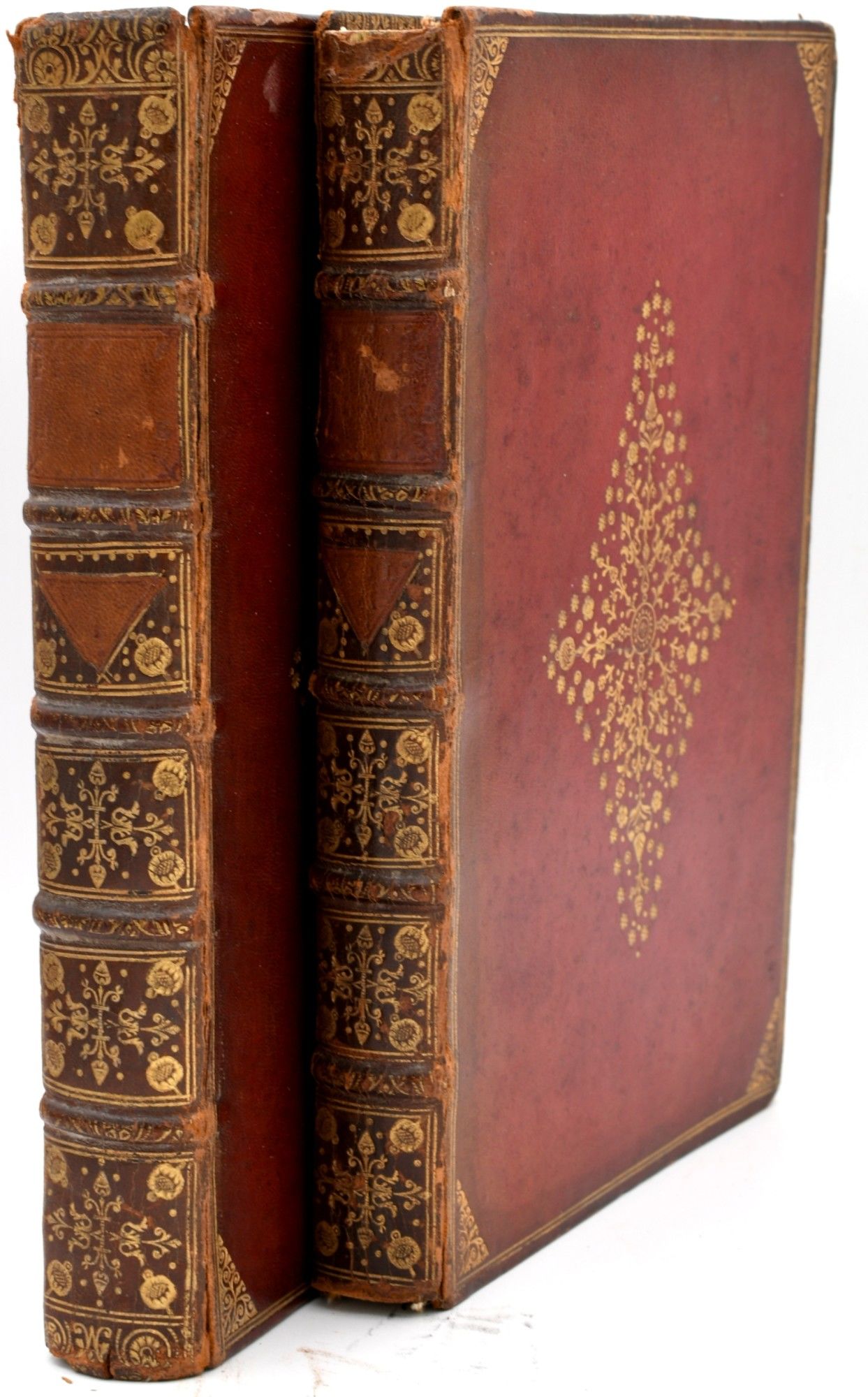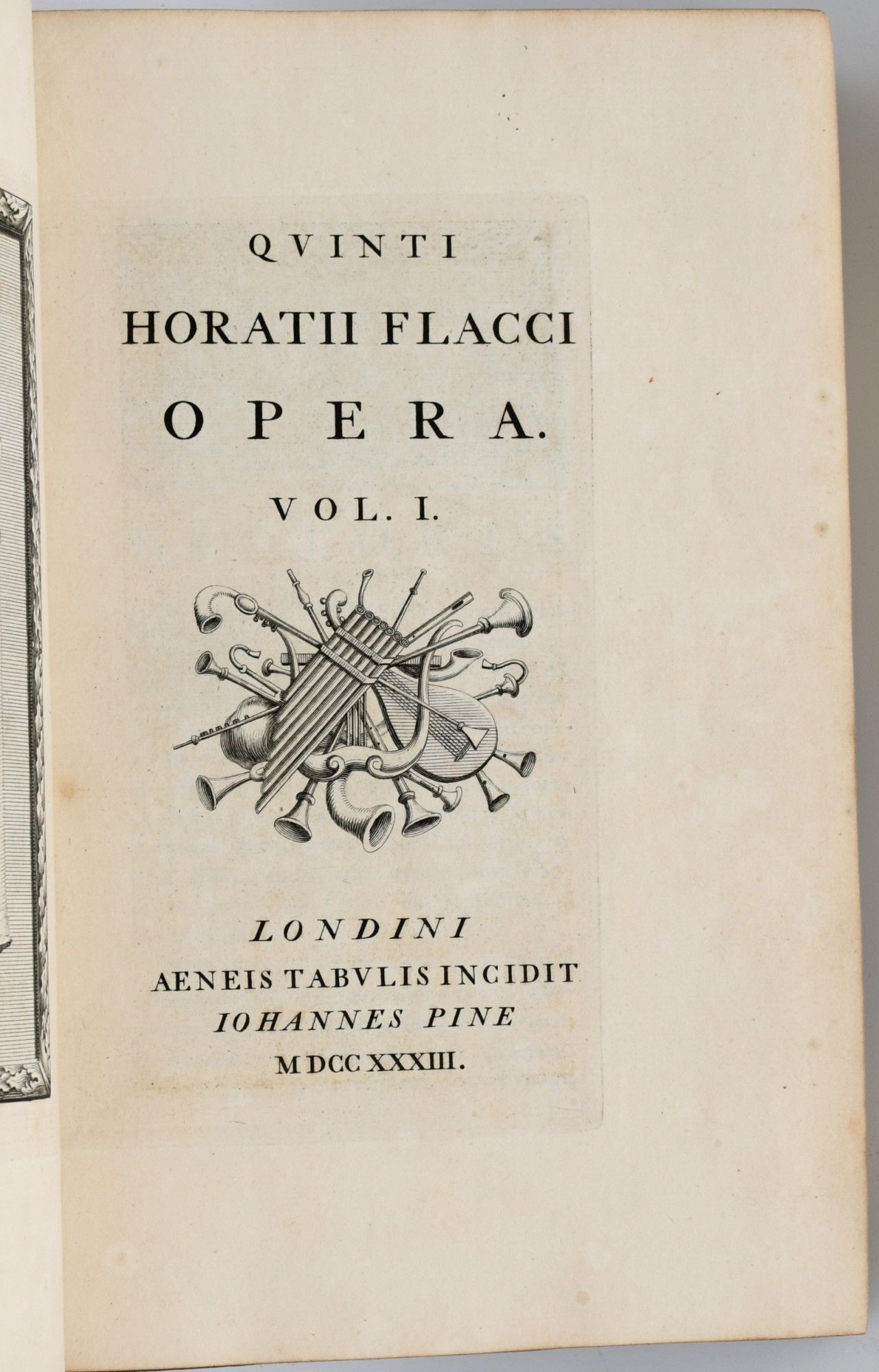London: John Pine [Iohannes Pine], 1737. First Edition. Full Leather. Very Good binding. Full crimson leather double ruled in gilt to the perimter of the boards and with decorative corners; each board with a gilt lozenge in the center fashioned from printer's flowers; all edges gilt; decorative roll to turn-ins; with splendid endpapers in dutch gilt; the volume are lacking the labels; with previous owner armorial bookplates; Volume I published 1733; Volume II published 1737; the first state with the "Post est" error on Volume II, 108; [xxviii], 265; [xxiv], 191, [11] following; beginning of separation to the joints of Volume I, though holding; there is some minor foxing~~A remarkable edition, printed entirely from engraved copper plates -- text, initials, vignettes, portraits, etc John Pine (1690-1756) was one the ablest of England's engravers during the 18th century. Numerous handsome vignettes, initials, head- and tail-pieces accompany the text. Pine is considered by some historians to have been the first black man made a mason in England. He was a member of the masonic lodge at Globe Tavern in 1725 (where his name was spelled ‘Pyne') and we know that "Bro. John Pine engraved the annual List of Lodges from 1725 to 1741. ~~Printing and the Mind of Man (1963): "This edition of Horace was printed wholly from copper plates engraved by John Pine. The text was first set in type, and an impression from it on paper was transferred to the copper, which was then engraved, the decorations being added at the same time. The result was a page of great brilliance and precision, but the method was prohibitively expensive." (PMM2, 620). Very Good binding.