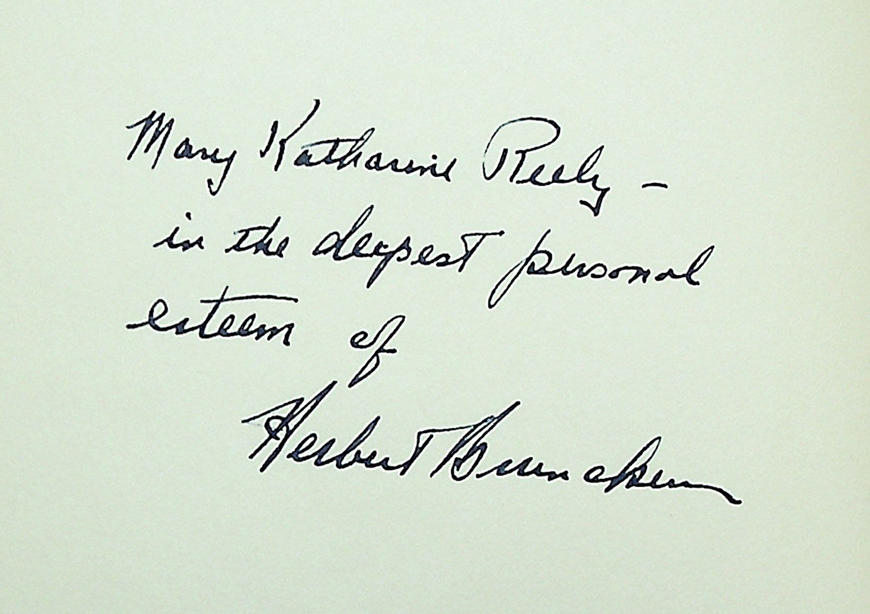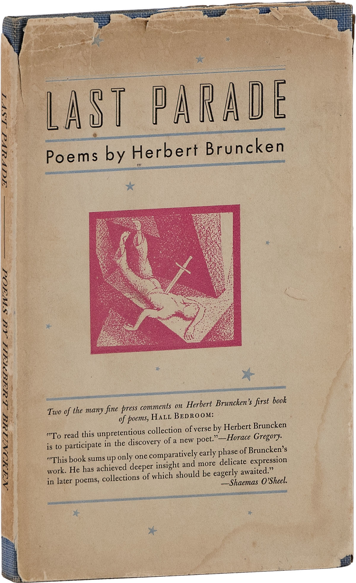 Muscatine, Iowa: The Prairie Press, 1938. First edition. One of 390 copies, designed and printed by Carroll Coleman. Blue cloth with paper label; dustjacket; 45pp. Inscribed, 'Mary Katherine Reely in the deepest personal esteem of Herbet Bruncken". Lightly faded along extremies, else Fine. Dustjacket chipped and dampstained, lightly toned; complete and better than usual; Good or better. Typically fine and an early publication from this important fine press. A collection of poems. Rare signed.