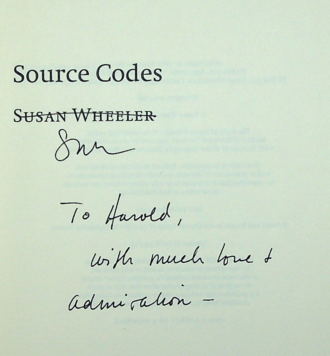 Applecros, West. AUS: Salt, 2001. First Edition. Original wrappers (no hardcover issue); 8vo. 107 pp. Inscribed by the poet to critic Harold [Bloom], and signed "with much love & admiration, Susan". Fine. Wheeler chairs the Creative Writing Department at Princeton, and is a regular in the Best American Poetry Series, including The Best of the Best 1988-1997, edited by Harold Bloom. Nice association.
