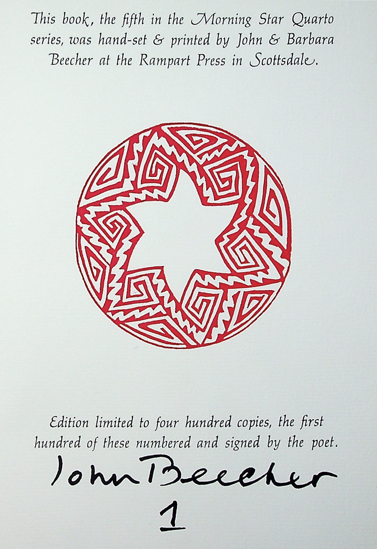 Scottsdale: Ramparts, 1960. First edition. Red cloth, black printed paper labels. 8vo. 29 pp. One of 100 copies (of 400 total) signed and numbered (copy #1) by the author. Fine copy attractively printed; in the original acetate covers.