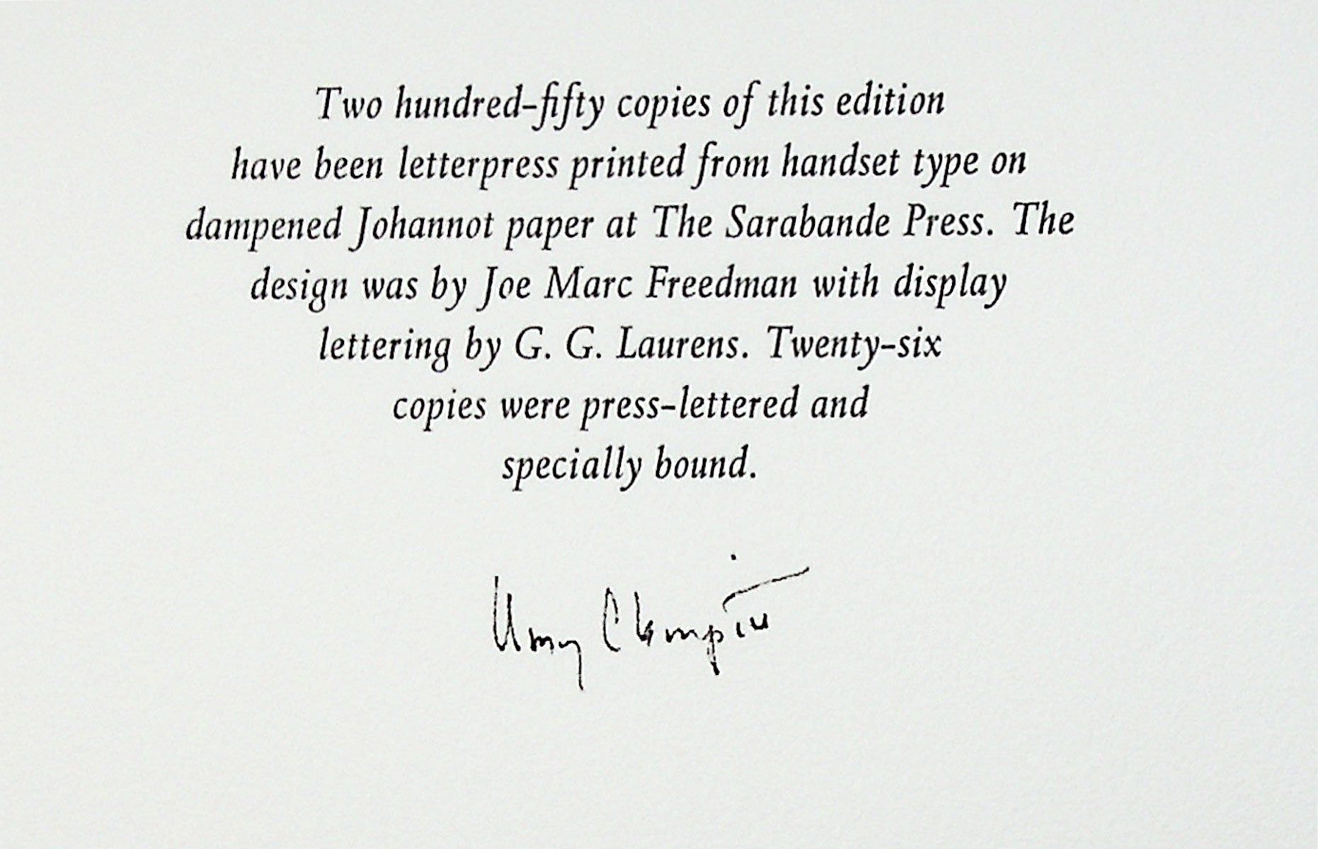 New York: Saraband Press, 1984. First Edition. Sewn card covers with gilt-stamped lettered jacket; Small folio. 34 pp. Eight poems beautifully printed on dampened Johannot paper; titling in blue. One of 250 copies signed by Clampitt; this is one of Clampitt's own copies, unnumbered but signed in the colophon, and additionally inscribed on the half title: "For Richard Howard to whose generosity I am so greatly beholden with thanks and vast admiration. Amy Clampitt. 17 February 1985." Covers with a few blemishes and soiling, mostly on rear; still easily Very Good. Lacking publisher's slipcase. An excellent association copy: Howard was a winner of the Pulitzer Prize for poetry, the NBA for translation, and a longtime Poetry Editor for the Paris Review (where he published her well-known interview).