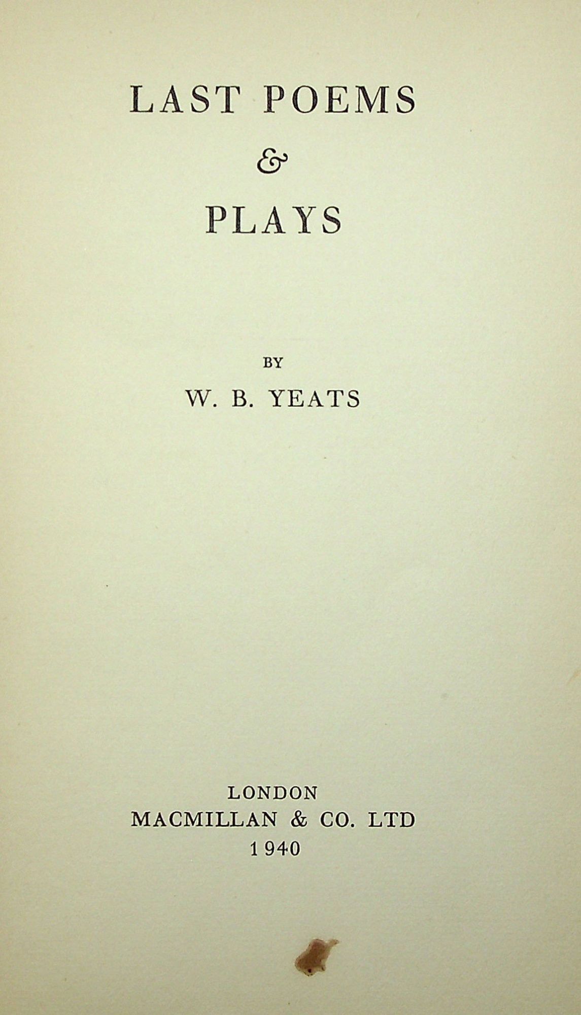 London: Macmillan, 1940. First Edition. One of 2000 copies. Green cloth, blind stamped design w/ gilt spine lettering; large 8vo. Gilt rubbed, shaken, interior a bit soiled, about Very Good; lacking dustwrapper. Combines with different ordering and in some cases titling of two Cuala Press limited editions. Includes many of the poet's finest poems. WADE 203.