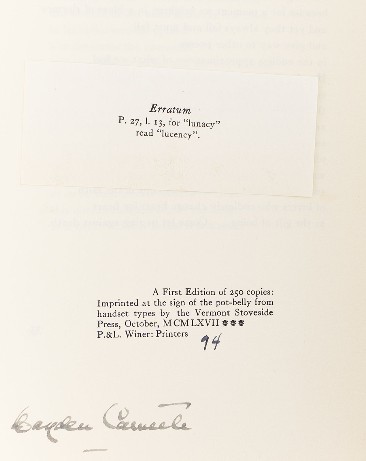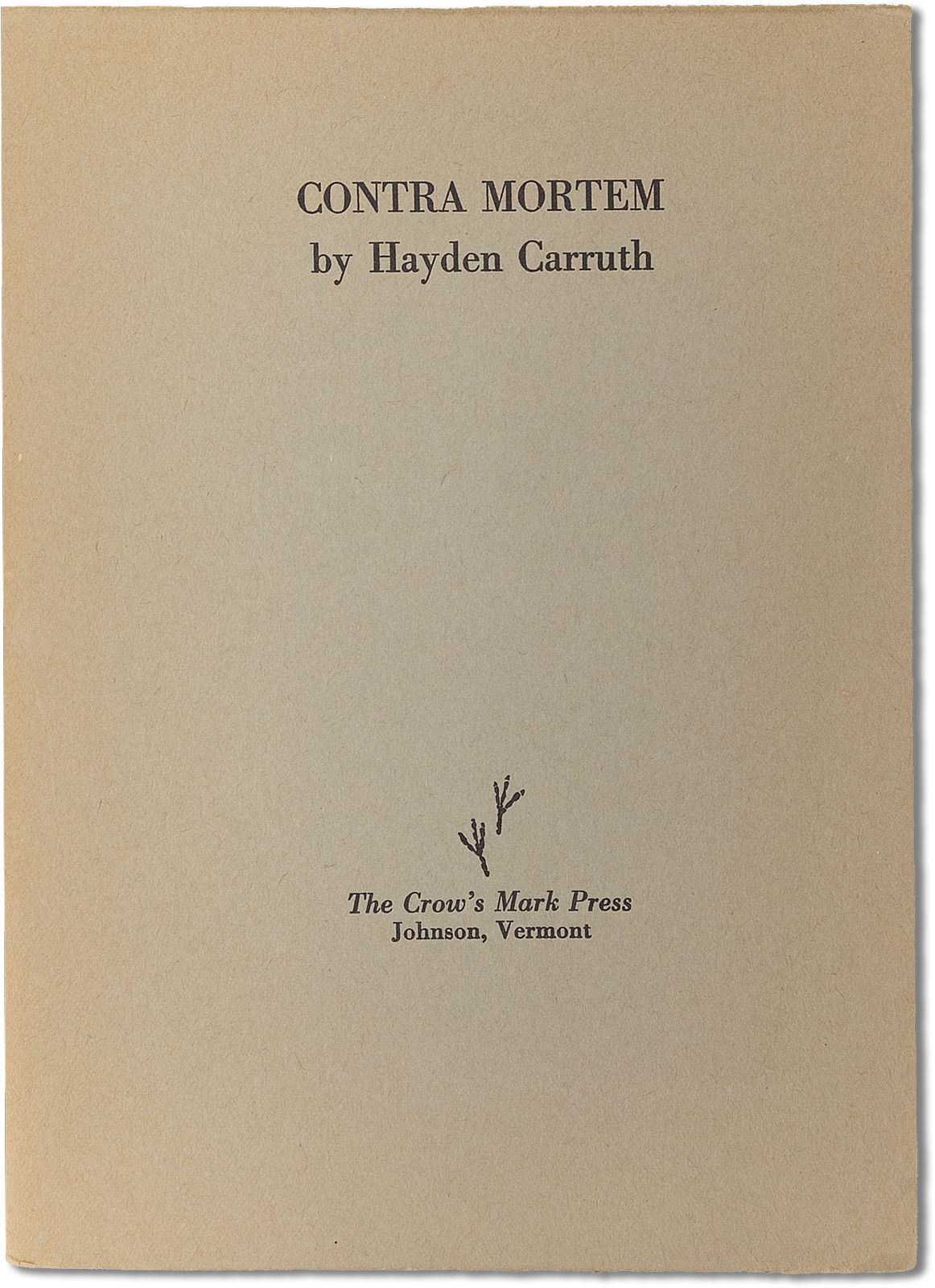 Johnson, VT: The Crow's Mark Press, 1967. First Edition. Small sewn chapbook printed at the Stoveside Press in Vermont; 12 mo.. 33 pp. One of 250 copies numbered and signed by the author. Errata slip laid in. Toned at extremities, else very good in sewn wrappers. The Crow's Mark Press was the author's own press.