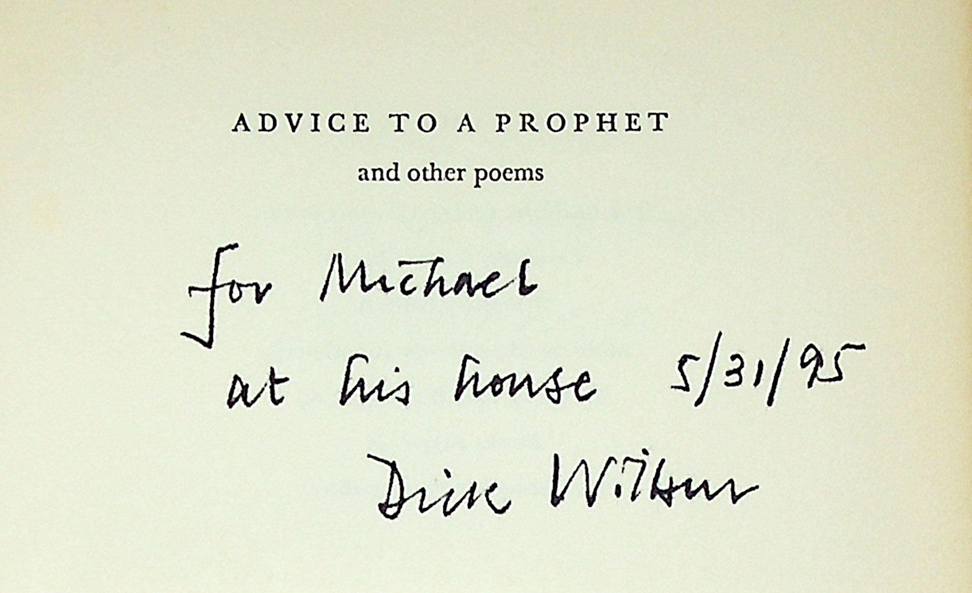 New York: Harcourt Brace, 1961. First edition. Cloth-backed decorated and marbled paper-covered boards in dustjacket; small 8vo. 64 pp. Inscribed by the poet "For __ at his house 5/31/95" and signed "Dick Wilbur". As often the area around the hinges darkened, trace foxing, but easily Very Good in a lightly worn at extremities, lightly foxed dustjacket.