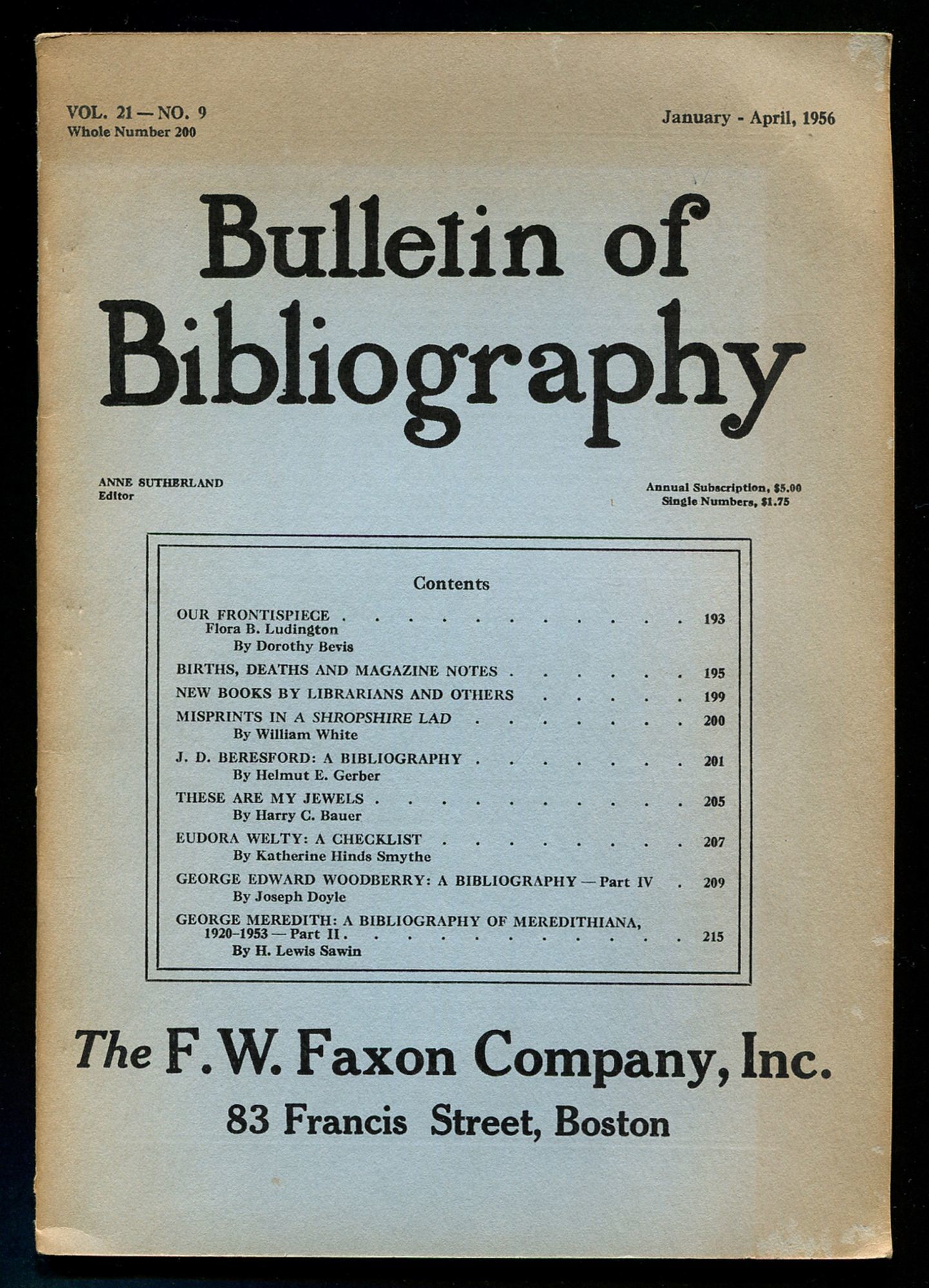 Boston: The F.W. Faxon Company, 1956.  Softcover. Very Good.  First edition. 194-216pp. Portrait frontispiece. Stapled printed wrappers. Staples slightly oxidized, covers unevenly tanned, rear wrap with a few small soil marks, very good. Includes "Misprints in *A Shropshire Lad*," "J.D. Beresford: A Bibliography," "Eudora Welty: A Checklist," "George Meredith: A Bibliography of Meredithiana, 1920-1953 – Part II" and more.