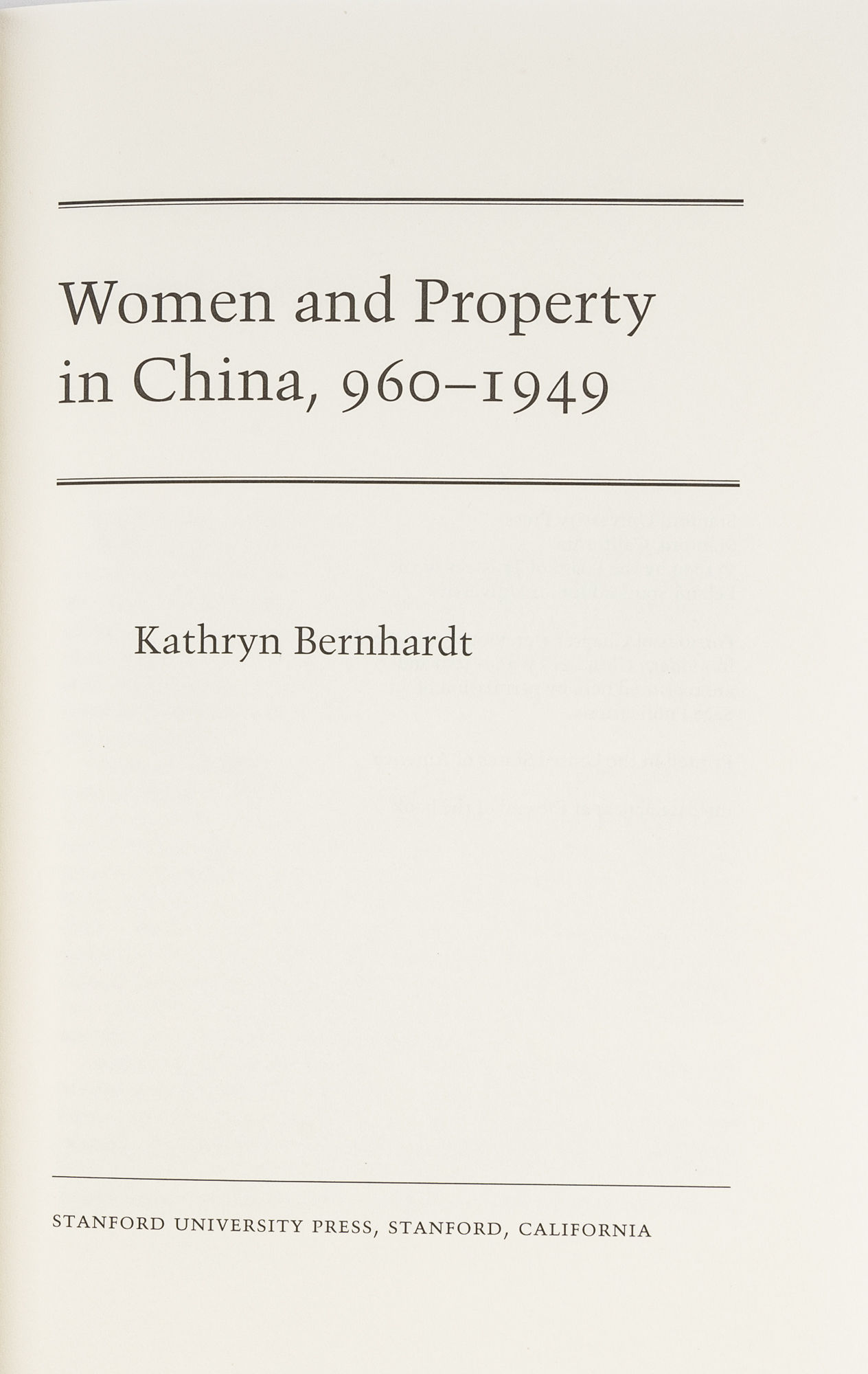 1999. Bernhardt, Kathryn. Women and Property in China: 960-1949. Stanford, [Calif.]: Stanford University Press, [1999]. viii, 236 pp. Hardcover in near-fine dust jacket. Internally clean. $25. * Contents: 1.; The Inheritance Rights of Daughters from the Song Through the Qing; 2.; The Inheritance Rights of Widows from the Song Through the Qing; 3.; Widows and Patrilineal Succession in the Early Republican Period; 4.; Property Inheritance Under the Republican Civil Code; 5.; Widows' Inheritance Rights Under the Republican Code; 6.; Daughters' Inheritance Rights Under the Republican Code; 7.; The Property Rights of Concubines in the Imperial and Republican Periods.