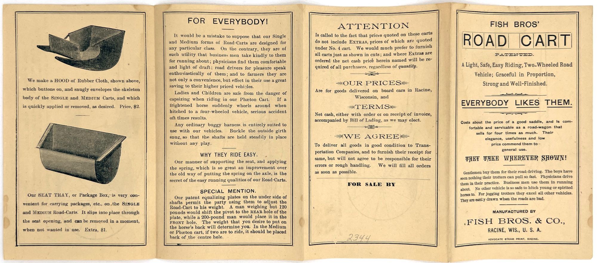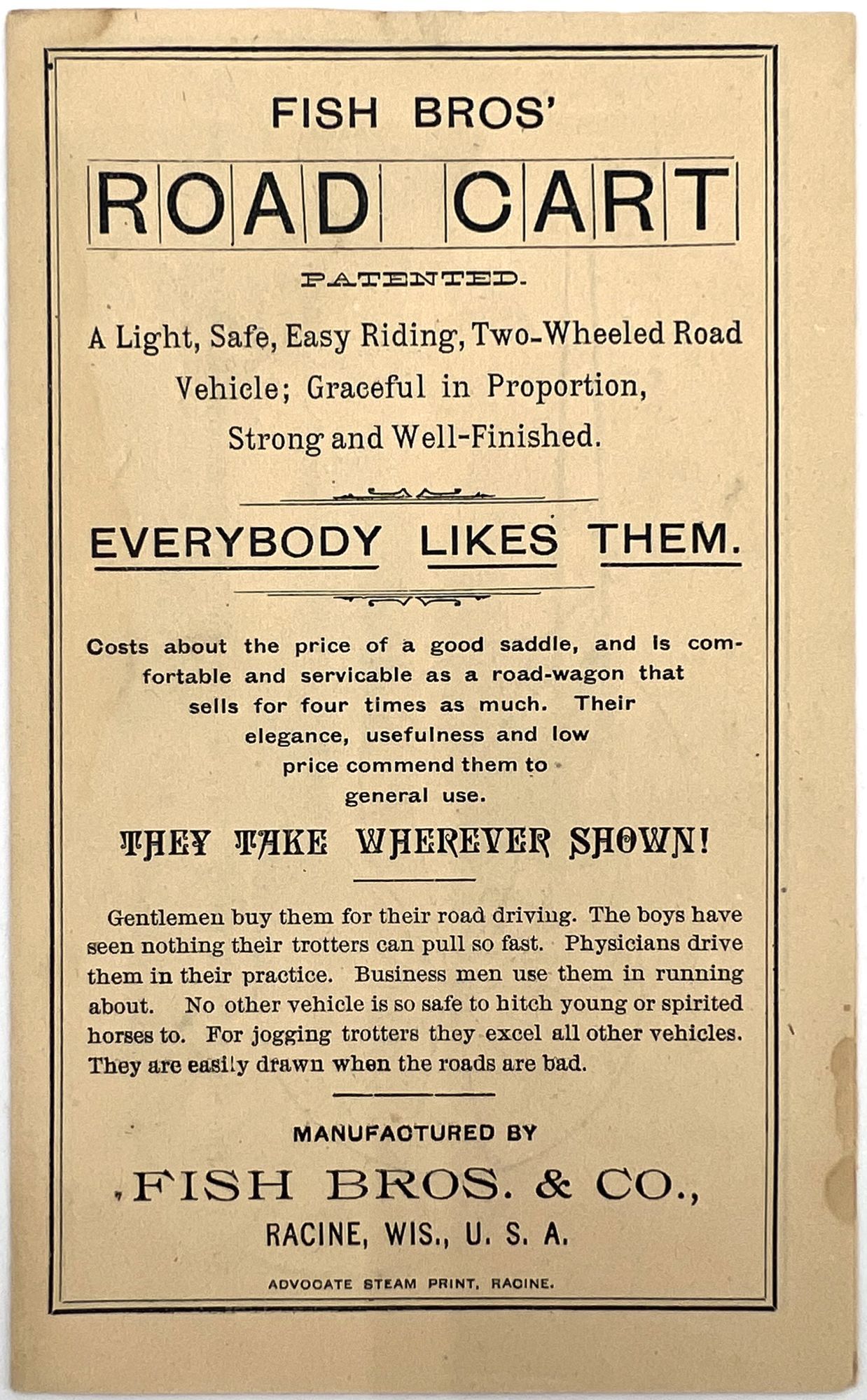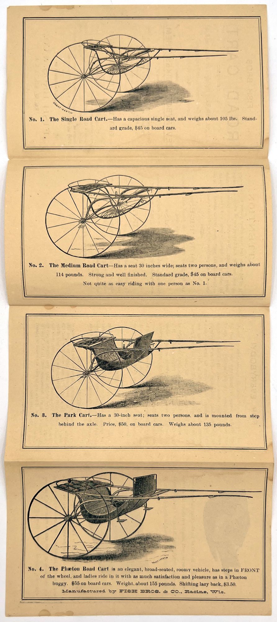 Racine, Wisconsin: Fish Bros. & Co, 1890. Folded advertising pamphlet for the Fish Bros' Road Chart, a "Light, Safe, Easy Riding, Two-Wheeled Road Vehicle". Includes illustrations of four different models with pricing, weight, and capacity. Markets the "Phaeton Road Cart" by saying that "ladies ride in it with as much satisfaction and pleasure as in a Phaeton buggy". Notes that "Ladies and Children are safe from the danger of capsizing", marketing to families. Four-fold pamphlet (5.75" by 3.25" folded), illus.