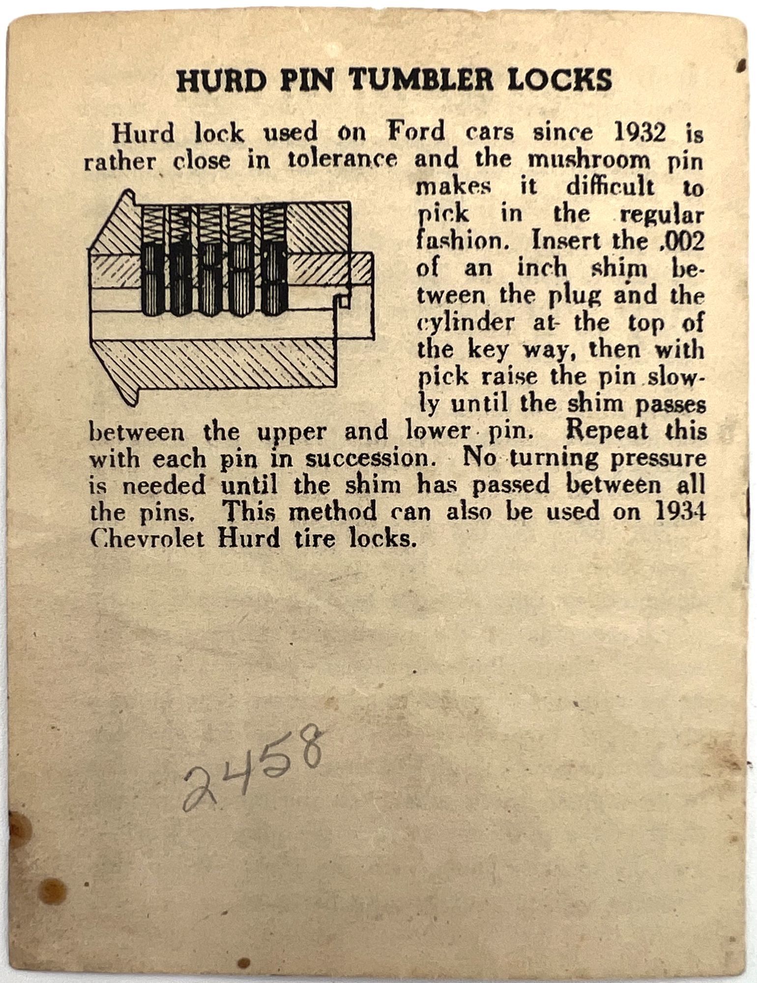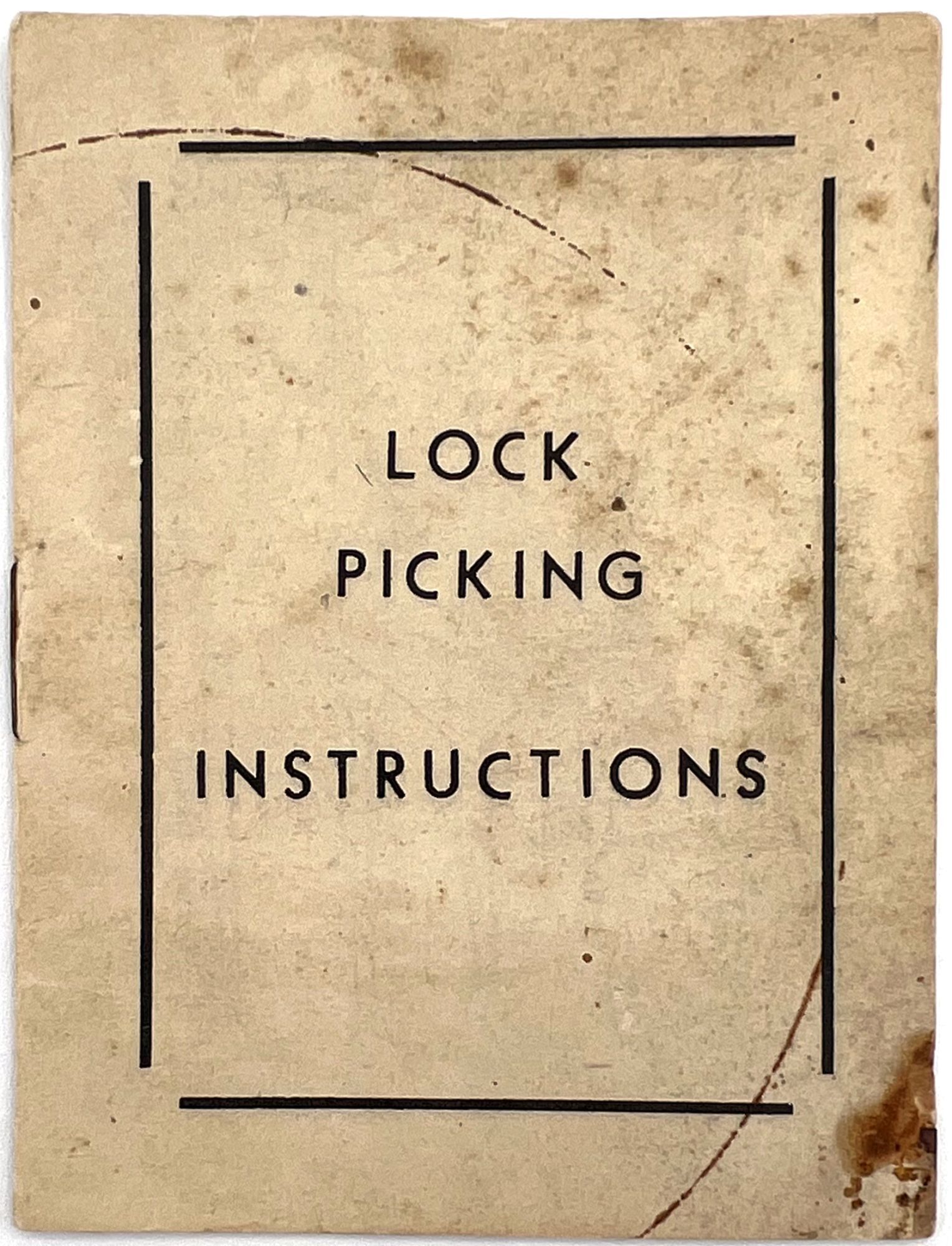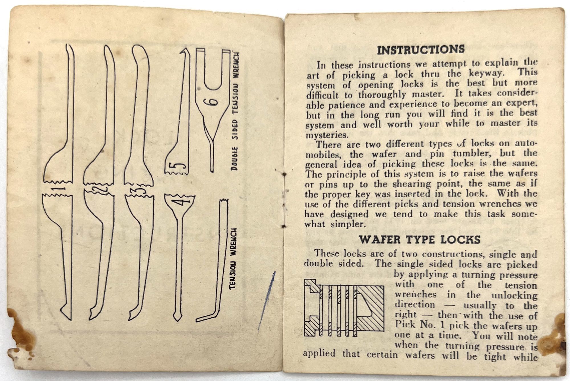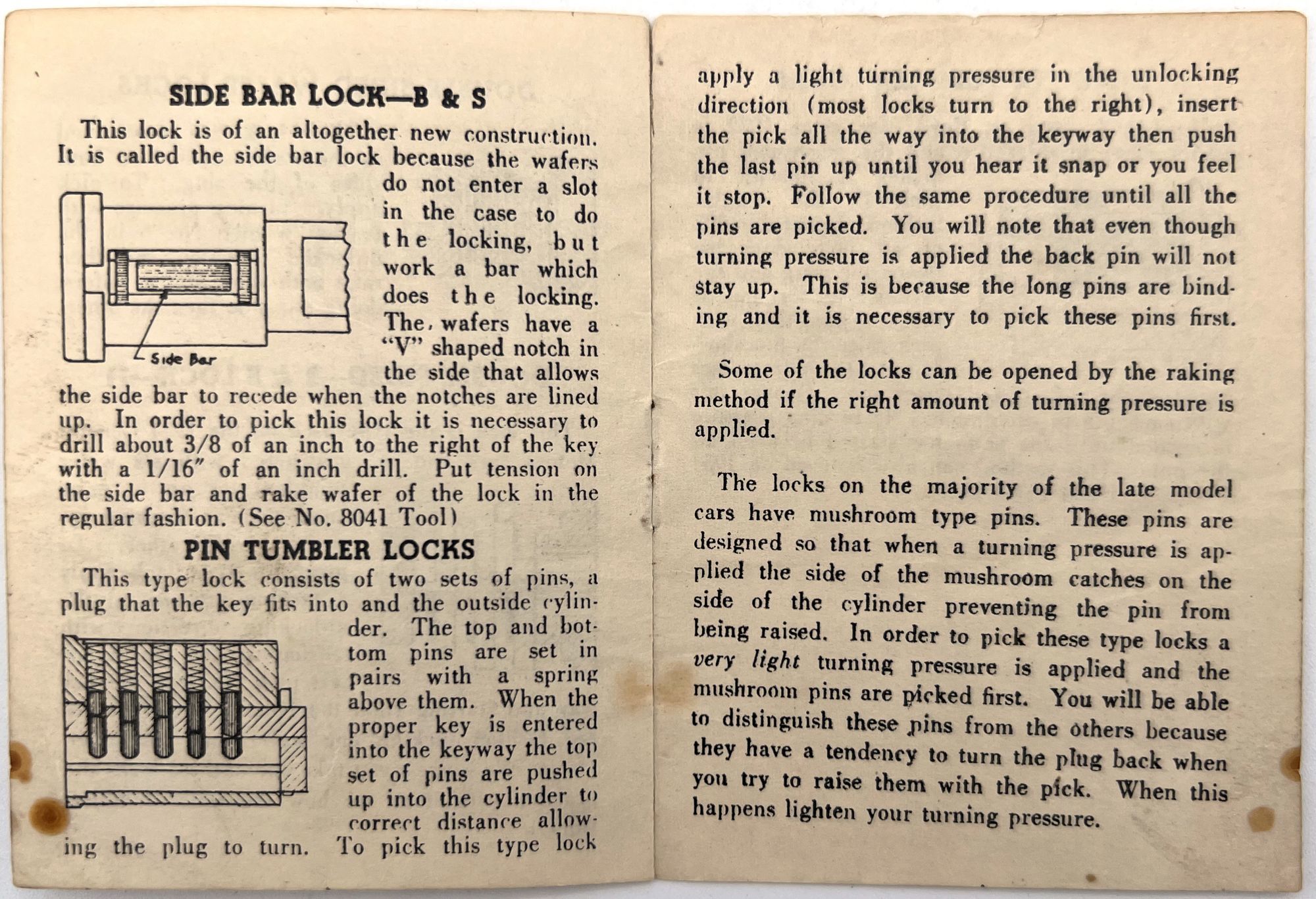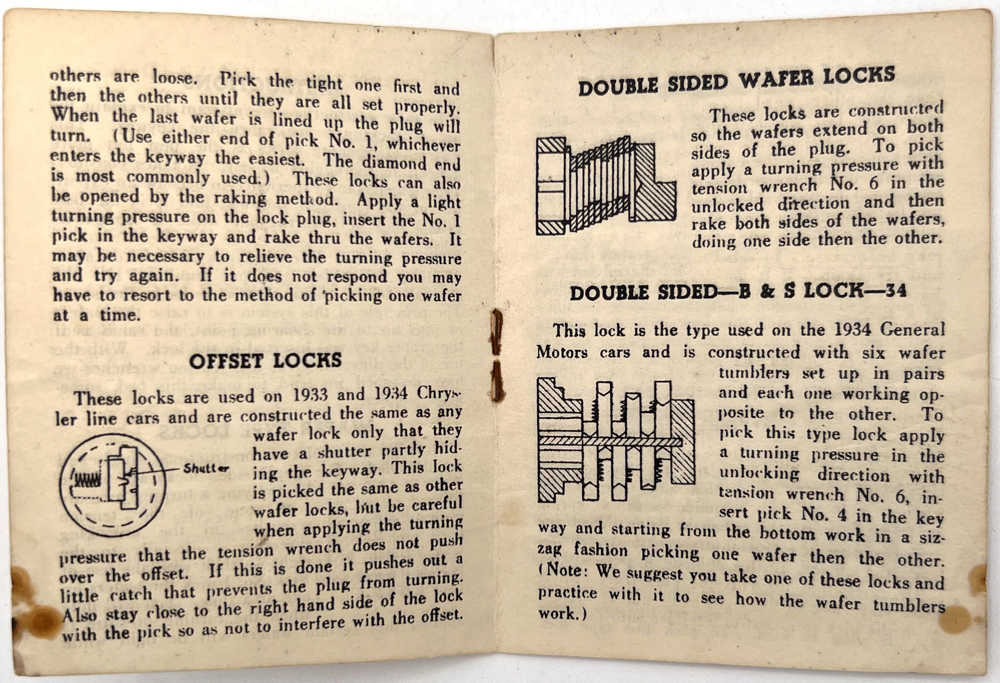 N.pl: N.p., 1935. Good. Toned, dust soiled, staining, a couple short tears. Rust staining from staple.. Detailed instructions for picking locks, printed in a handy pocket-sized format for portability. Includes diagrams and instructions for picking the following locks: Wafer Type Locks, Offset Locks, Double Sided Wafter Locks, Double Sided B&S Lock 34, Side Bar Lock B&S, Pin Tumbler Locks, Hurd Pin Tumbler Locks (used "on Ford cars since 1932"). Probably published for locksmiths, but it is much more amusing to think of this in the pocket of a burglar. Single vol. (4" by 3"), pp. [8], illus.