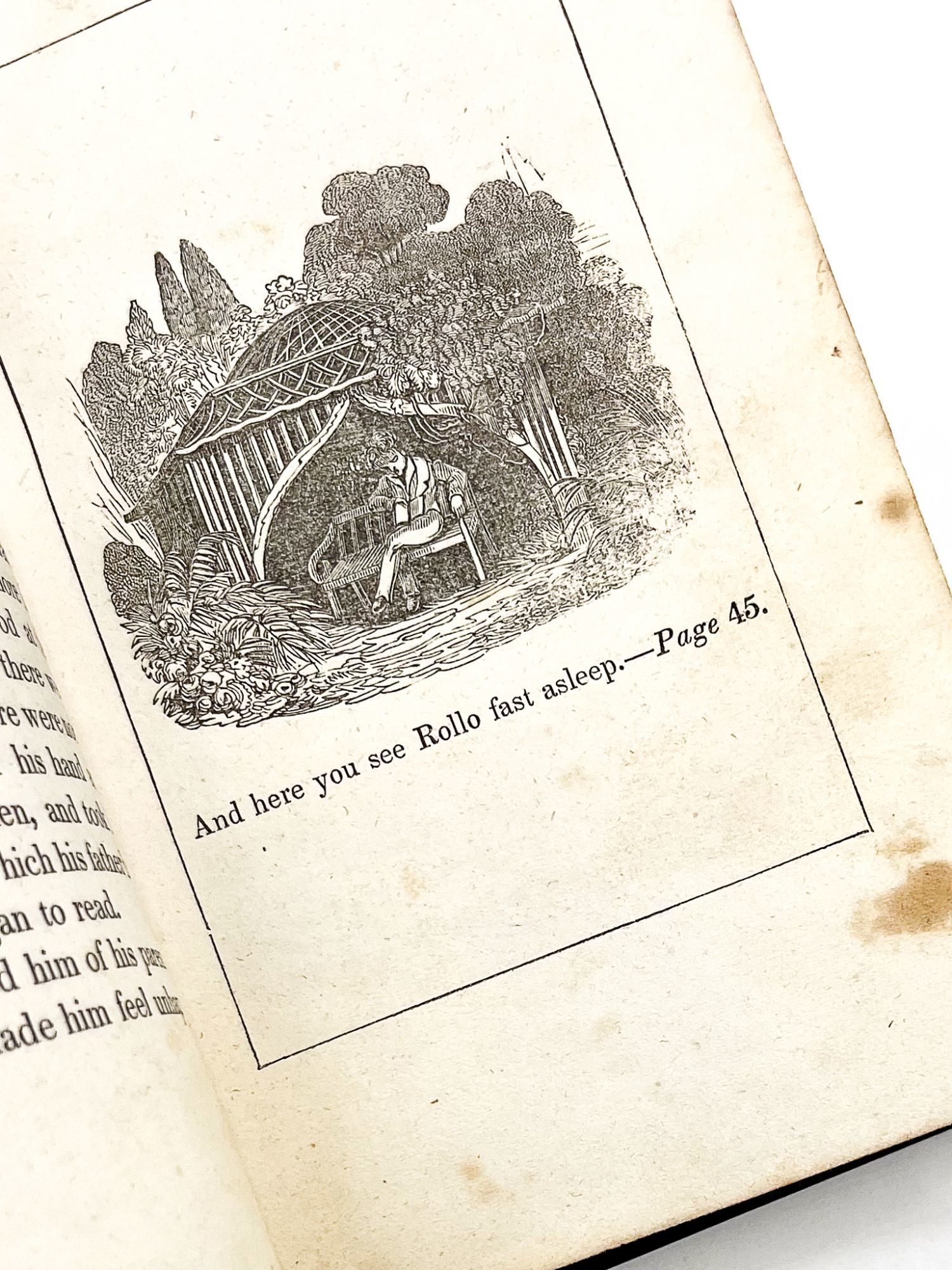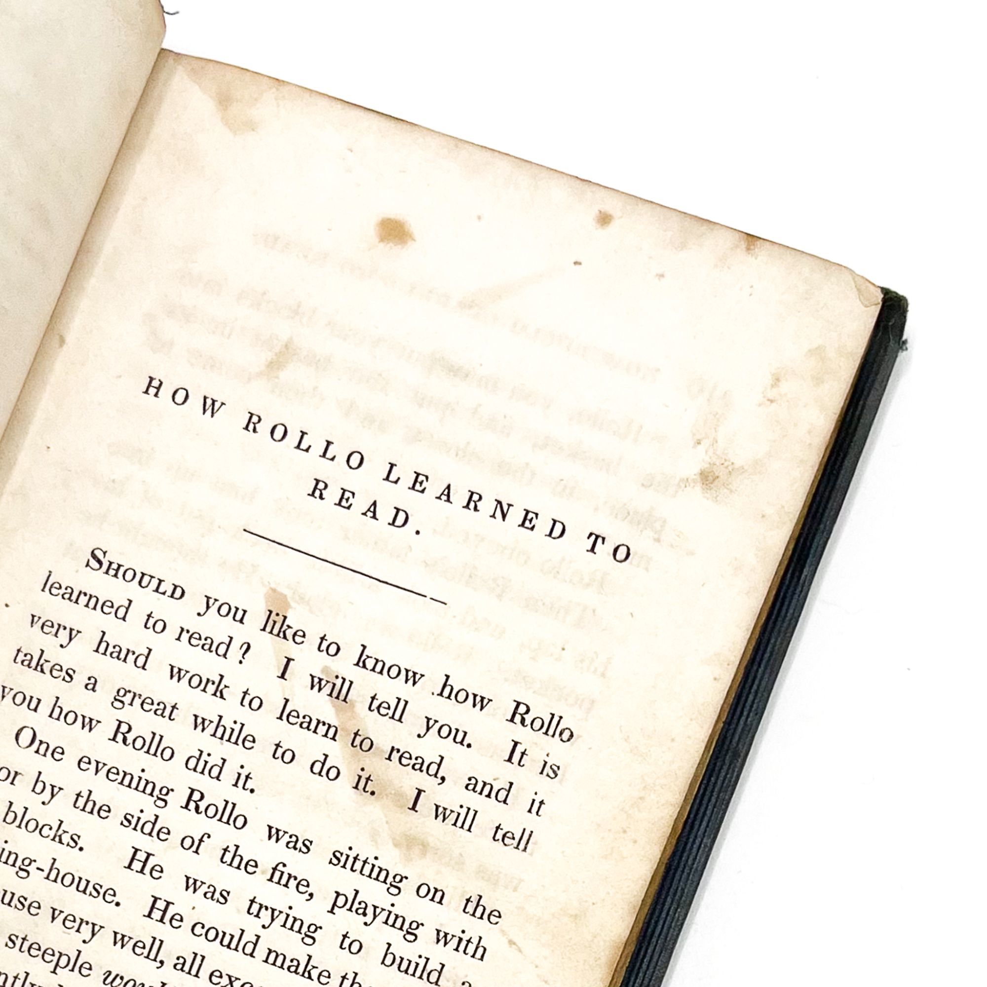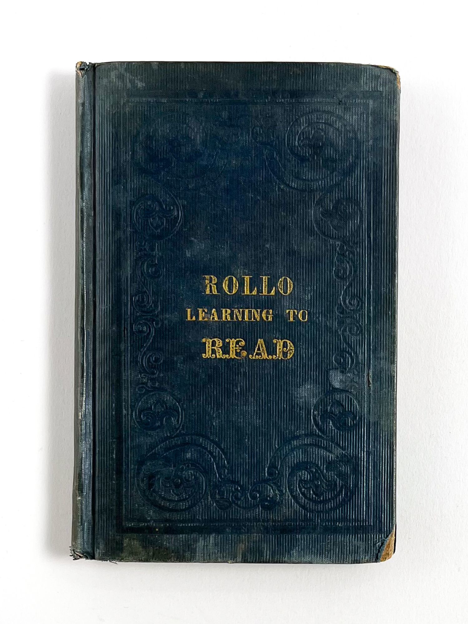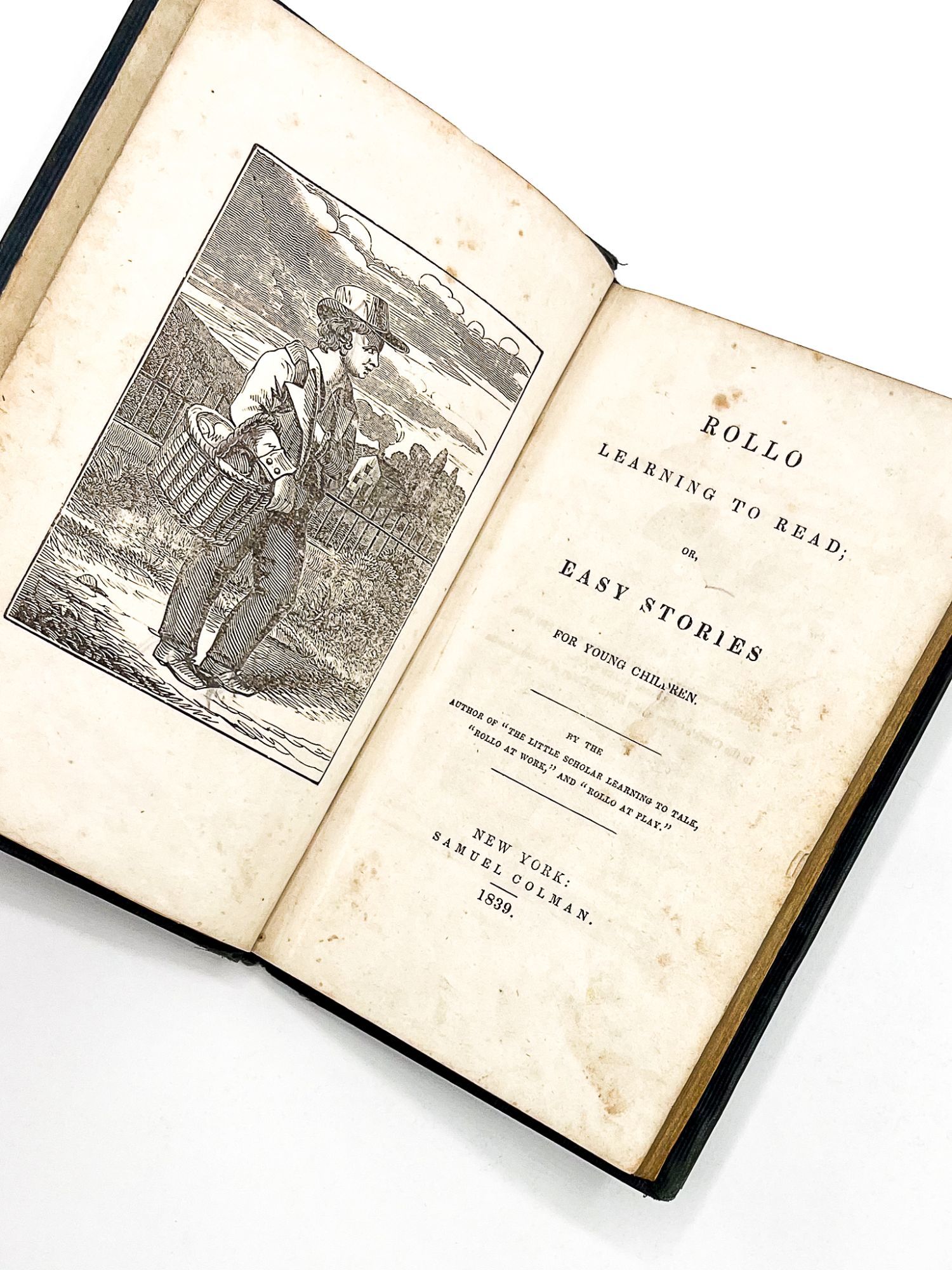 New York: Samuel Colman, 1839. Very good.. Early edition of the book that made the Rollo series big, intended to instruct the novice American reader by combining a mature vocabulary with a lively series of animal metamorphoses and moral lessons. The hapless and ungrateful Rollo made his first cameo appearance in the rare THE LITTLE SCHOLAR LEARNING TO TALK: A Picture Book for Rollo, by His Father, reissued in 1839 as ROLLO LEARNING TO TALK. ROLLO LEARNING TO READ is thus technically the second Rollo book, but the first "devoted wholly to Rollo" (Blanck) and is the title responsible for the series's popularity and influence. 6.25'' x 4''. Original gilt-lettered blind-stamped green cloth. Illustrated with black and white frontispiece and full-page wood engravings. 180 pages. Moderate edgewear and scuffing to boards, sometimes exposing bits of board. Pencil to front free endpaper. Mild foxing throughout.