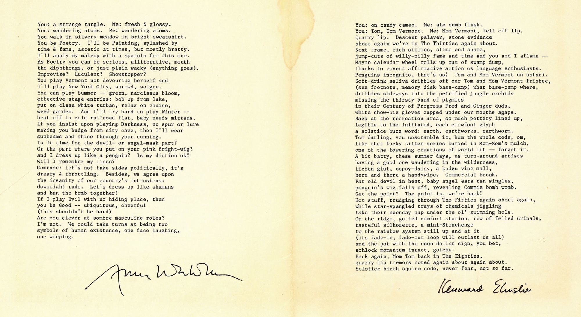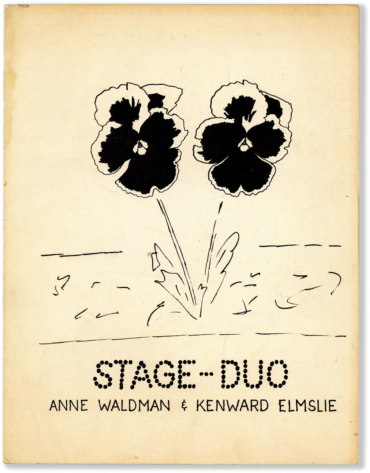Cherry Valley, NY: Rocky Ledge Cottage Editions, 1983. First Edition. Single sheet, card stock, folded to 8 1/2 x 11 inches; 4pp. "Written for the occasion of a reading by Anne Waldman & Kenward Elmslie at the Savoy theatre in Montpelier, Vermont, on August 28, 1983." Signed by Waldman and Elmslie at their contributions and by Elmslie's partner Joe Brainard who contributes the cover decoration. Lovely little known somewhat ephemeral piece. The Savoy which continues to show foreign and indy films in the VT Capitol is just a few miles from the Elmslie home, then home to Z Press, in Poets Corner (Cabot) where a number of literary figures spend their summers. A good copy with stainingto spine area and off-setting to the rear panel (cover is very good).