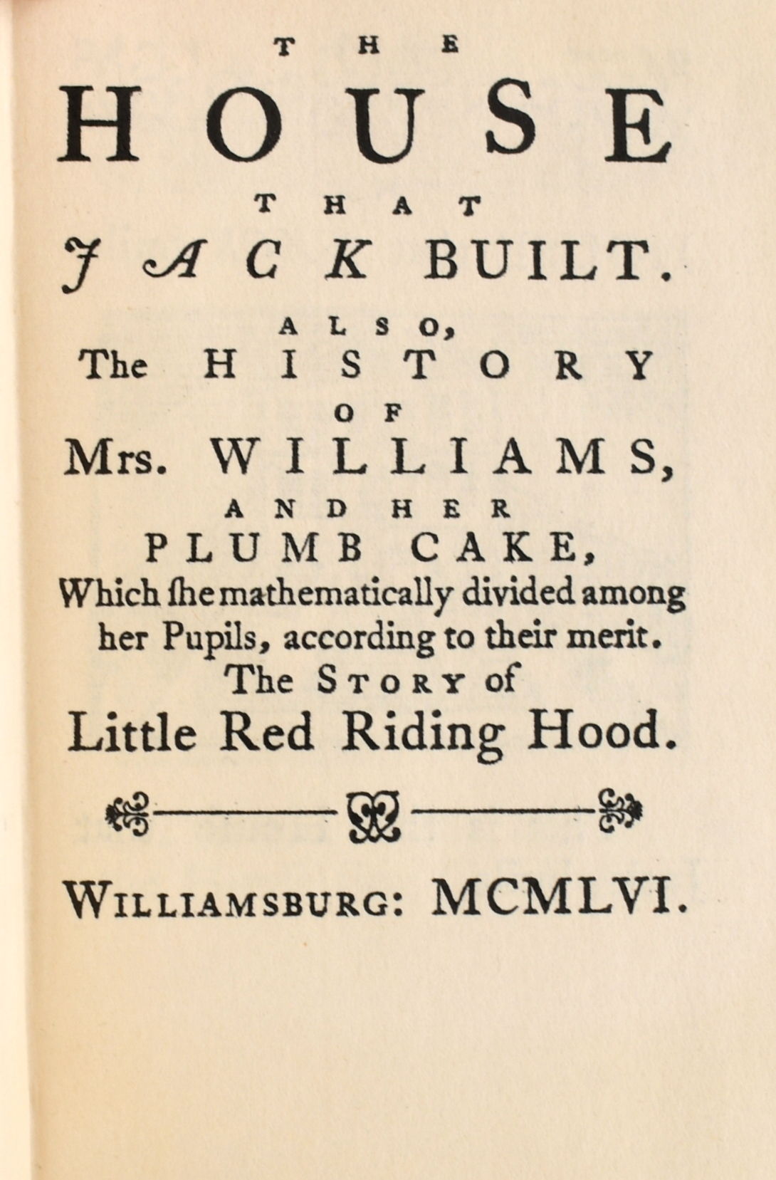 [CHILDREN] THE HOUSE THAT JACK BUILT. ALSO, THE HISTORY OF MRS. WILLIAMS, AND HER PLUMB CAKE. WHICH SHE MATHEMATICALLY DIVIDED AMONG HER PUPILS, ACCORDING TO THEIR MERIT. THE STORY OF LITTLE RED RIDING HOOD