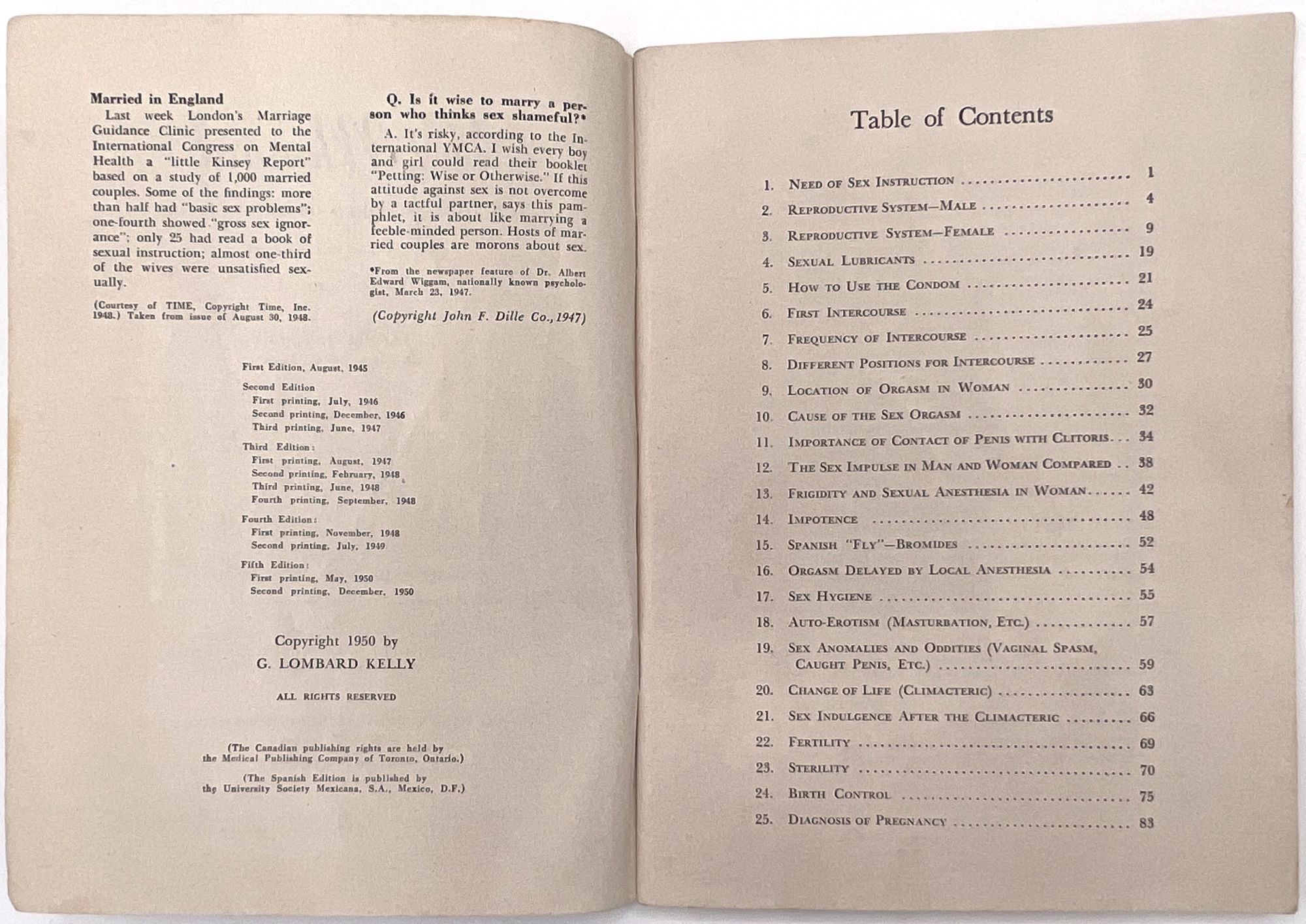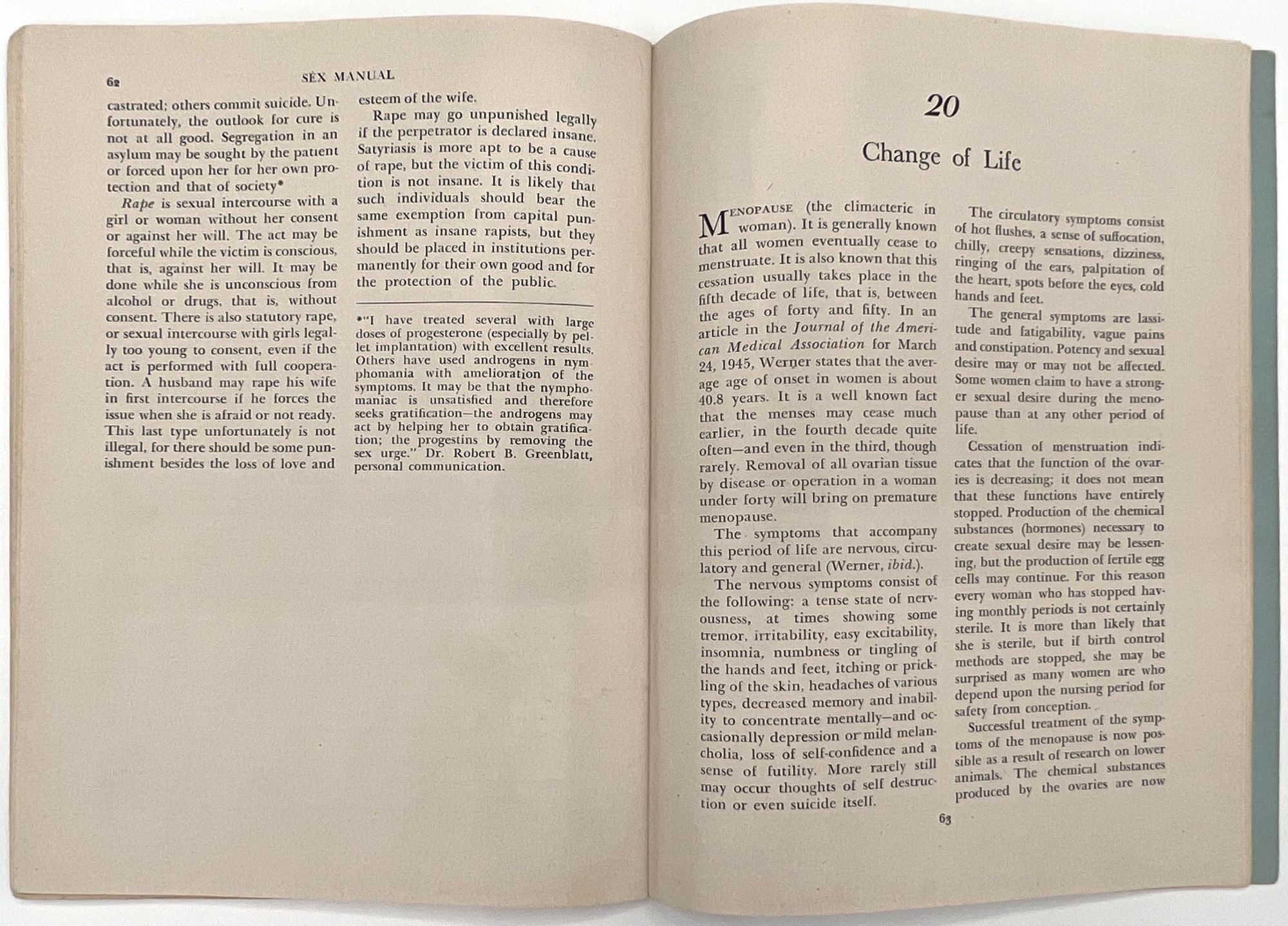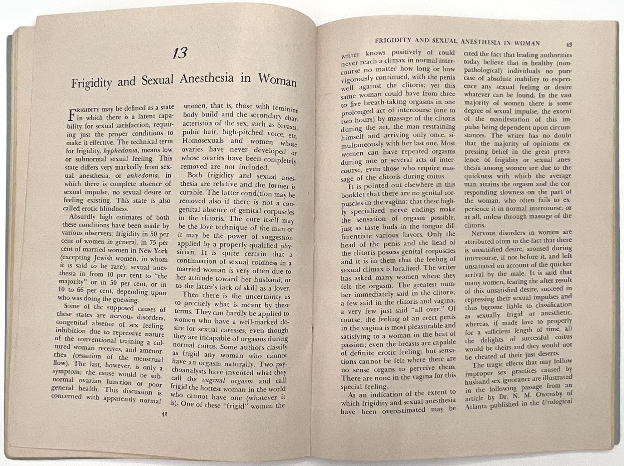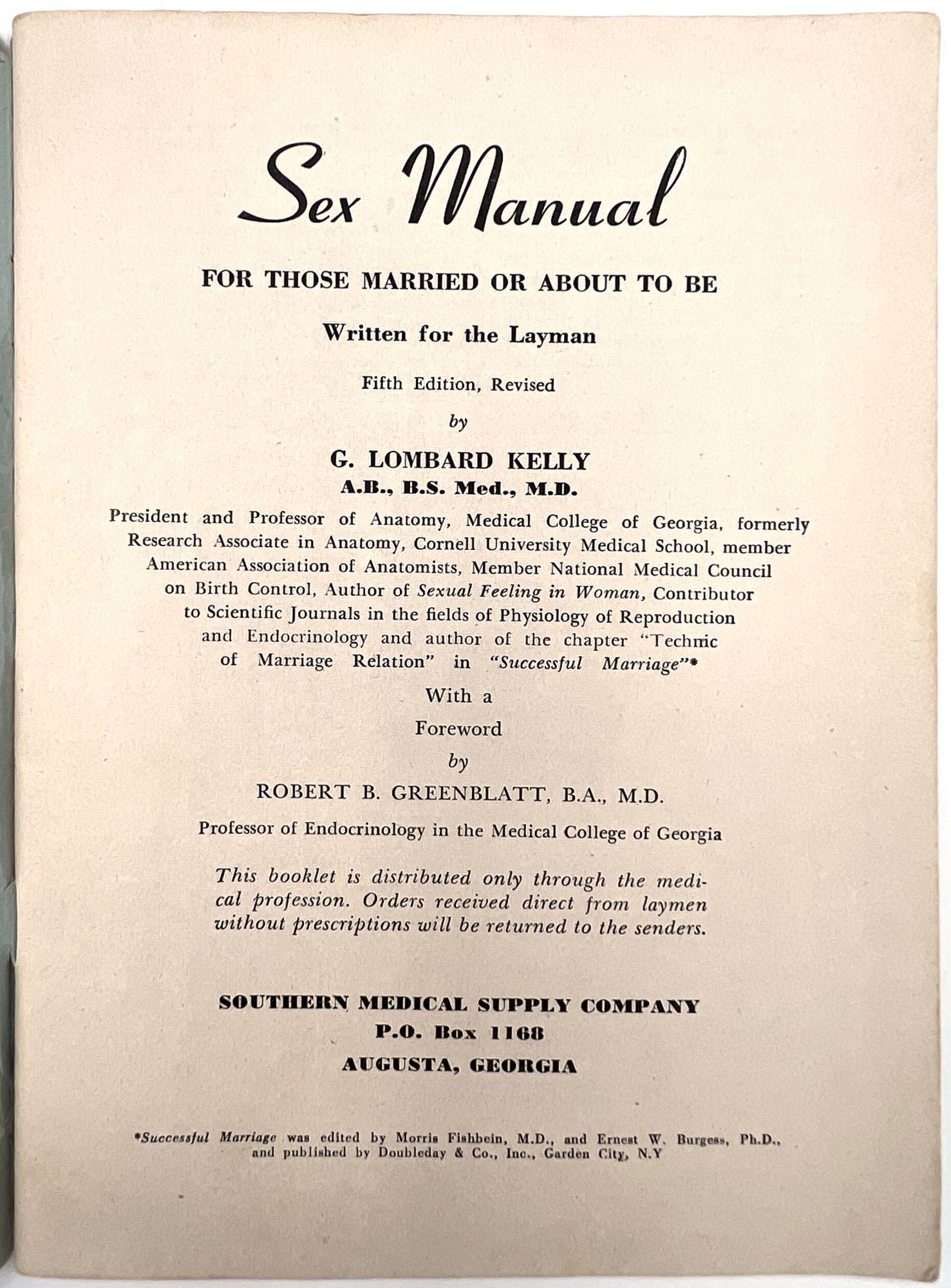 Augusta, Georgia: Southern Medical Supply Company, 1950. Very good. Some light toning, dust soiling/staining. Spine sunned.. A 1950 sex education manual "Written for the Layman", i.e. the general public, from the point of view of physicians wishing to dispel harmful sex myths. Covers a wide range of topics, including: male and female reproductive anatomy; intercourse, including different sex positions and using condoms; orgasm and the importance of the clitoris for female pleasure; "frigidity" in women; sex hygiene; fertility and sterility; birth control; pregnancy; and masturbation. Also includes a chapter on "sex anomalies and oddities" which in this publication include pain in sex, nymphomania, and rape. Describes nymphomaniacs as women suffering from a nervous disorder who "beg to be castrated" or "commit suicide" as a "cure" for the condition is elusive (pp. 61-2).