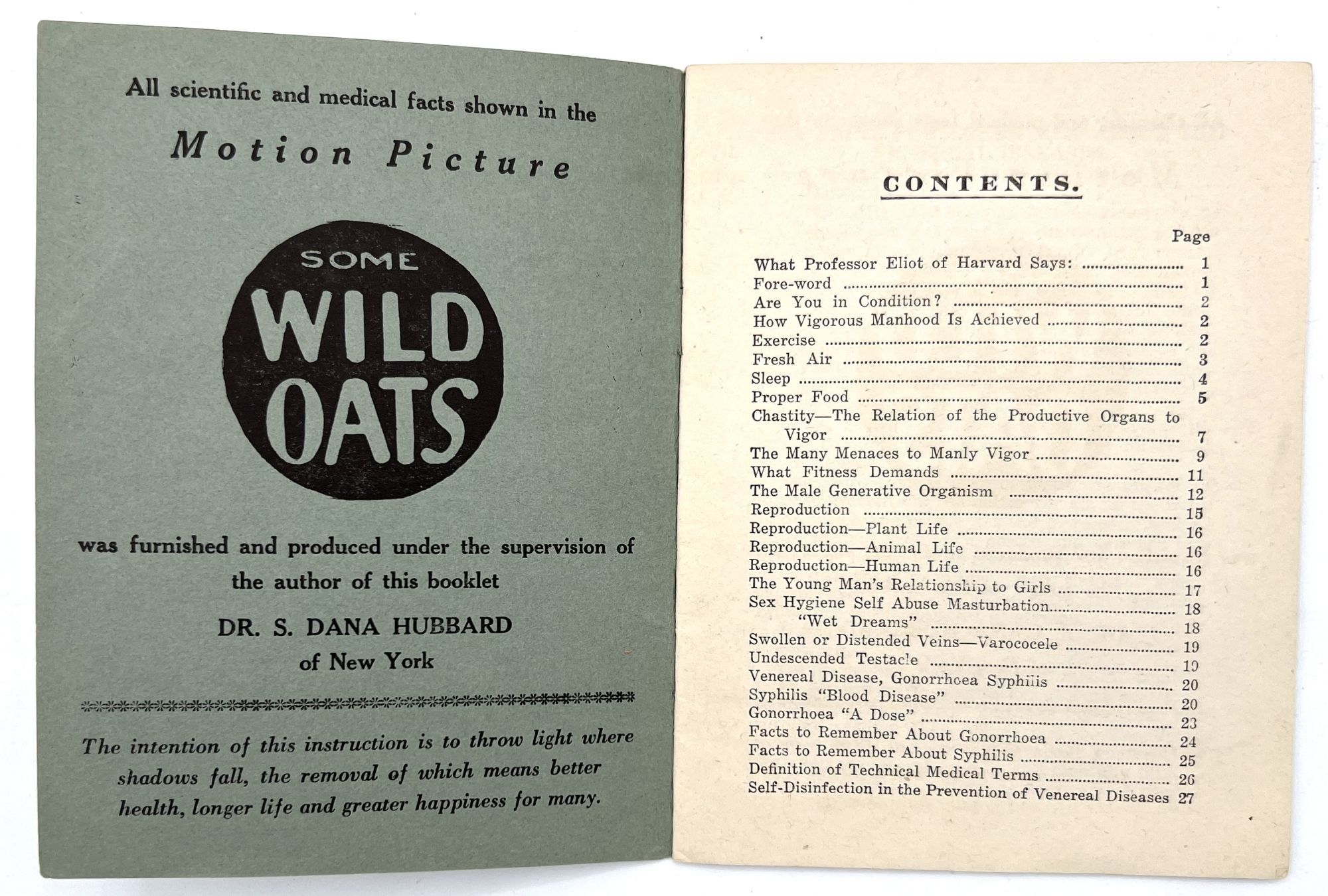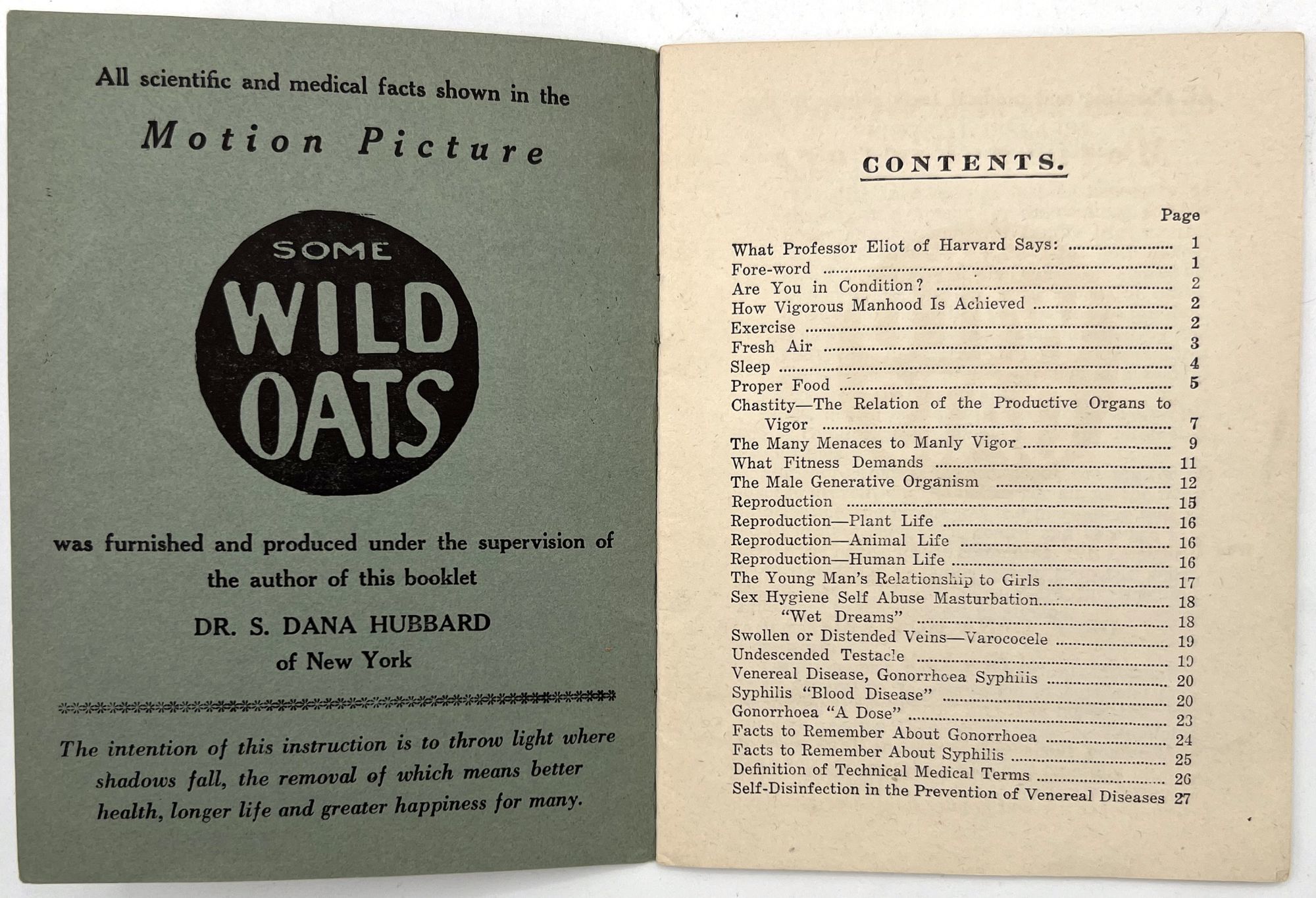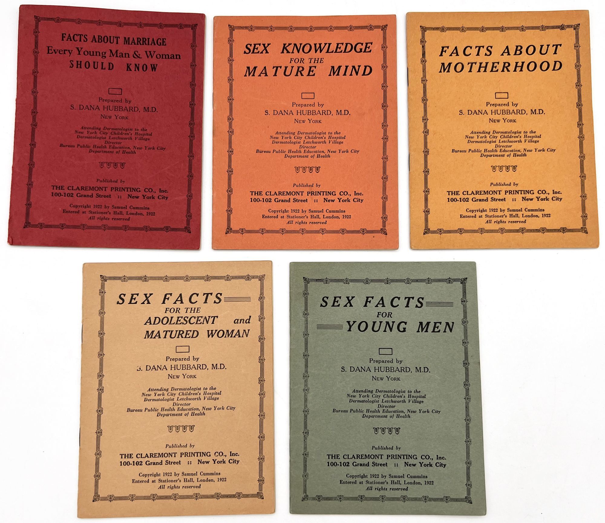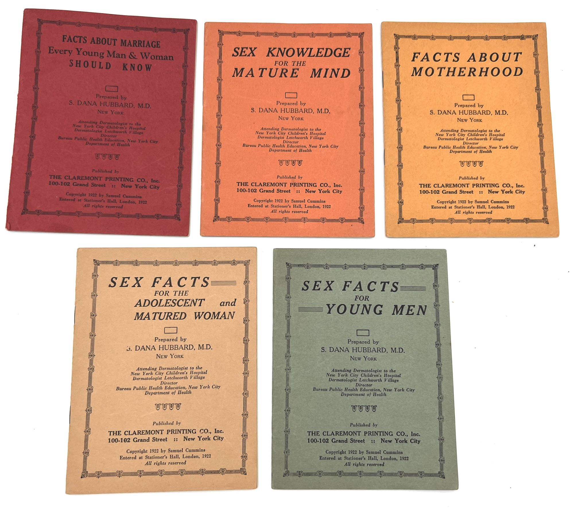 New York, New York: The Claremont Printing Co., Inc, 1922. Very good. Some toning.. A set of five (5) sex education booklets published by the physician S. Dana Hubbard in 1922, with the aim of educating young Americans in sex, love, and marriage. Provides an important view into the sex education available to the general public in the 1920s, and interesting to see what advice has (or has not) held up over time. Note the inclusion of patriotic rhetoric, aligning sexual health and virtue with patriotic duty (e.g. "Help Your Country Produce a Healthy Strong People"). An open dialogue between parents and children regarding sex is advocated by the author. Some representative chapter titles from the booklets include: "Why Girls Are the Home Makers"; "Signs of Pregnancy"; "How Can a Person Avoid the Venereal Diseases?"; "The Working Girl"; "Automobile 'He-Vamps' and Taxi Driver White Slavers"; "How Vigorous Manhood is Achieved"; "Sex Hygiene, Self Abuse, Masturbation"; "The Un-Married Mother"; and "The Potential Prostitute". Also includes information about menopause, eugenics, infant care including breast feeding and bottle feeding, and how to avoid "whipping" children (i.e. spanking) in parenting. Prostitution, masturbation, and illegitimate birth are vilified throughout the publications. Advertises the early sex education films "Some Wild Oats" and "The Naked Truth".
