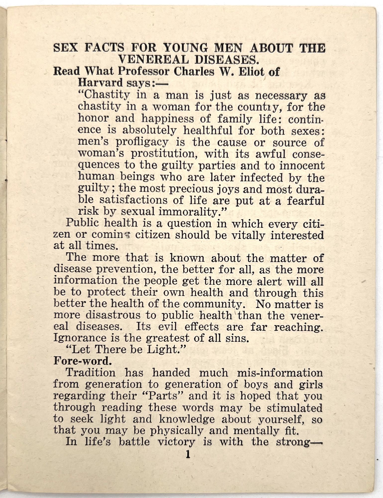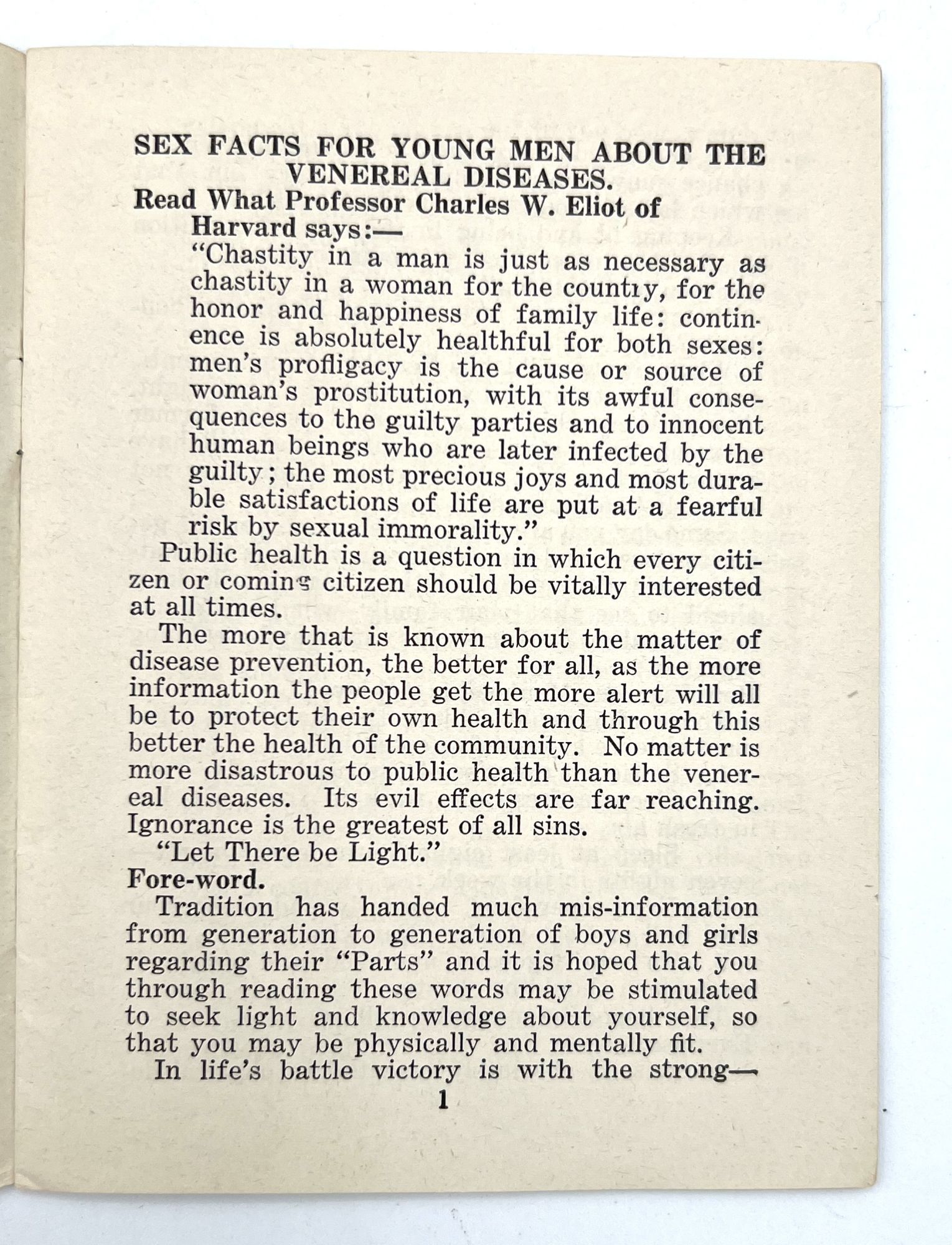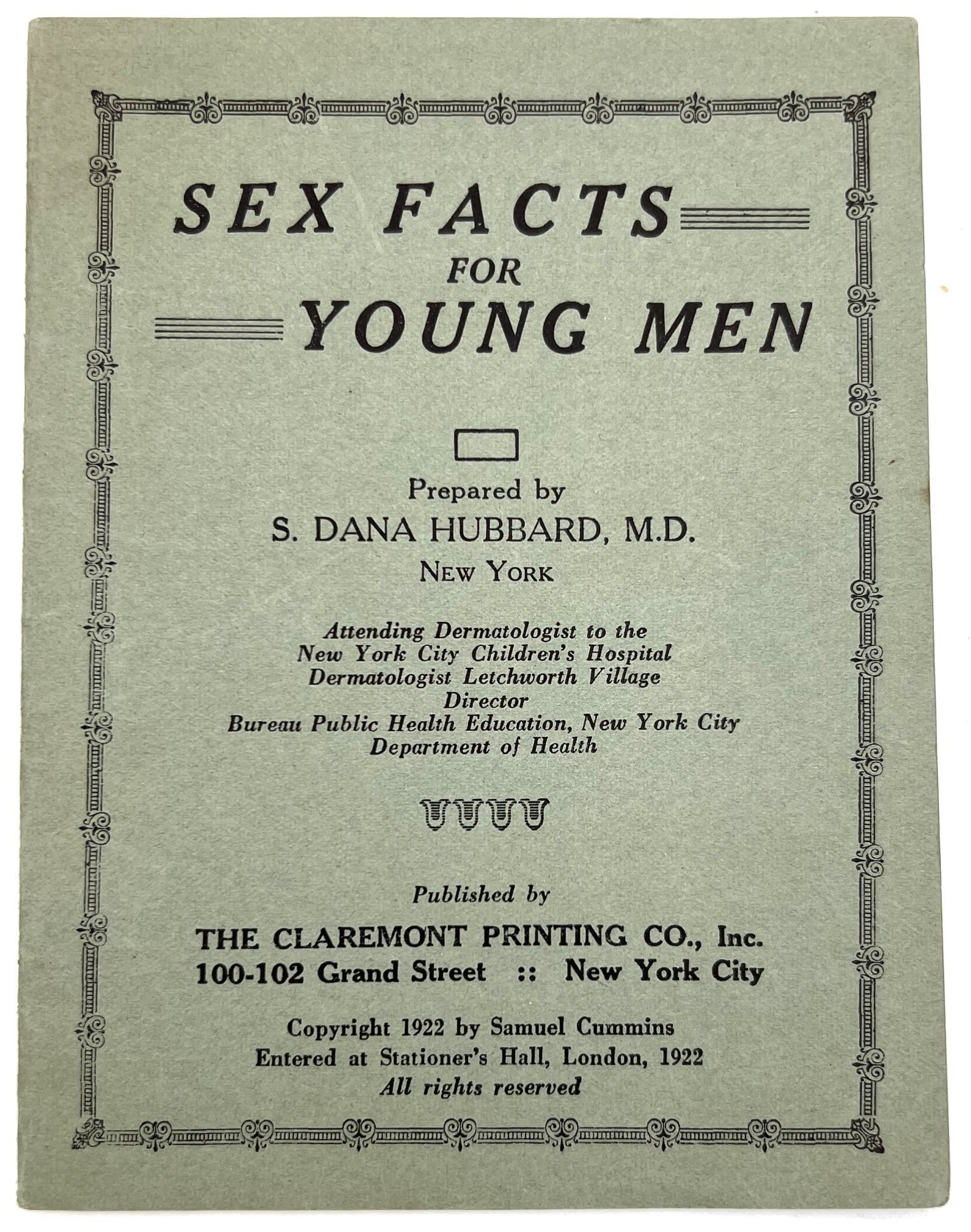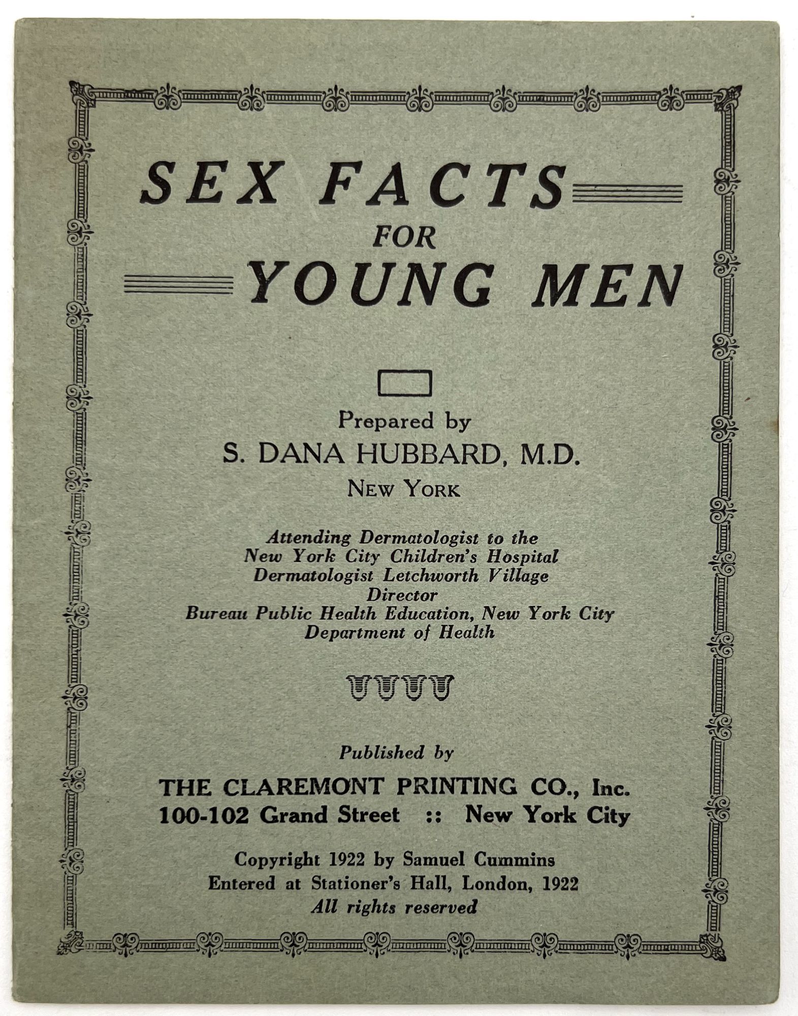 Hubbard, S. Dana. "Sex Facts for Young Men". New York: The Claremont Printing Co., Inc., 1922. Single vol. (6" by 4.5"), pp. 28, [2], stapled in original printed blue wrappers.