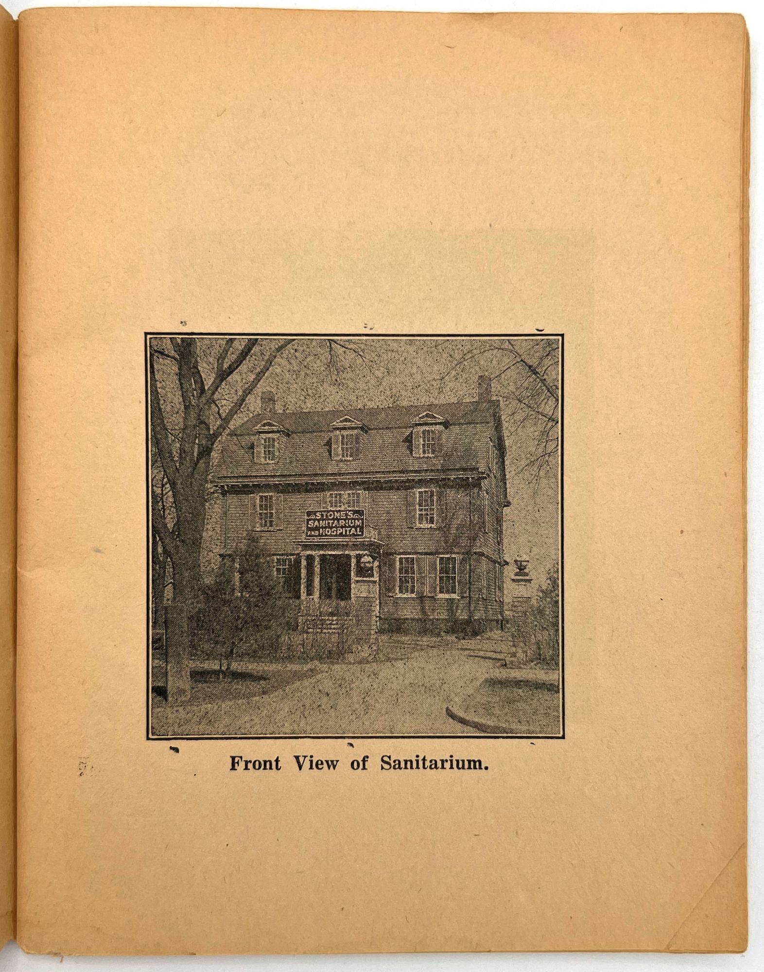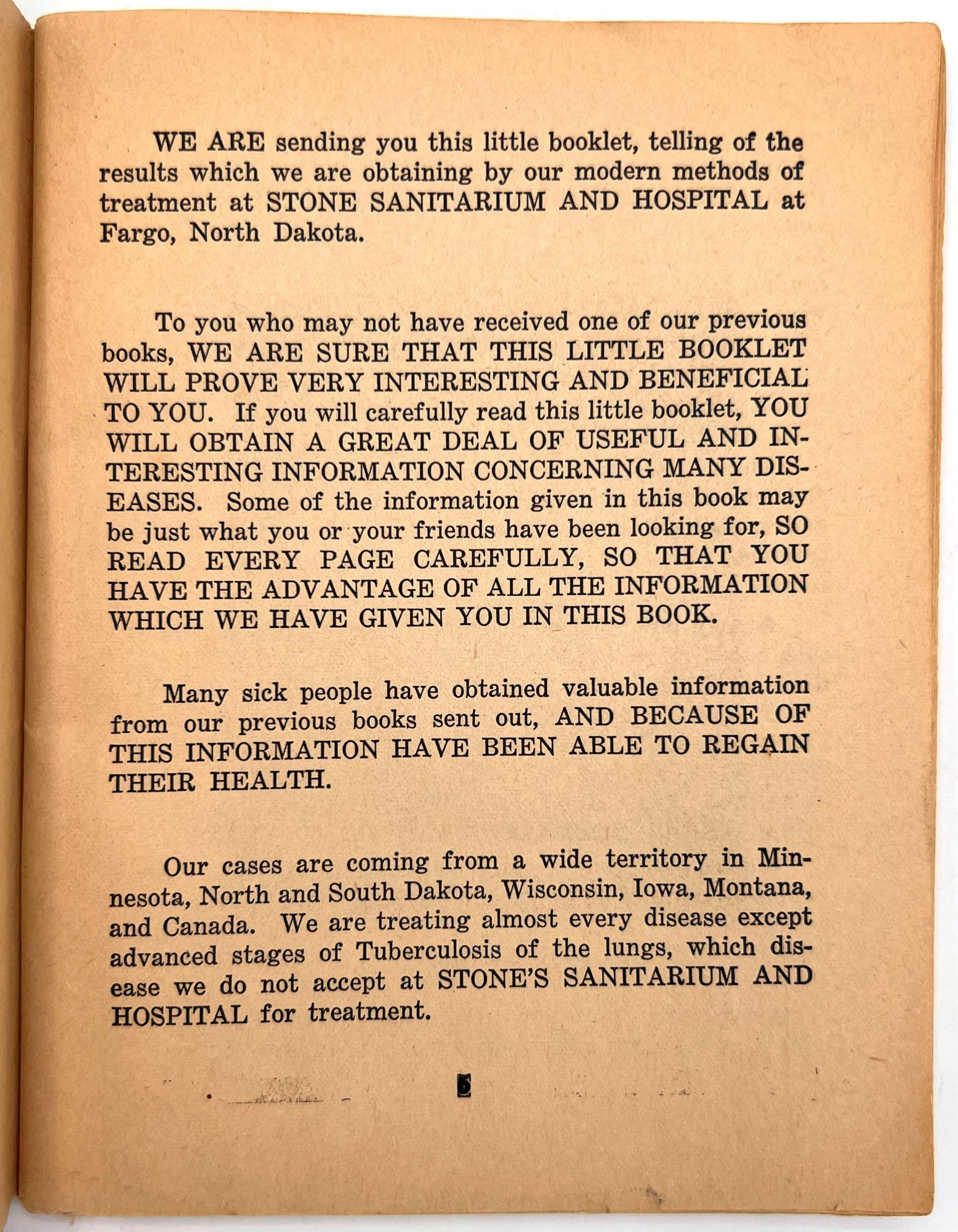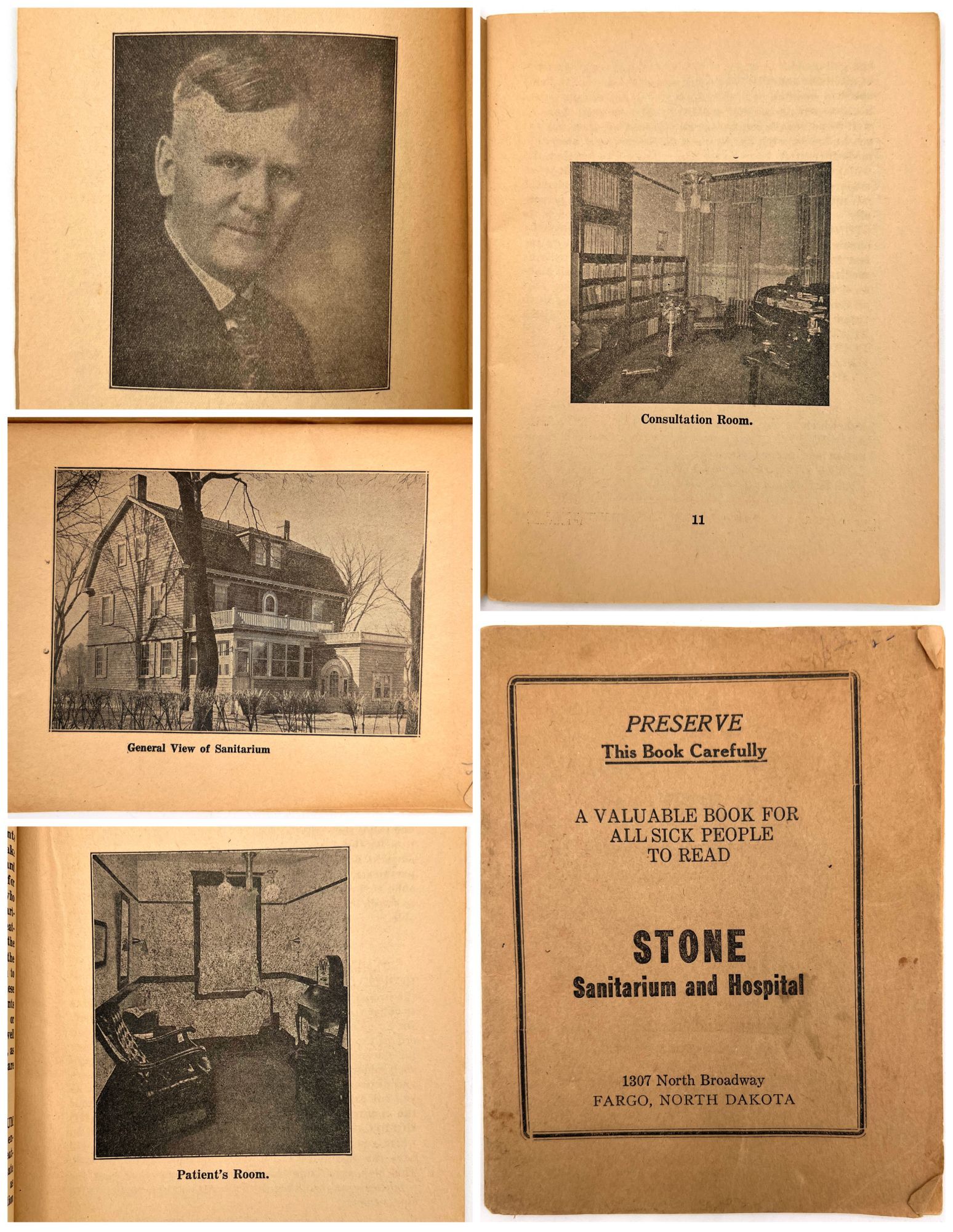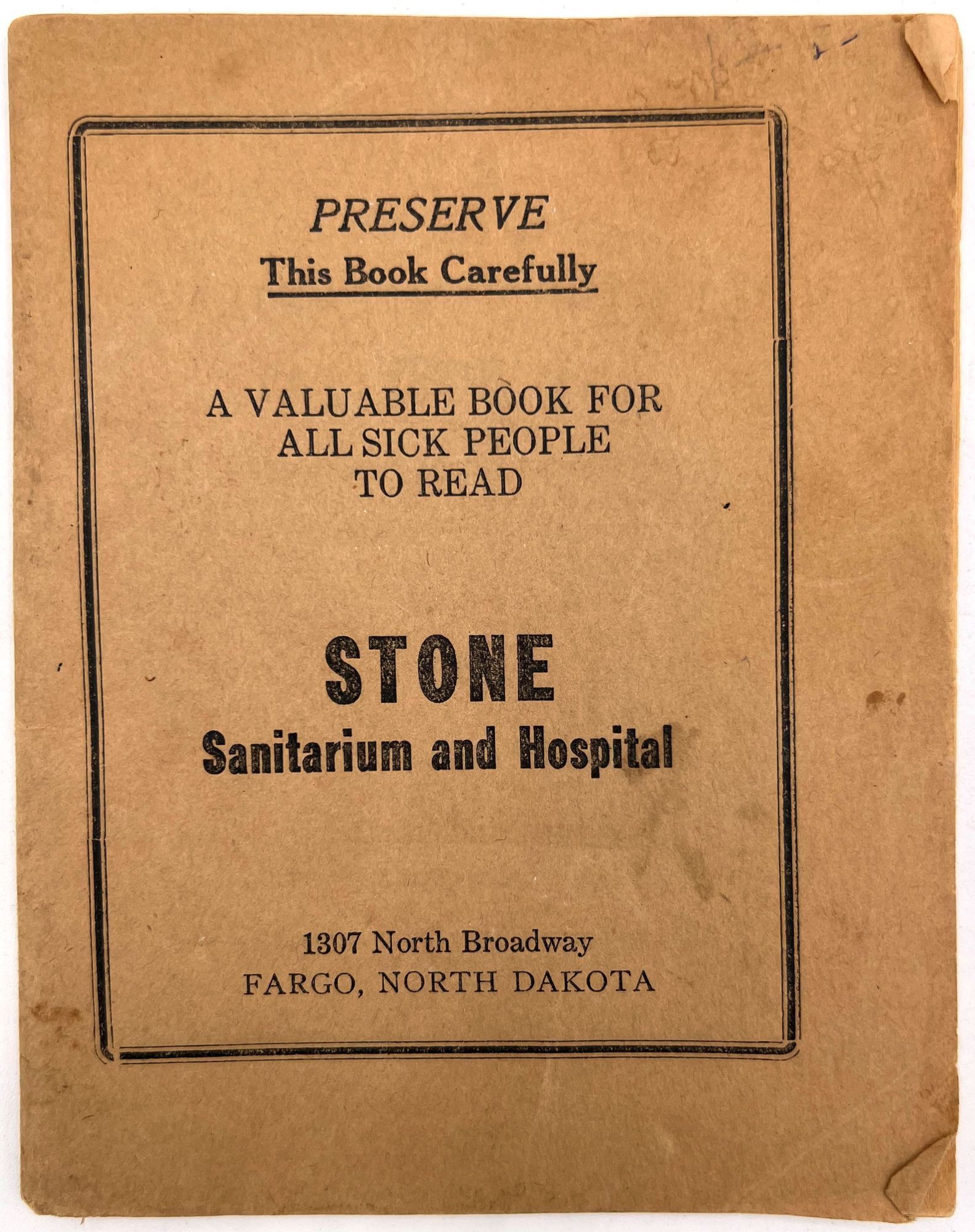 Fargo, North Dakota: Stone Sanitarium and Hospital, 1920. Very good. Paper toned and brittle. Chipping, minor staining/spotting.. A valuable book for all sick people to read", presented by the Stone Sanitarium and Hospital and its founder, Dr. Guy Stone. The illustrated booklet advertises the sanitarium as a haven for the chronically ill, treating and curing every disease from appendicitis and bowel troubles to kidney diseases and "female troubles" (p. 6). Each affliction is given a longer description and discussion in the rear. Includes interesting case studies that showcase the sanitorium's success, descriptions of each department, and ends with a call to action: "Why not take an inventory of yourself?" (p. 64). 12mo (6.75" by 5.25"), pp. 64, with photo-illustrations, sewn in original printed wrappers. Early ink to lower wrapper. Stone Sanitarium and Hospital was founded by Dr. Guy Stone after he purchased a residential property in Fargo circa 1920. It contained the following seven departments: non-surgical treatment; medical treatment; surgical; bath; X-Ray; prescription; and clinical.