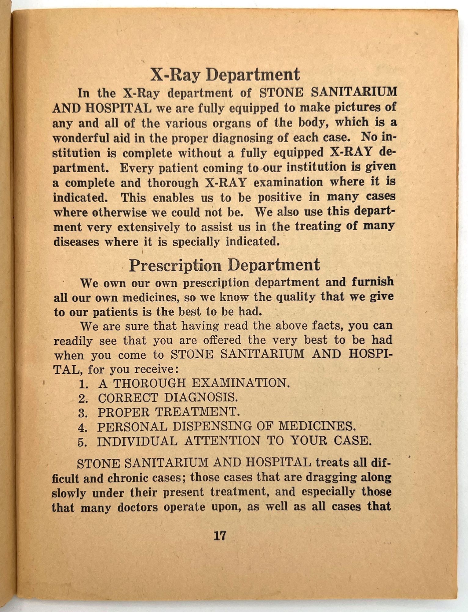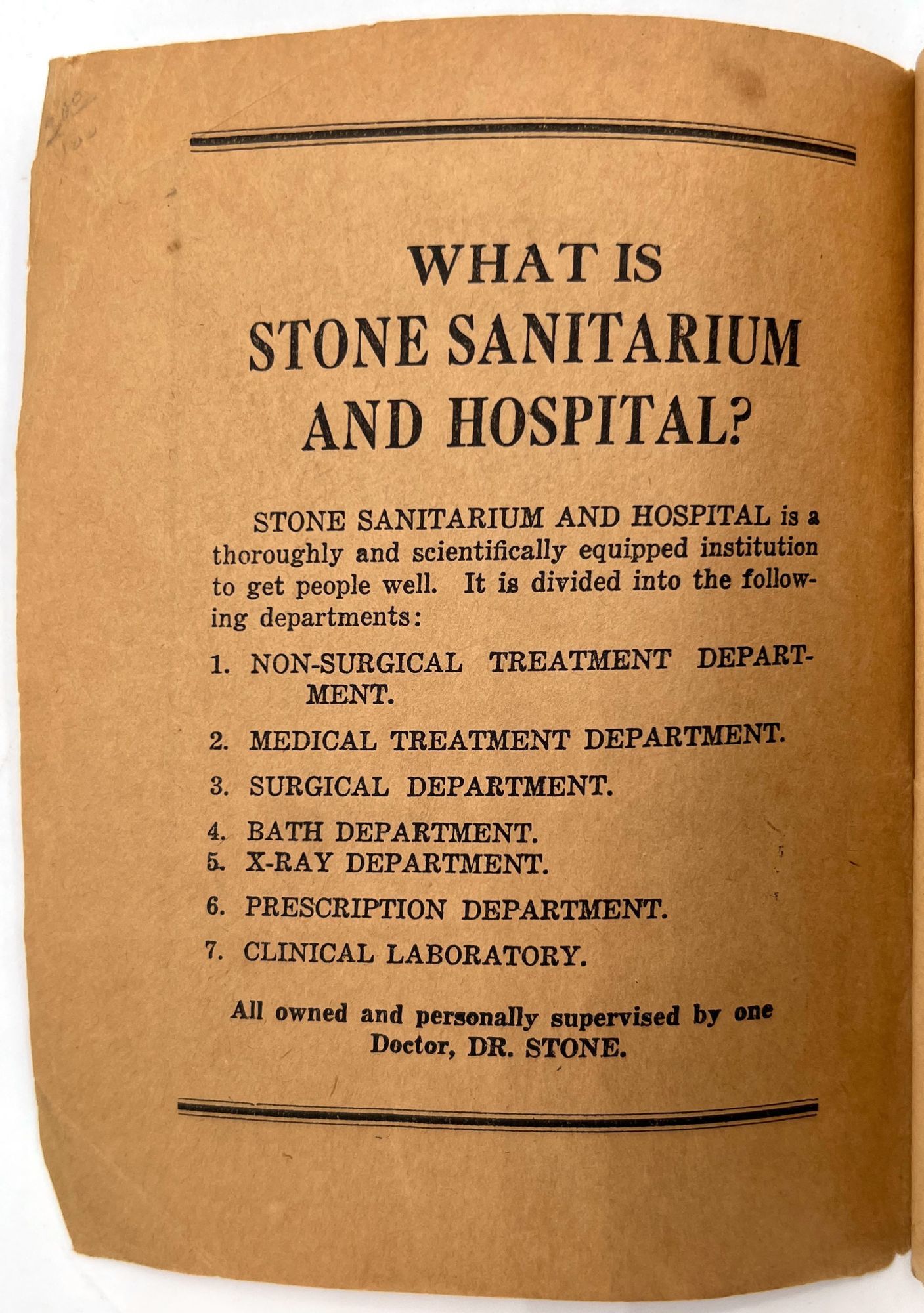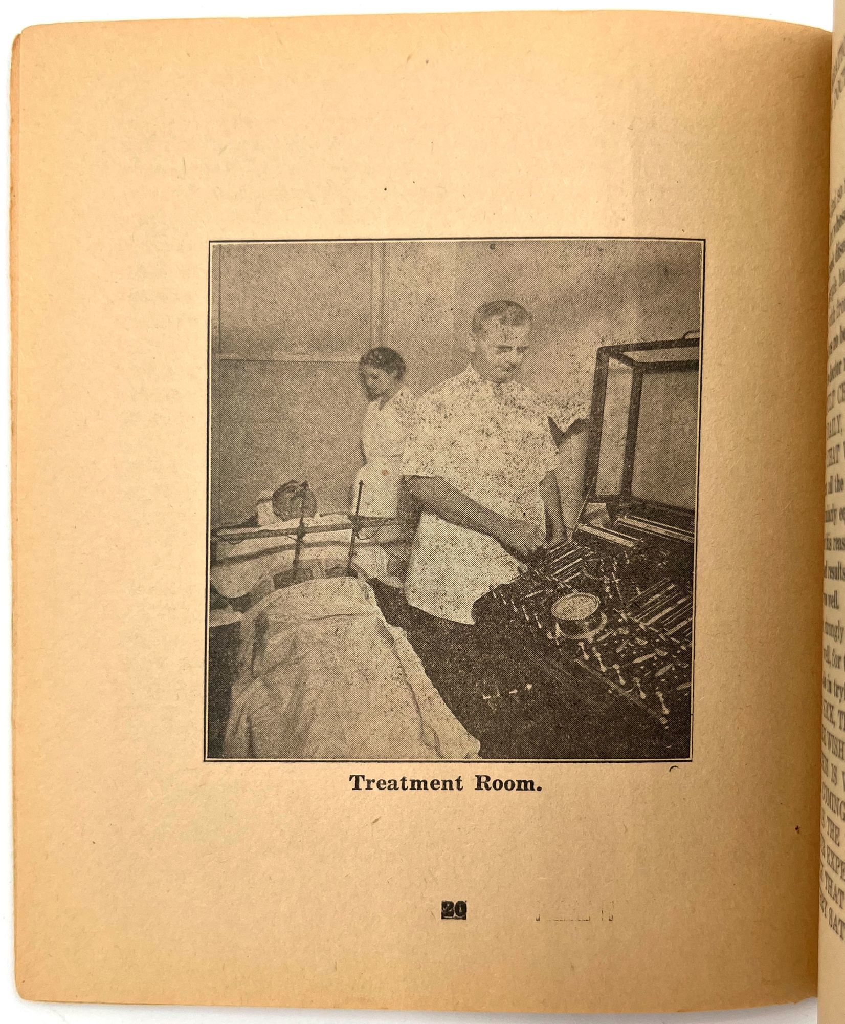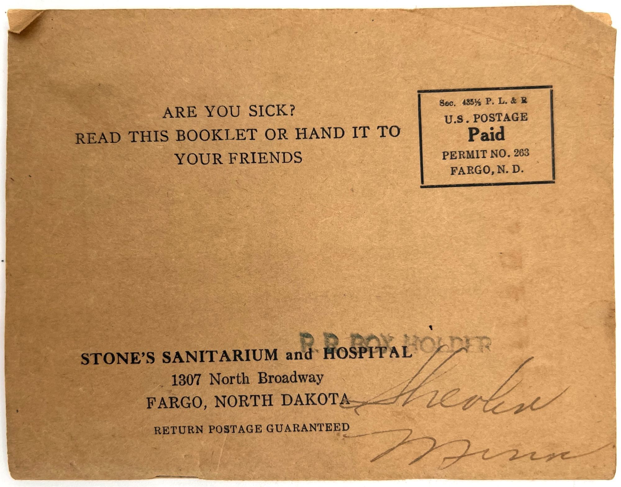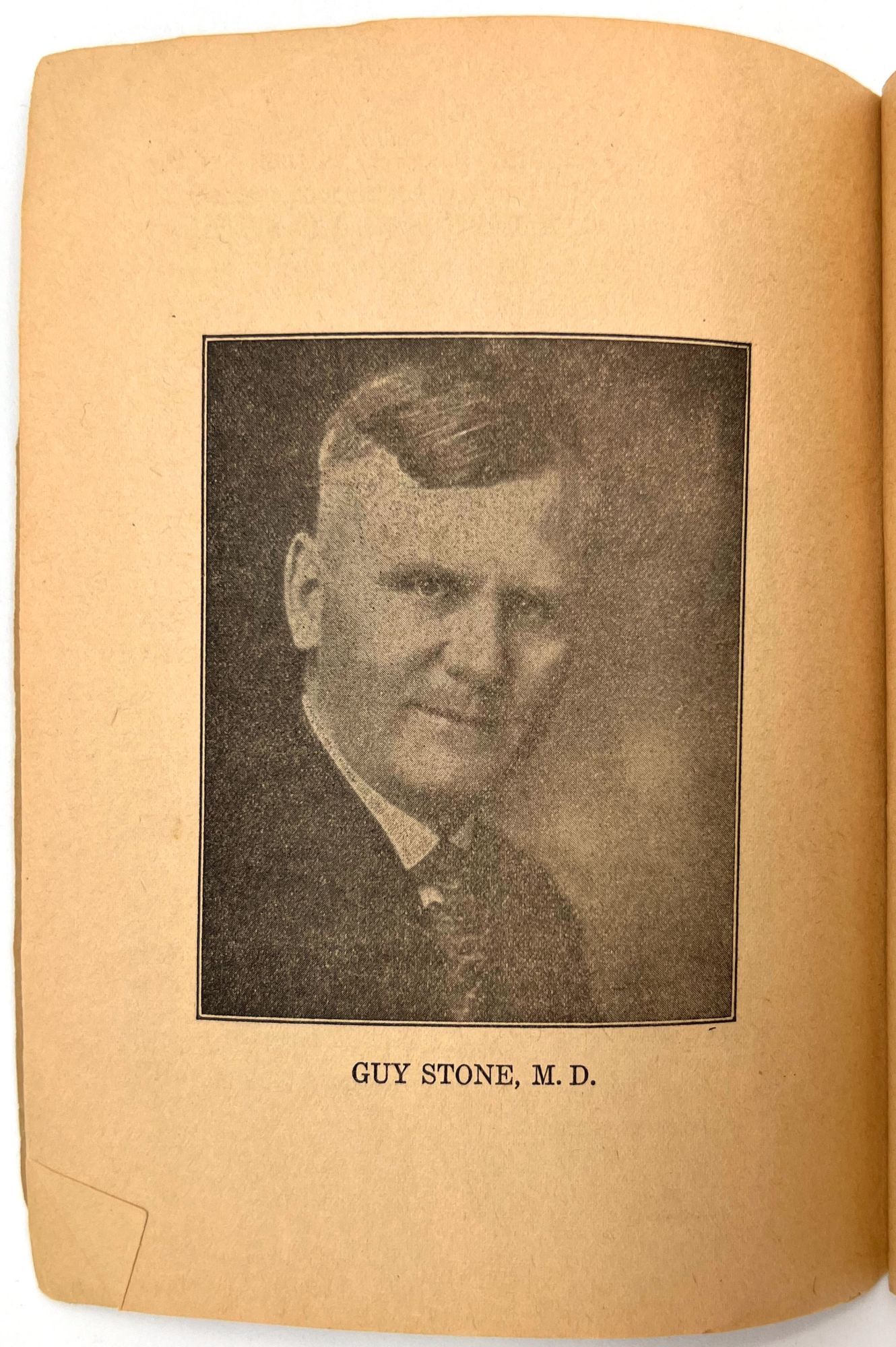 Fargo, North Dakota: Stone Sanitarium and Hospital, 1920. Very good. Paper toned and brittle. Chipping, minor staining/spotting.. A valuable book for all sick people to read", presented by the Stone Sanitarium and Hospital and its founder, Dr. Guy Stone. The illustrated booklet advertises the sanitarium as a haven for the chronically ill, treating and curing every disease from appendicitis and bowel troubles to kidney diseases and "female troubles" (p. 6). Each affliction is given a longer description and discussion in the rear. Includes interesting case studies that showcase the sanitorium's success, descriptions of each department, and ends with a call to action: "Why not take an inventory of yourself?" (p. 64). 12mo (6.75" by 5.25"), pp. 64, with photo-illustrations, sewn in original printed wrappers. Early ink to lower wrapper. Stone Sanitarium and Hospital was founded by Dr. Guy Stone after he purchased a residential property in Fargo circa 1920. It contained the following seven departments: non-surgical treatment; medical treatment; surgical; bath; X-Ray; prescription; and clinical.