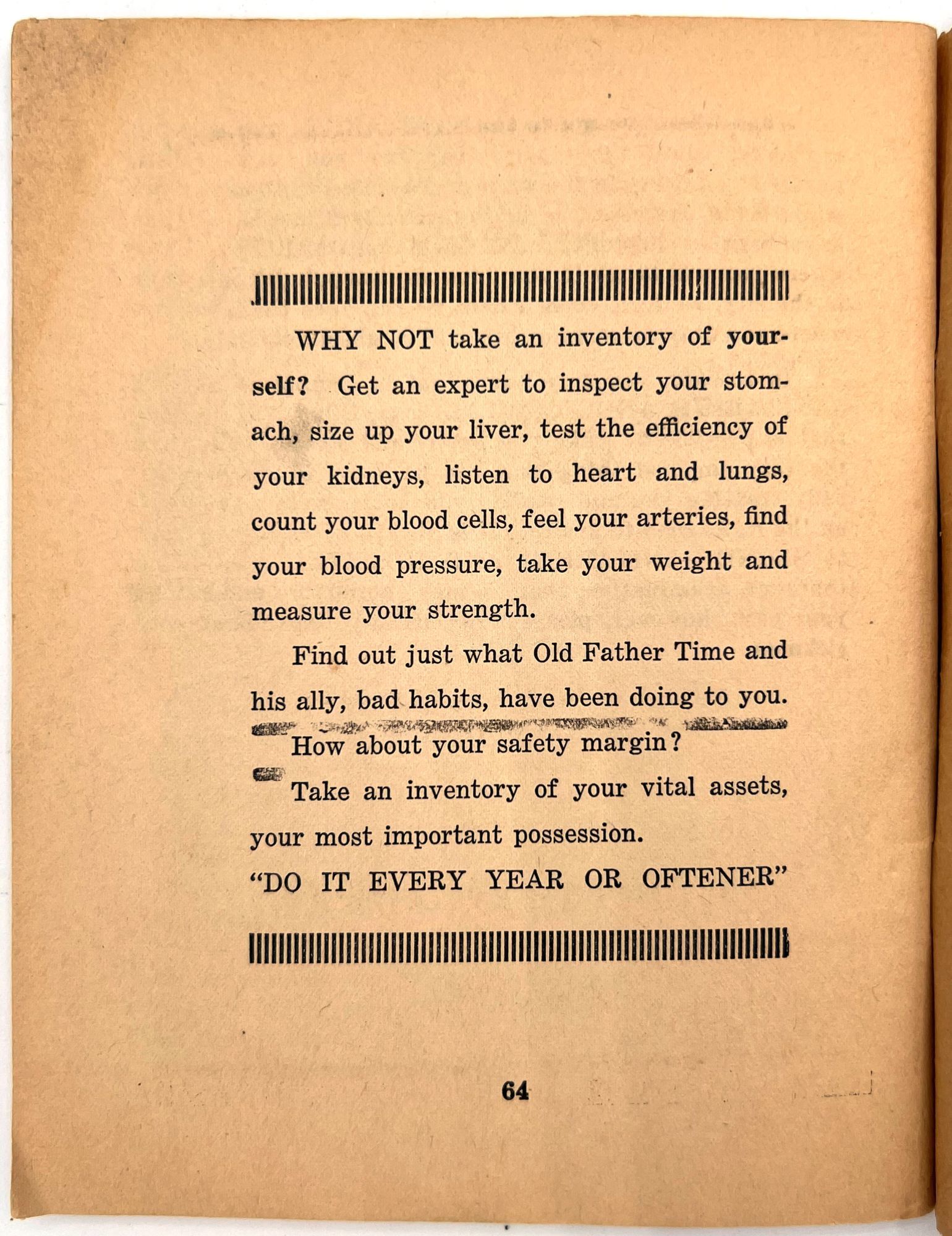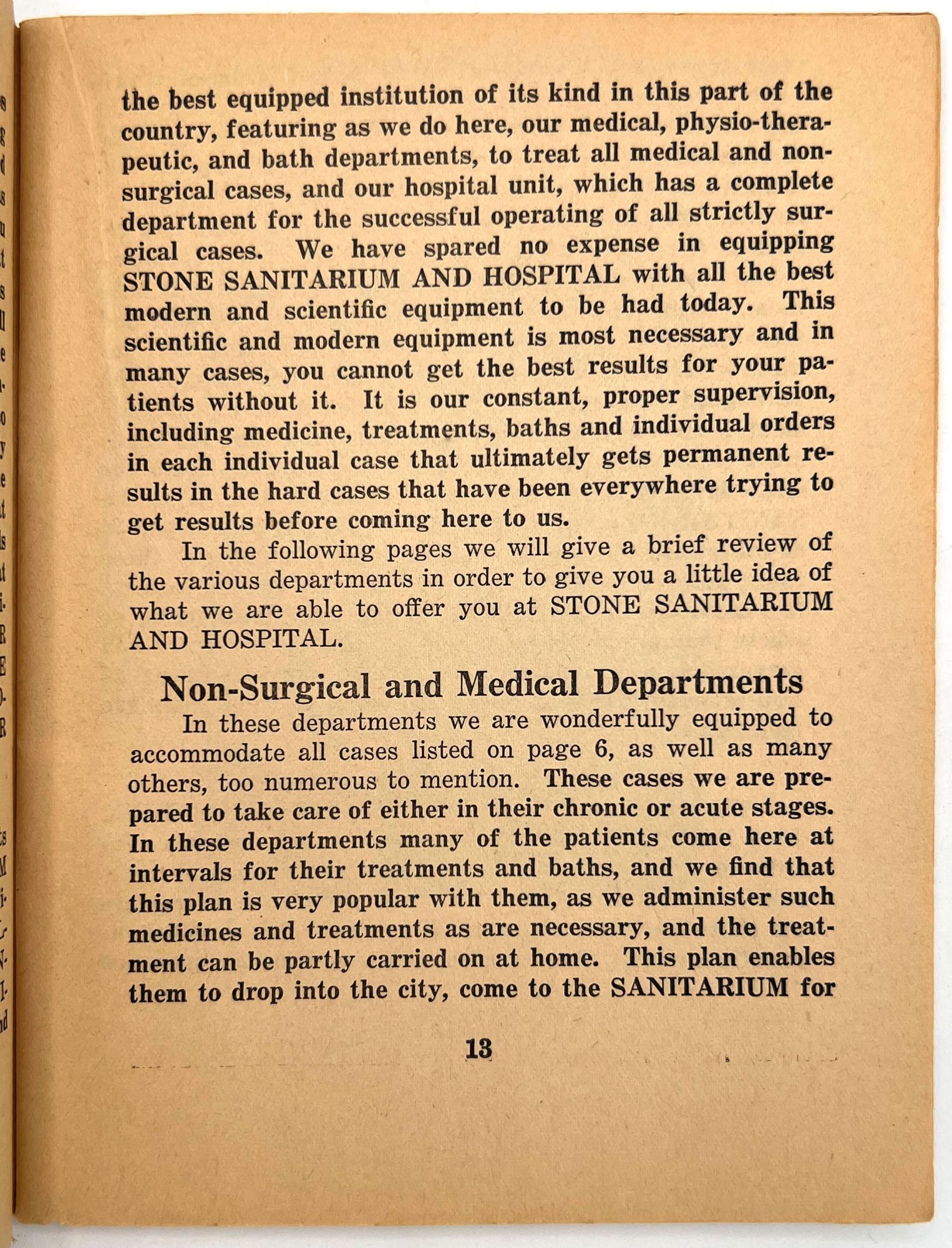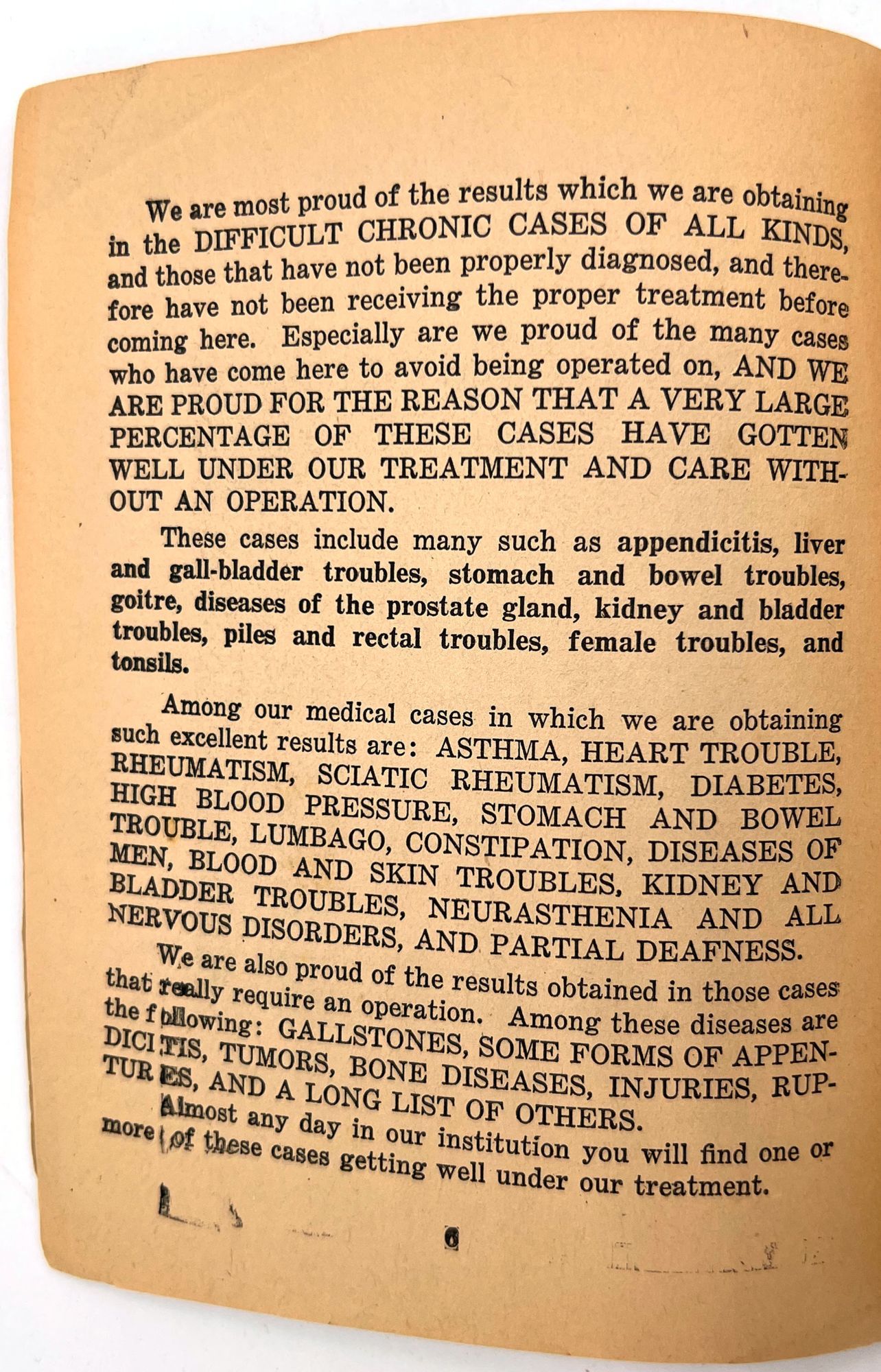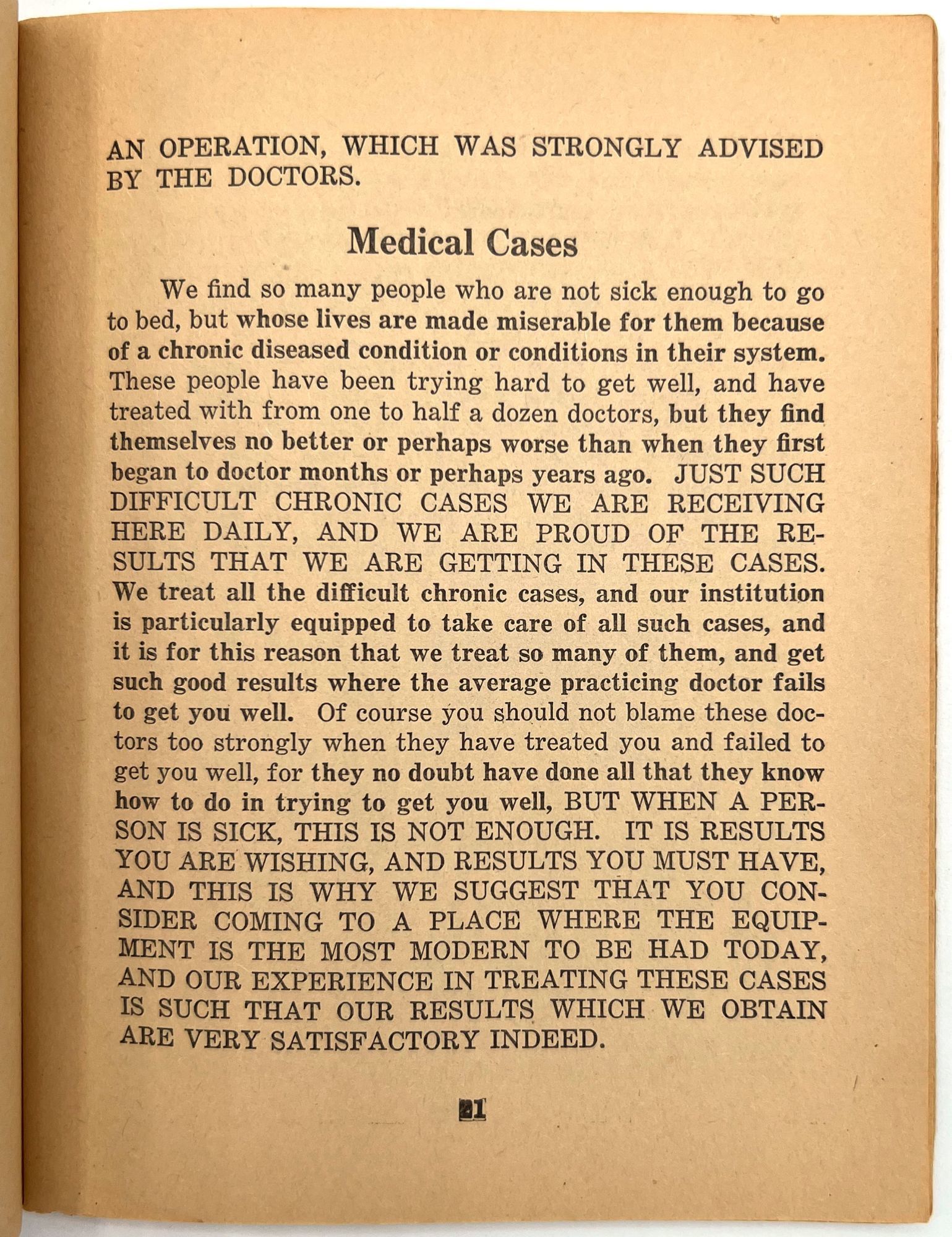 Fargo, North Dakota: Stone Sanitarium and Hospital, 1920. Very good. Paper toned and brittle. Chipping, minor staining/spotting.. A valuable book for all sick people to read", presented by the Stone Sanitarium and Hospital and its founder, Dr. Guy Stone. The illustrated booklet advertises the sanitarium as a haven for the chronically ill, treating and curing every disease from appendicitis and bowel troubles to kidney diseases and "female troubles" (p. 6). Each affliction is given a longer description and discussion in the rear. Includes interesting case studies that showcase the sanitorium's success, descriptions of each department, and ends with a call to action: "Why not take an inventory of yourself?" (p. 64). 12mo (6.75" by 5.25"), pp. 64, with photo-illustrations, sewn in original printed wrappers. Early ink to lower wrapper. Stone Sanitarium and Hospital was founded by Dr. Guy Stone after he purchased a residential property in Fargo circa 1920. It contained the following seven departments: non-surgical treatment; medical treatment; surgical; bath; X-Ray; prescription; and clinical.