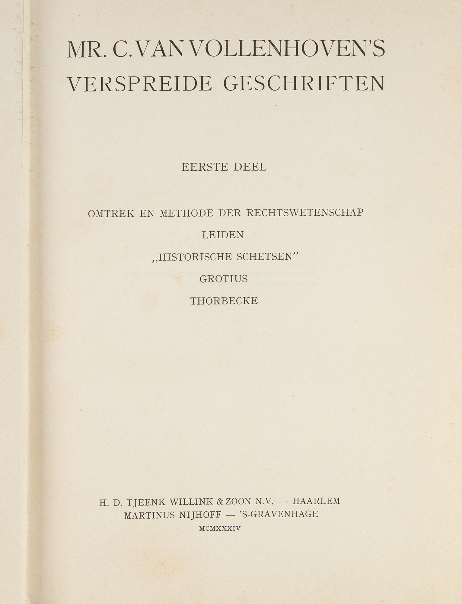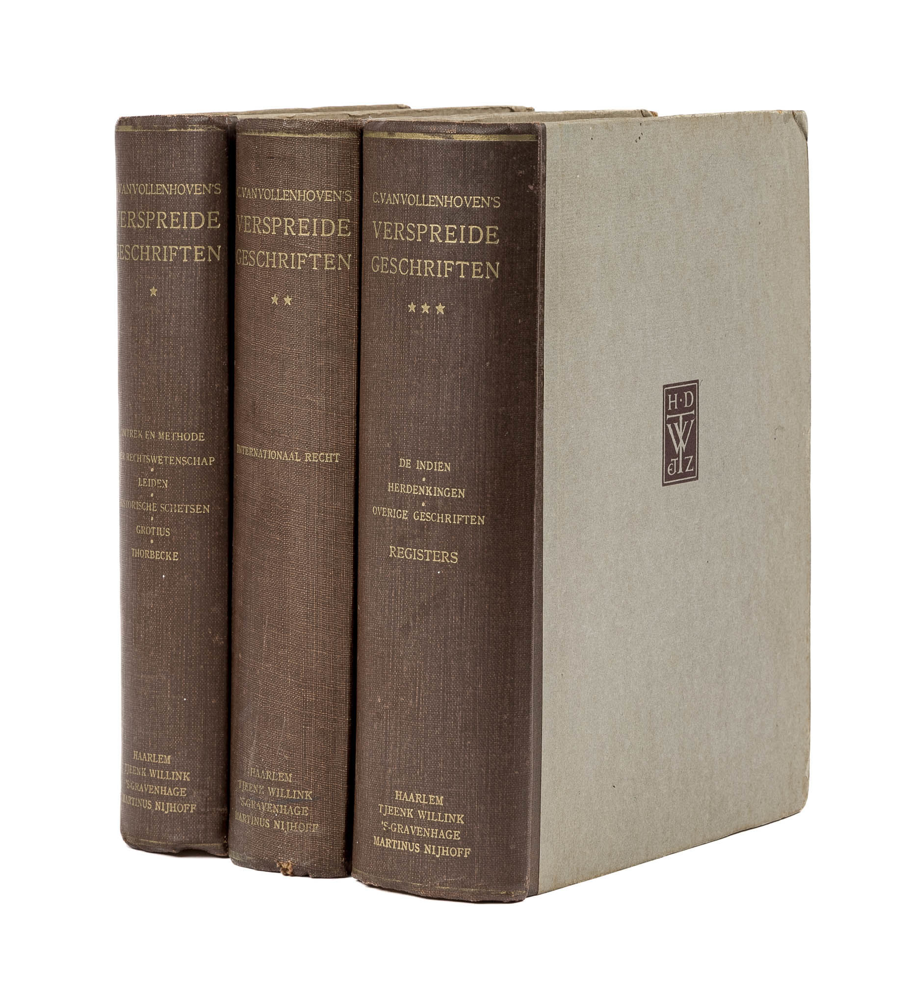 1935. M. Nijhoff, 1935. 3 volumes.. M. Nijhoff, 1935. 3 volumes. Vollenhoven, C Van. Asbeck, Frederik Mari, Editor. Mr. C. van Vollenhoven's Verspreide Geschriften. 's-Gravenhage, [NL]: M. Nijhoff, 1935. 3 volumes. Hardcover. Moderately worn. Internally clean. $150. * Contents: Outline and method of legal science. To lead. "Historical Sketches." Grotius. Thorbecke, International law, The Indies. Commemorations. Other writings. Registers. (Trans. from Dutch.).
