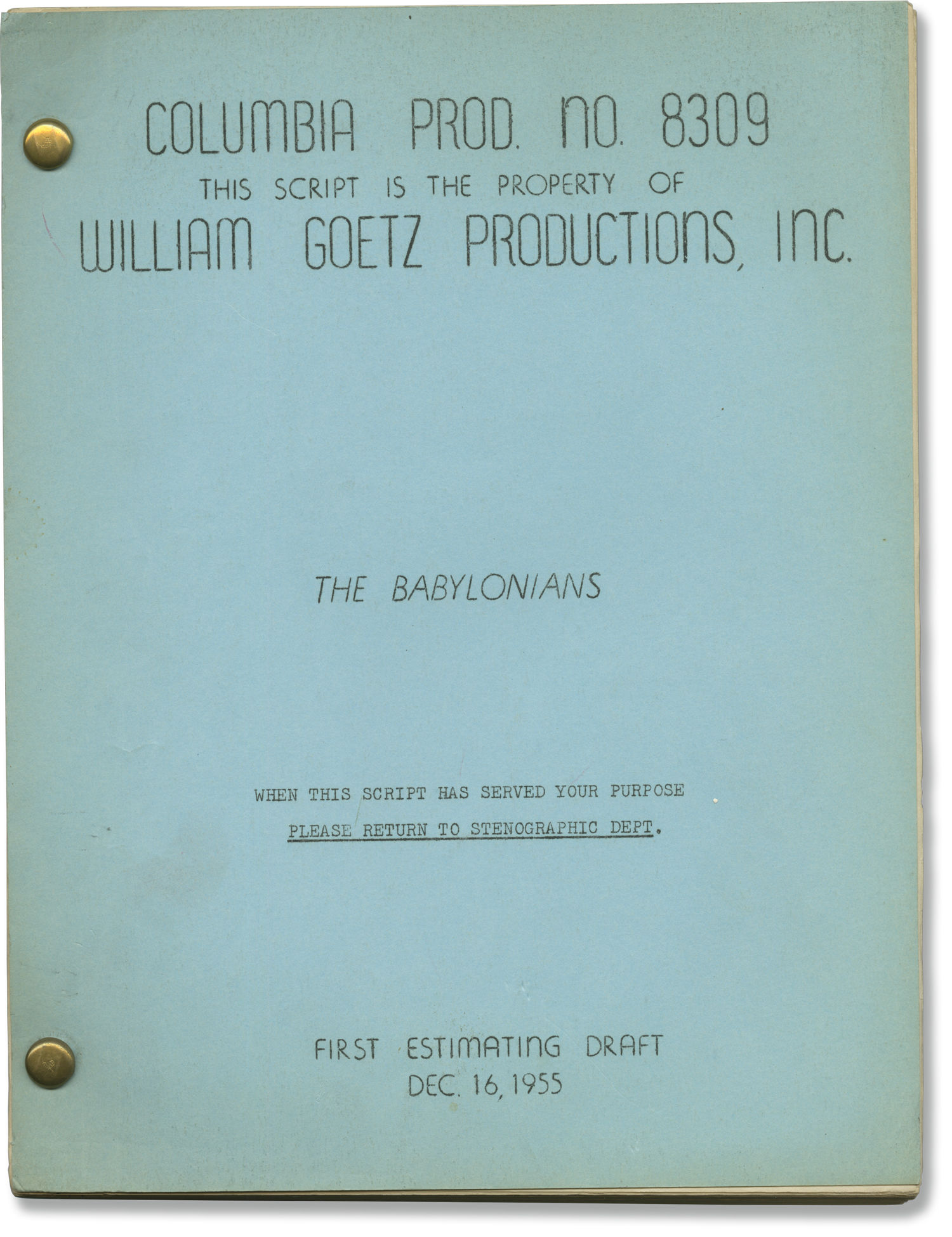 Culver City, CA: Columbia Pictures, 1955. First Estimating Draft script for an unproduced film.