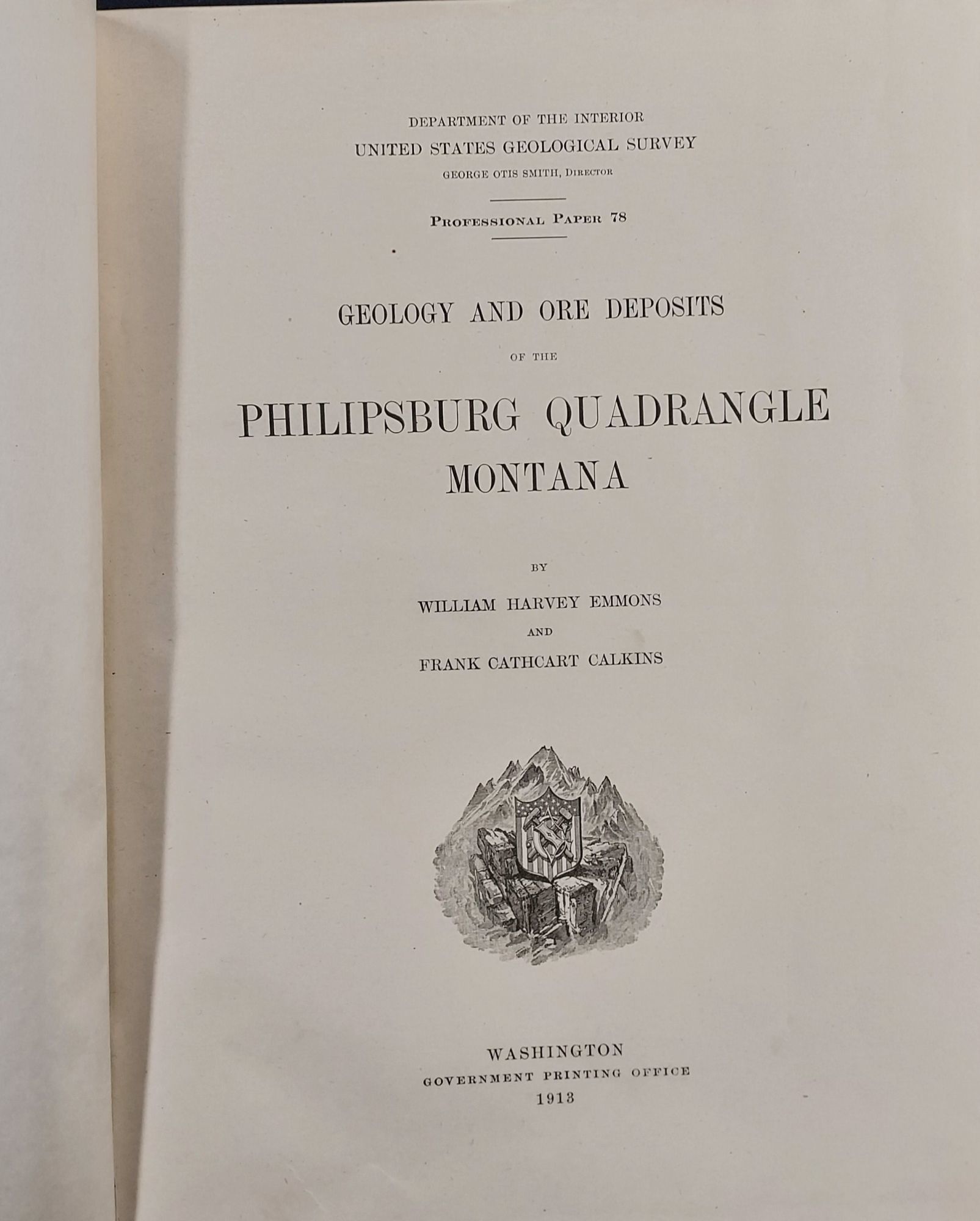 Washington DC: Government Printing Office, 1913. First edition. Hardcover. Very Good. 271pp. Quarto [29 cm] Greenish-blue cloth over boards. The extremities are lightly rubbed and the spine is subtly faded. Two maps in rear pocket. The Philipsburg quadrangle covers an area of 827 square miles lying immediately west of Anaconda, Montana.