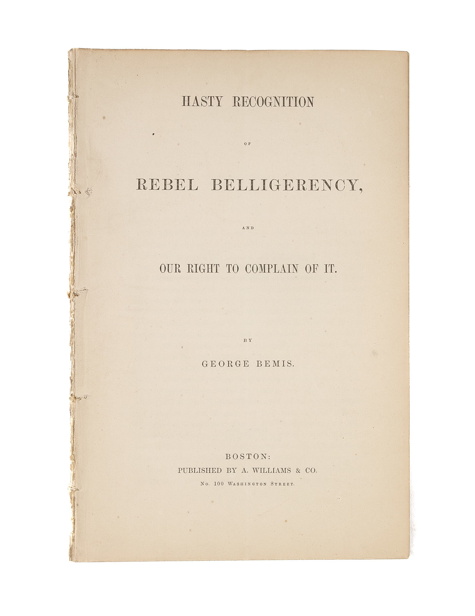 1865. The Most Gigantic and Immoral Sedition in History" Bemis, George [1816-1878]. Hasty Recognition of Rebel Belligerency, And Our Right to Complain of It. Boston: Published by A. Williams and Co., 1865. viii, [2], 57 pp. Octavo (8-1/2" x 5-1/2"). Disbound pamphlet, leaves separating at head. Moderate toning, faint vertical fold line, tiny spots to a few pages, small chip to top-edge of final leaf, ink library stamp to p. 1, brief correction in ink to p. 30. $50. * Only edition. In this "controversial and American" pamphlet, Bemis criticizes British neutrality in the American Civil War, which he sees as legitimation of the Confederate cause equivalent to tacit support "warming into life and helping to walk alone the most gigantic and immoral sedition in history" (iii). Catalogue of the Library of the Harvard Law School (1909) I:150.