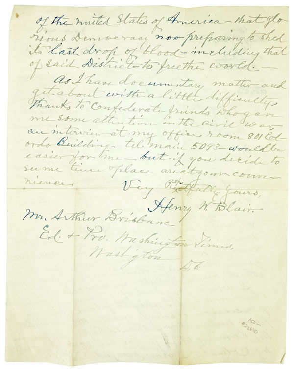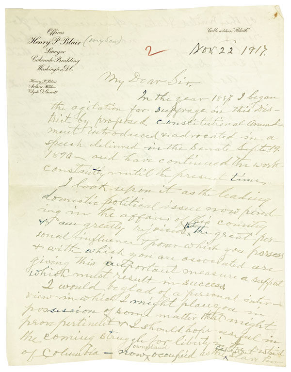 Washington, DC: [n.p.], 1917. Very Good. Washington, DC: [n.p.], 1917. Two-page autographed letter signed on single sheet of Henry P. Blair's (son of the letter's author) office stationery. Light edgewear and toning; mail folds. Very Good. Henry W. Blair served as Senator from New Hampshire and here urges Brisbane to come interview him regarding Suffrage for the District of Columbia, a cause for which which he claims to have proposed a constitutional amendment in 1887. Blair says, "I look upon it as the leading domestic political issue now pending in the affairs of this country." Blair ties DC's struggle with the United States upcoming entry into World War I, "that glorious democracy now preparing to shed its last drop of blood - including that of said District - to free the world."