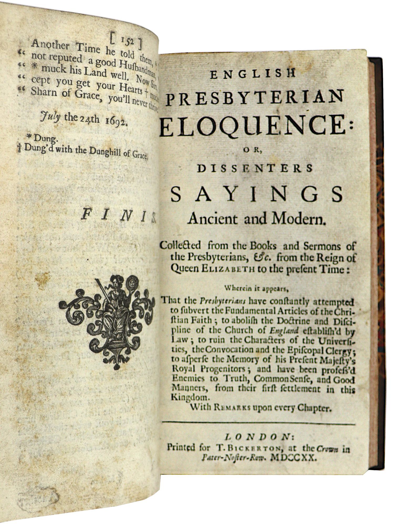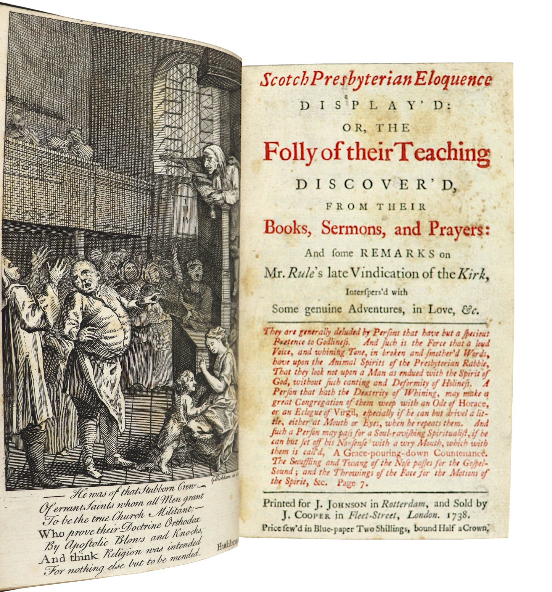 Scotch Presbyterian Eloquence Display'd: Or, the Folly of their Teaching Discover'd, from their Books, Sermons, and Prayers: And some Remarks on Mr. Rule's late Vindication of the Kirk, Interspers'd with Some genuine Adventures, in Love &c. [with] English Presbyterian Eloquence: or, Dissenters Sayings Ancient and Modern