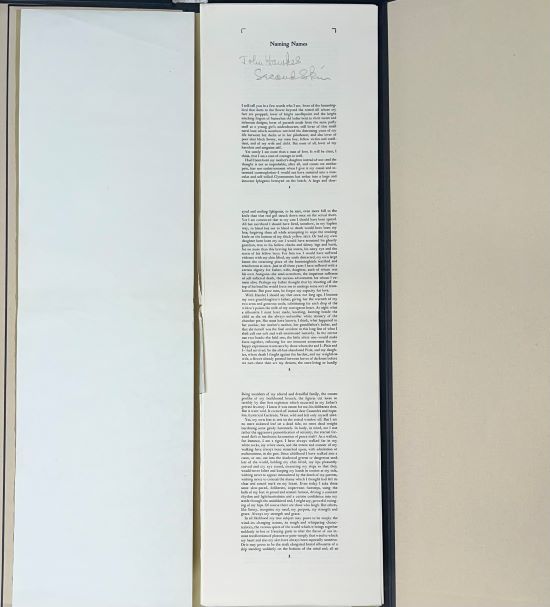 [New York]: [New Directions], 1964. Publisher's galley. Paperback. Near Fine. SIGNED. 210pp. Slender folio [60 cm] Loose sheets housed in a custom clamshell with a leather label on the spine. John Hawkes has penciled "Second Skin," and added a signature, on the top of the first page. An experimental and non-linear tale, nominated for the 1965 National Book Award.