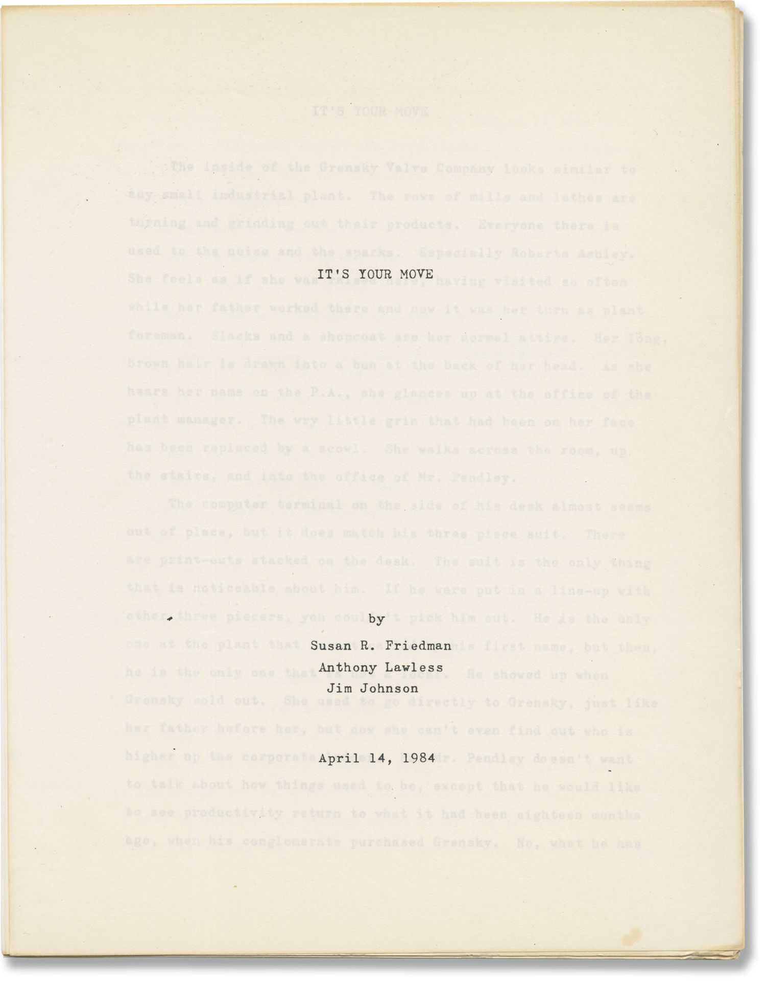Lacking titled wrappers, housed in a transparent yellow plastic folder. Title page present, dated April 14, 1984, with credits for screenwriters Susan R. Friedman, Anthony Lawless, and Jim Johnson. 10 leaves, with last page of text numbered 9. Xerographic duplication, rectos only. Pages Very Good plus, unbound.
