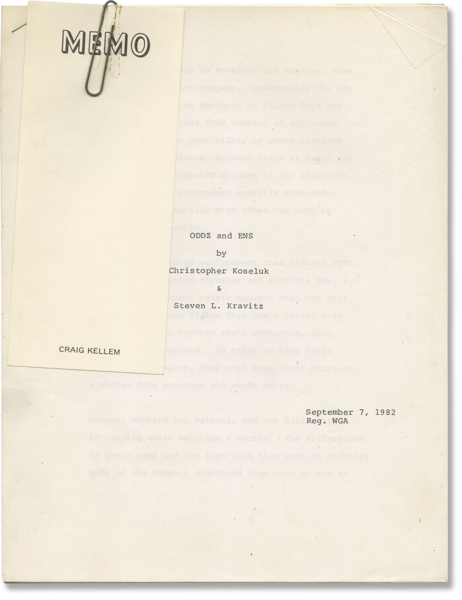 White, lacking titled wrappers. Title page present, dated September 7, 1982, with credits for screenwriters Christopher Koseluk and Steven L. Kravitz. 14 leaves, with last page of text numbered 13. Xerographic duplication, rectos only. Pages Very Good plus, with light rust from a paper clip to the top edge of the first leaf, bound with one staple at the top left corner.