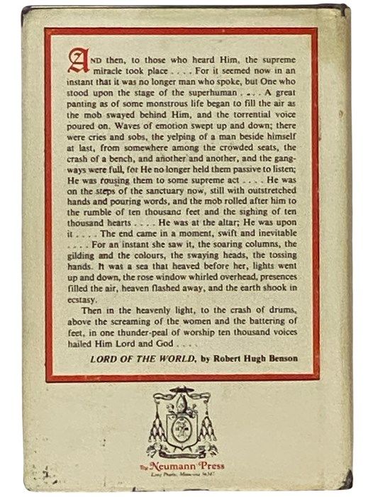 Long Prairie, Minnesota: The Neumann Press, 1982. Reissue. Hard Cover. Near Fine/Very Good. 9x6x1. 1982 reissue of 1907 original. Jacket lightly toned with 1 inch open tear to top corner and minor loss from other corners. xxii, 322 pp. A dystopian novel from a Catholic perspective, depicting the reign of the Antichrist. A quote from Evelyn Waugh on the front jacket flap reads as follows: "He was a magnetic preacher, an excellent story-teller, a ready writer; he had enthusiasm and unremitting energy, a rich imagination, an exuberant curiosity about people and things. But he knew that there was only one relationship of absolute value, that of the soul to God." Benson's rejected the views of H.G. Wells, which heralded atheism and Marxism as the causes which would lead to a future Utopia. He instead showed how Wells's future would become a global police state. Benson's work is numbered among the earliest modern works of dystopian fiction. Pope Francis and Pope Benedict XVI have both called the novel prophetic. "Described by Fulton Sheen as one of the three greatest depictions of the advent of the demonic in world literature, Lord of the World is science fiction with a difference. The West has succumbed to a sort of international socialism. The forces of secular materialism, relativism and state control are everywhere triumphant. Protestantism is no more, and Catholicism - which had made some major advances in the first half of the twentieth century - has been devastated by the development of new psychologies and the exodus of intellectuals in the wake of an Ecumenical Council. Euthanasia has become an instrument of the state, Esperanto the universal second language. Nevertheless, although organised religion has largely collapsed in the face of institutional secularism, a vague, humanistic religiosity - militantly hostile to the exclusive and supernatural claims of the Church - is present everywhere. Finally, the East, which has amalgamated into a single, pantheistic bloc, continues to pose a military threat. Enter Julian Felsenberg - diplomat, scholar, guru, Antichrist...