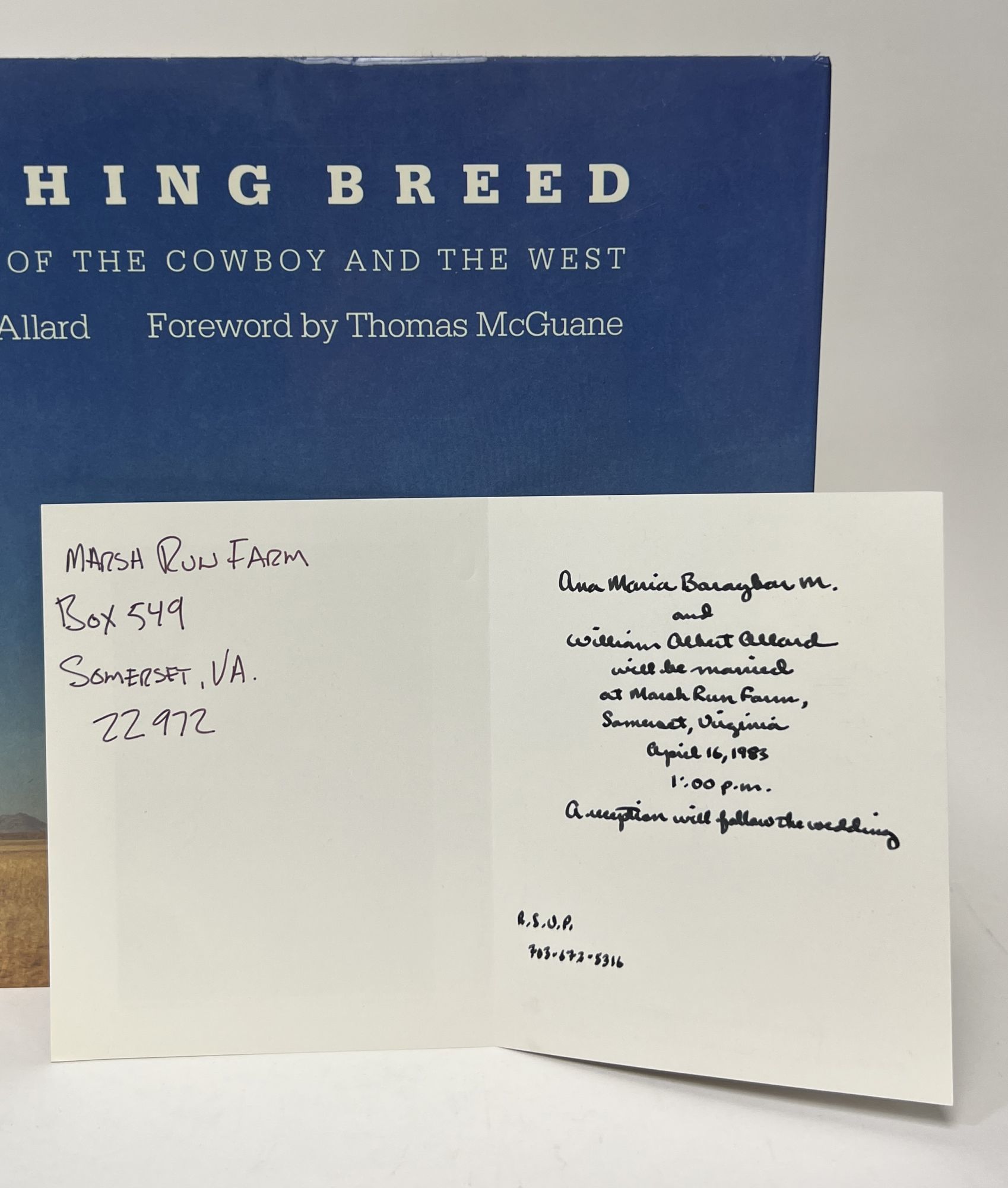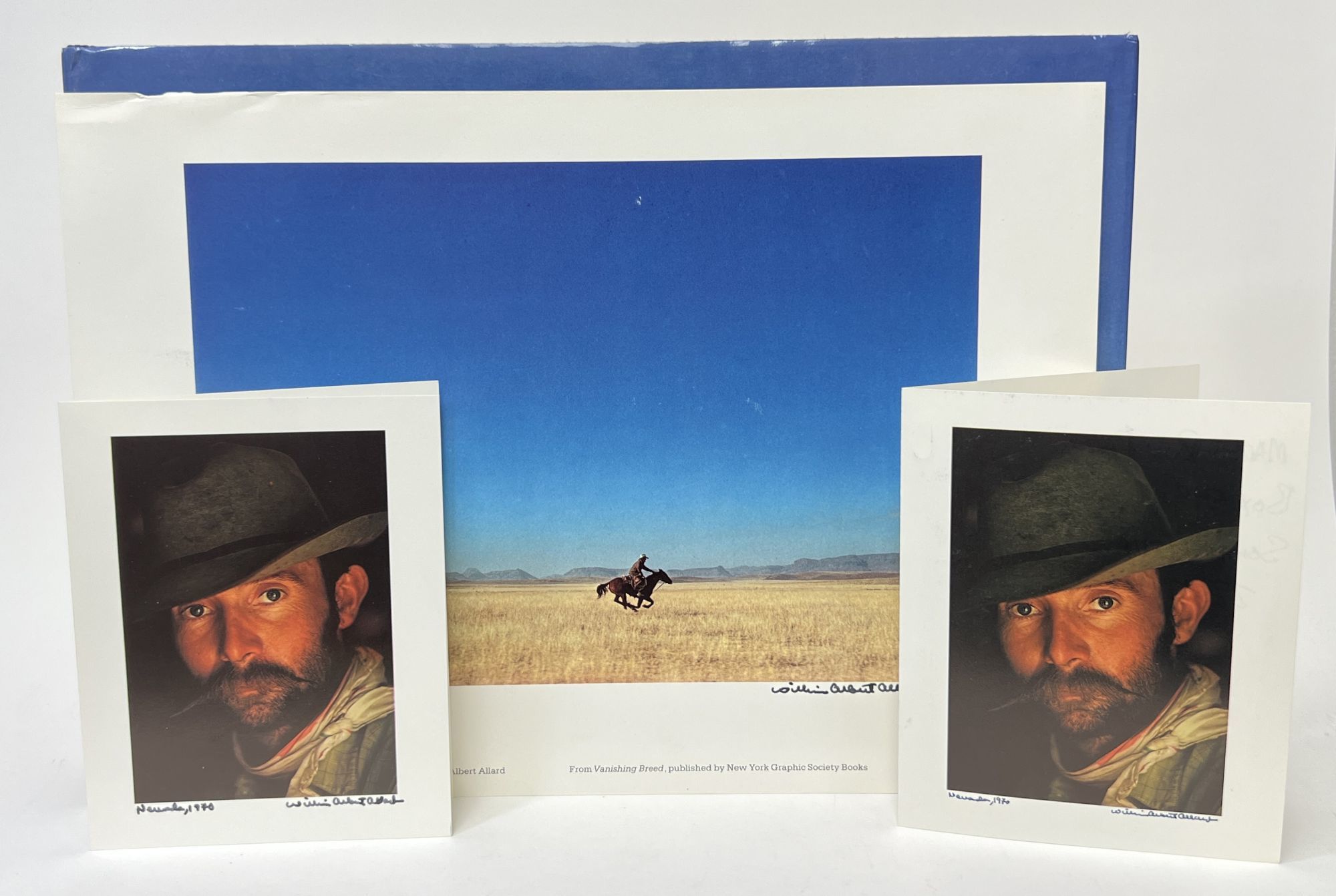 Boston: The New York Graphic Society | Little, Brown & Co, 1982. First Edition. Hardcover. Fine/Fine. Inscribed on the front endpaper by Allard to fellow photographer Ray Lustig, additionally signed on the half-title, also with a signed card featuring one of Allard's cowboy photographs, a handwritten wedding invitation illustrated with the same cowboy photograph, and another signed laid-in print featuring one of Allard's photographs from this book. Fine in an about Fine jacket, unclipped ($34.95), toned a shade on the spine. Blue cloth with gilt lettering on the spine. Square and firmly bound, clean internally. Illustrated with 104 color photographs, Allard's book documents his time spent traveling with buckaroos from Mexico to Canada.
