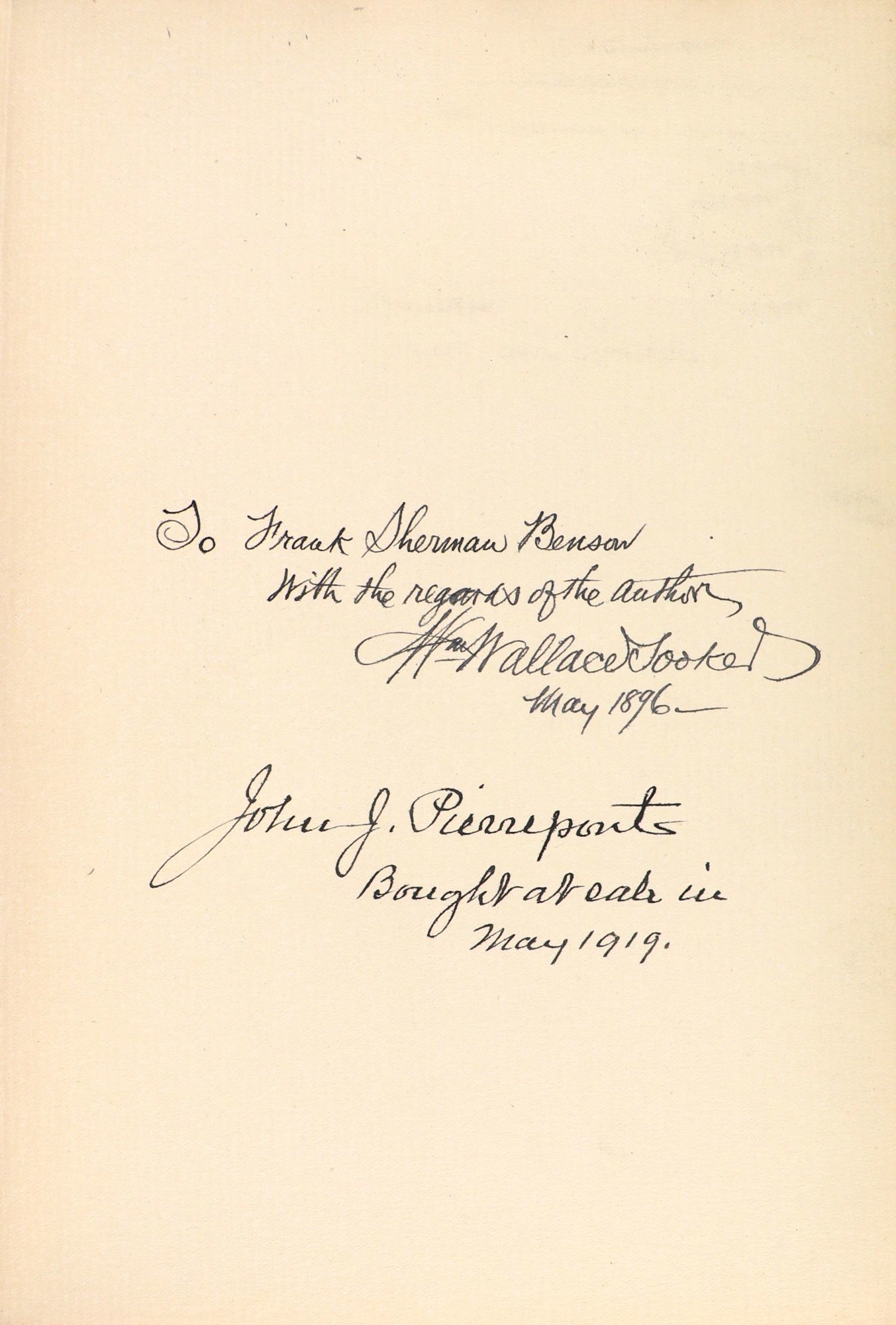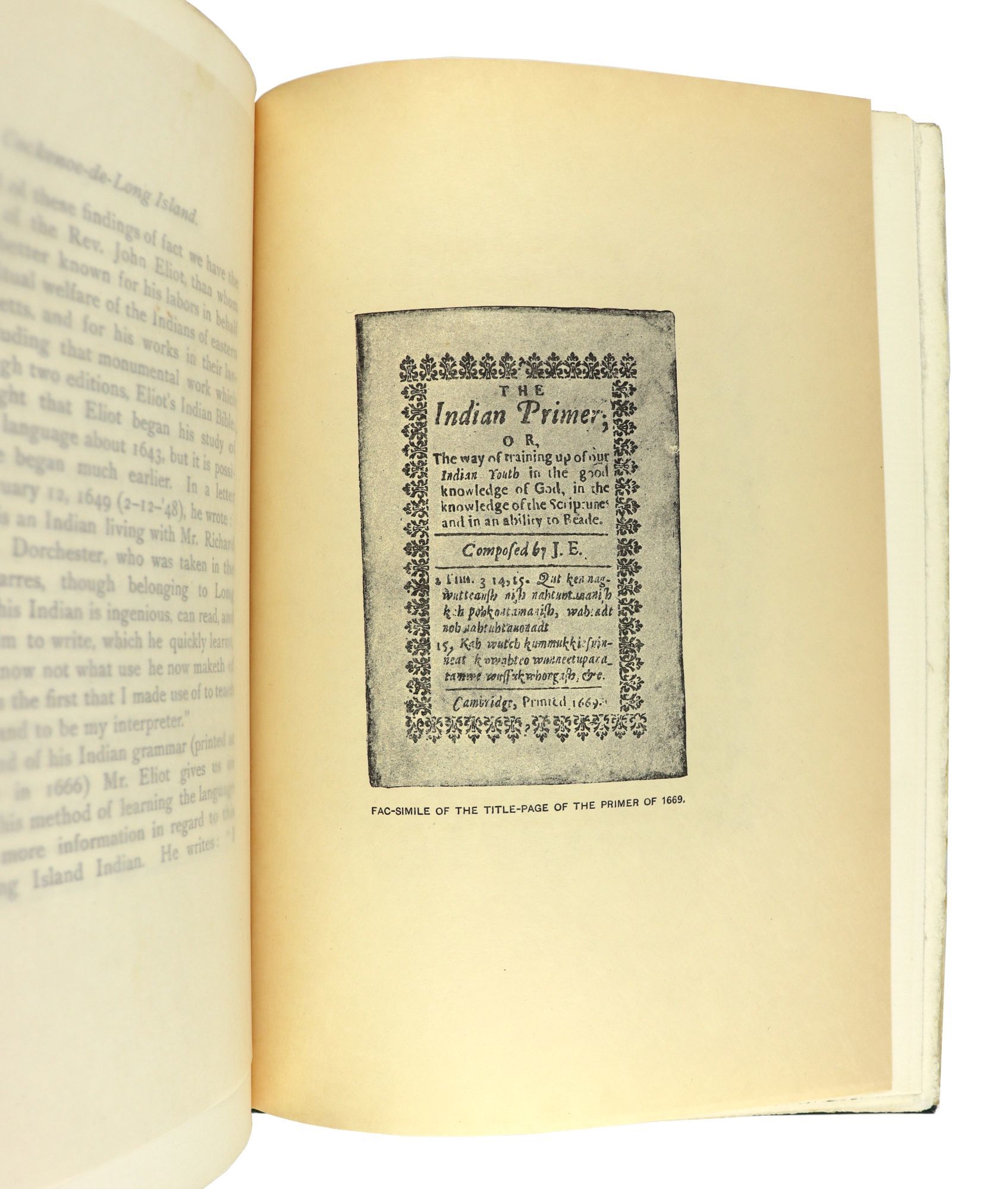 New York: Francis P. Harper, 1896. Very Good. New York: Francis P. Harper, 1896. First Edition, Limited Issue of 215 copies, this being #83. Signed by William Wallace Tooker to Brooklyn numismatist Frank Sherman Benson. Octavo. 60 pp. Frontis and facsimile production of 1669 Indian Primer title page, both with tissue guard. Dark green cloth stamped in gilt. Boards lightly edgeworn with a slight lean. Binding is sound. Additional ownership inscription of John J. Pierreponts dated 1919 to front free endpaper, interior else unmarked. A Very Good copy of an uncommon title.
