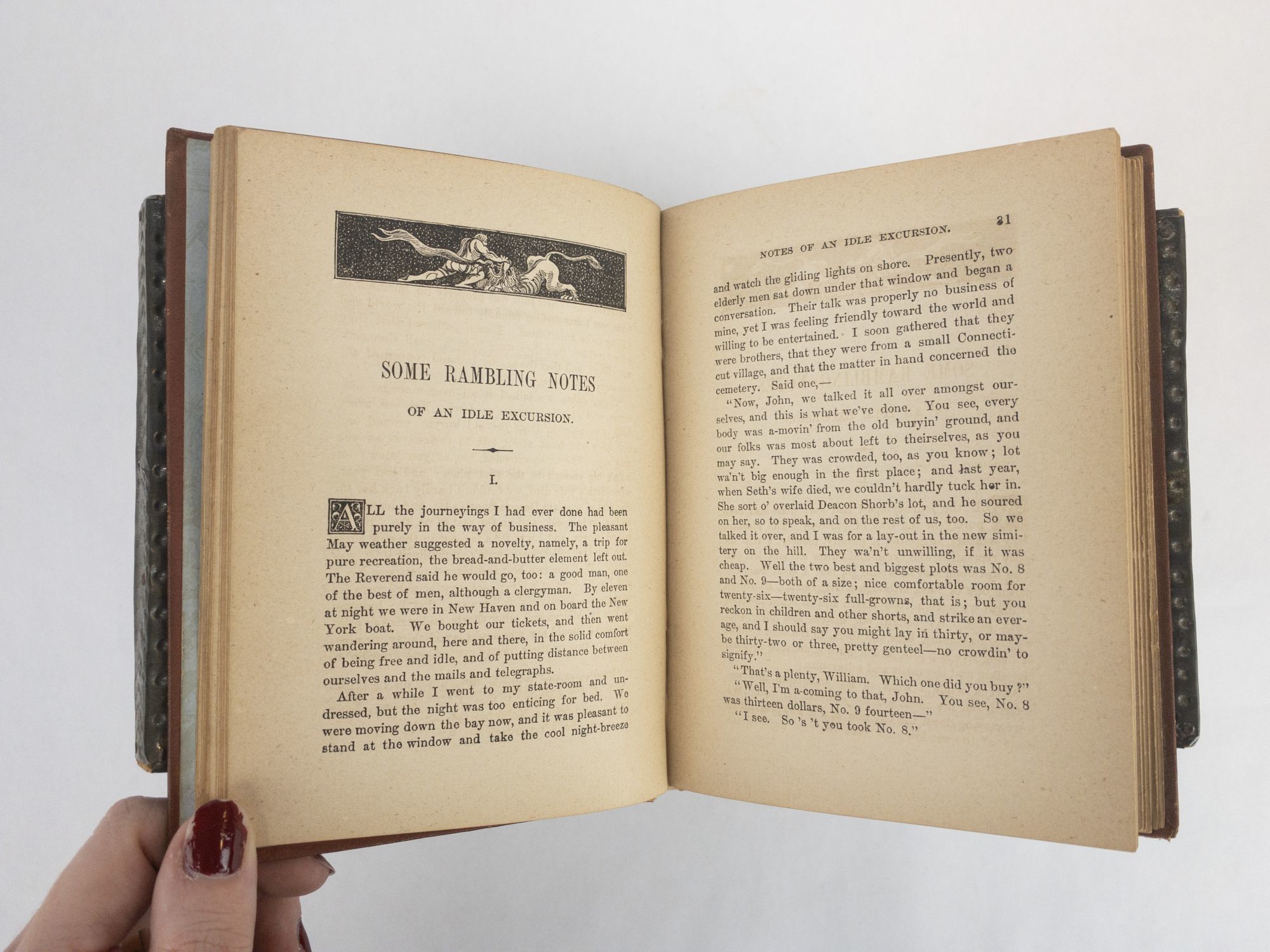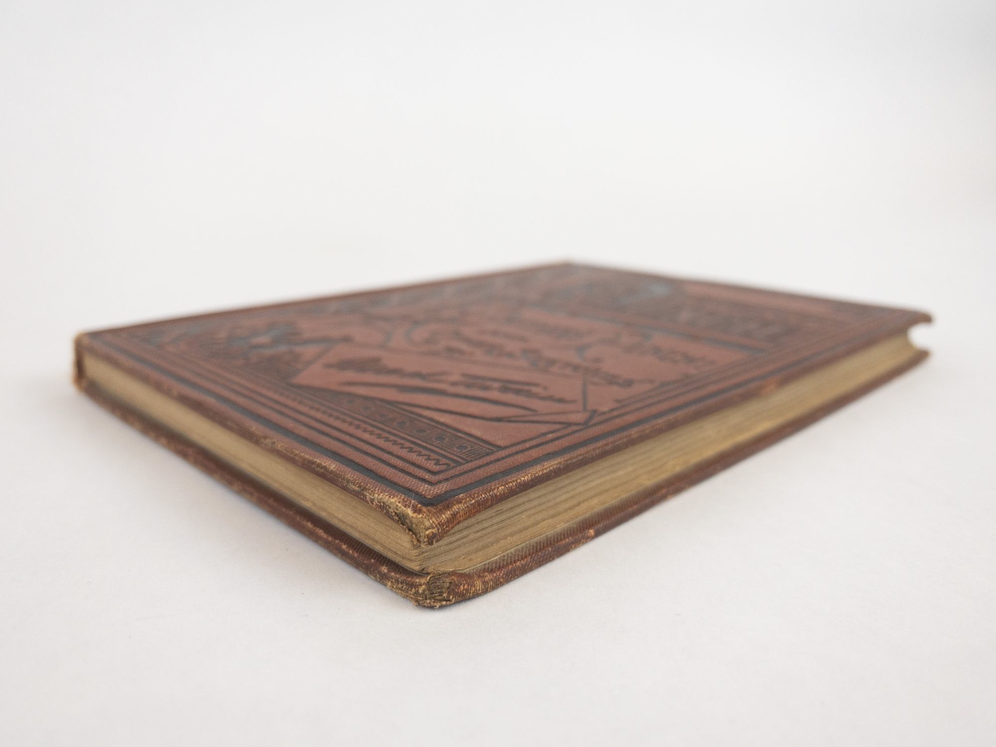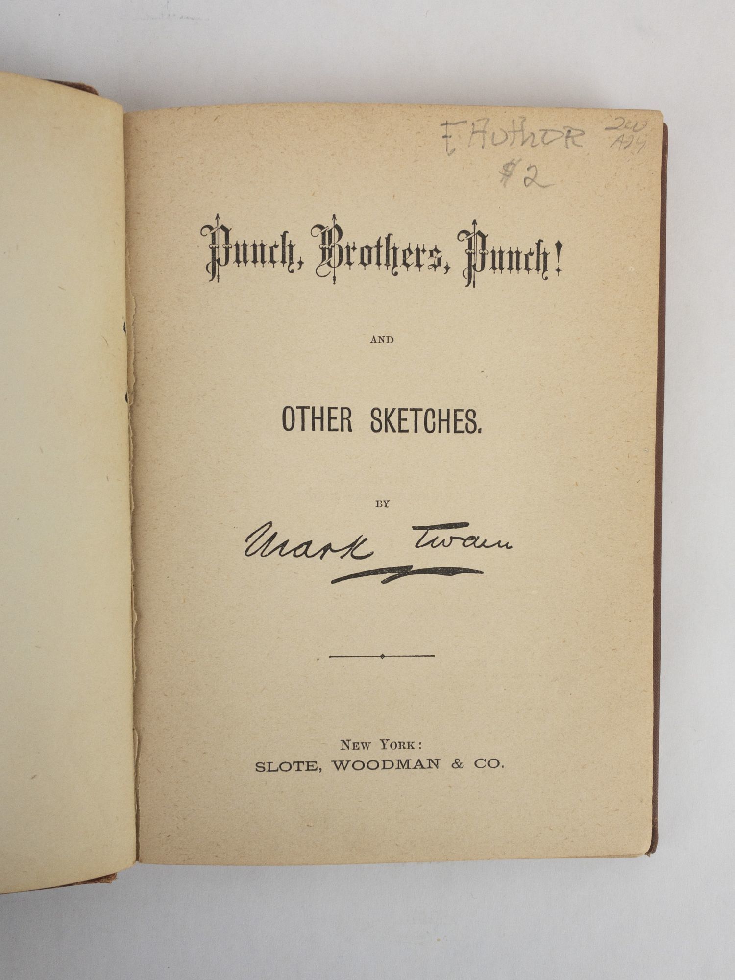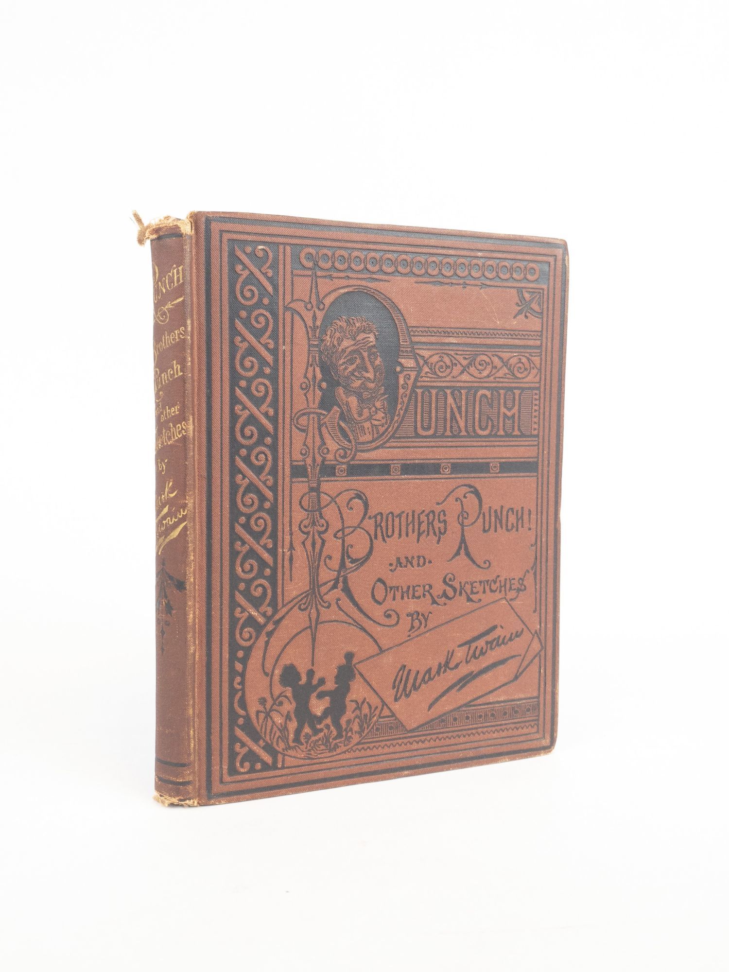 New York: Slote, Woodman & Co, 1878. Second Edition. Hardcover. Small Octavo, 140, [4] pages. In Very Good minus condition. Bound in red cloth with gilt lettering on spine. Second edition, with Twain's name printed as facsimile autograph on title page, as well as issue points present on pages 91 and 101. Clothing binding 2, with blue endpapers decorated with caricatures, and illustrations of Twain's scrapbook on rear pastedown. Scuffing along edges of boards. Fraying to cloth on head and tail of spine. Light bumping to corners. Age-toning to interior pages. With four pages of advertisements in rear. Shelved in Case 13. BAL 3378. 1376204. Shelved Dupont Bookstore.