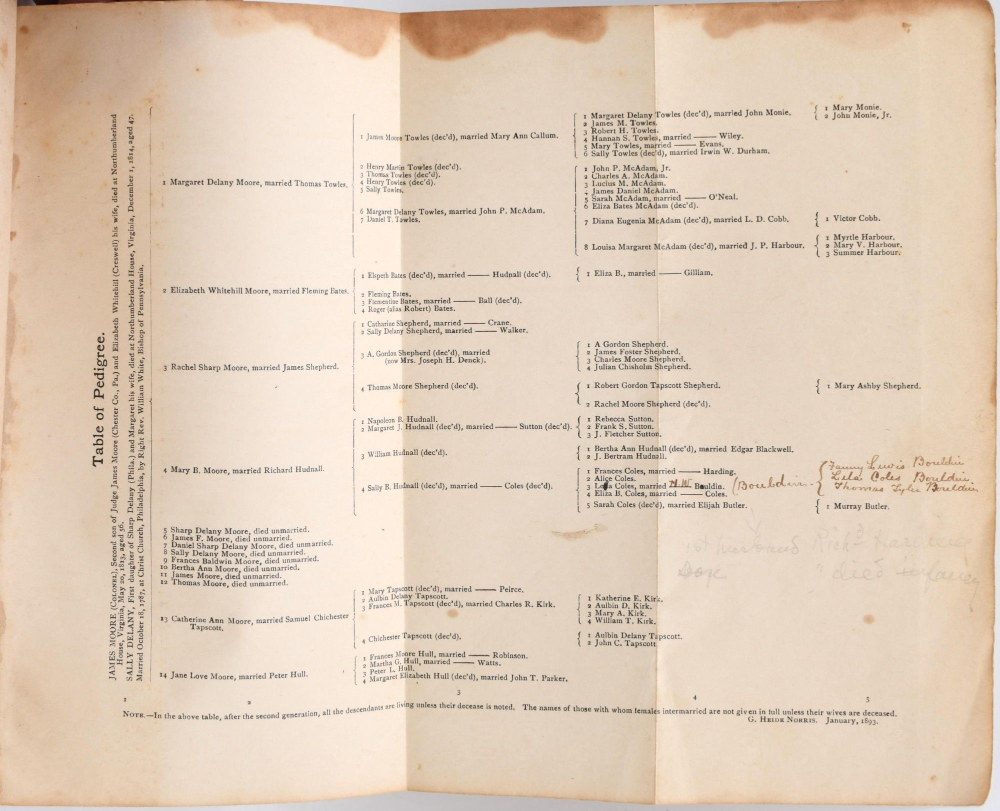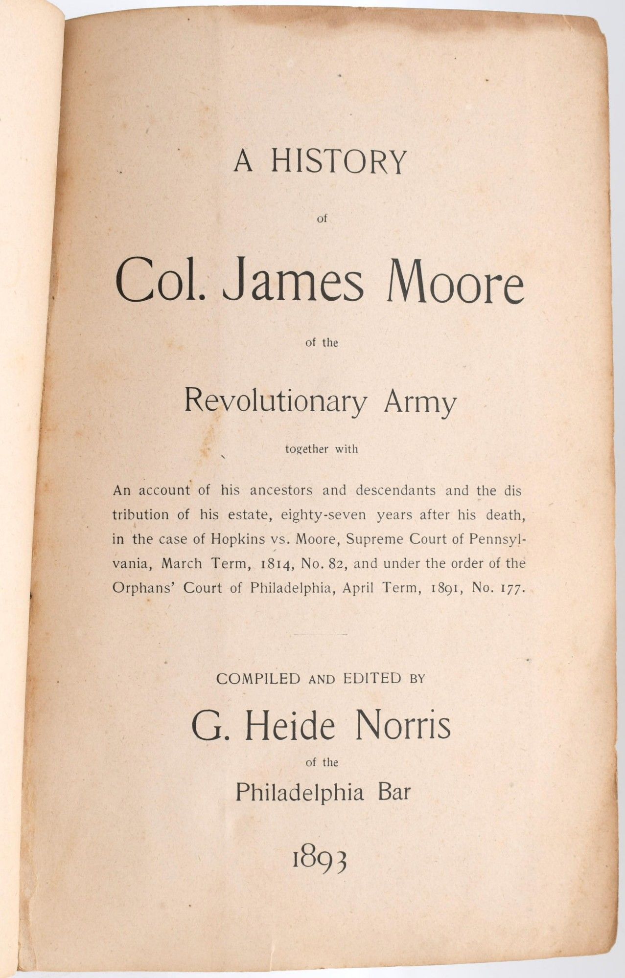 [GENEALOGY] A HISTORY OF COL. JAMES MOORE OF THE REVOLUTIONARY ARMY, TOGETHER WITH AN ACCOUNT OF HIS ANCESTORS AND DESCENDANTS AND THE DISTRIBUTION OF HIS ESTATE, EIGHTY-SEVEN YEARS AFTER HIS DEATH, IN THE CASE OF HOPKINS VS. MOORE, SUPREME COURT OF PENNSYLVANIA, MARCH TERM, 1814, NO. 82, AND UNDER THE ORDER OF THE ORPHANS' COURT OF PHILADELPHIA, APRIL TERM, 1891, NO. 177