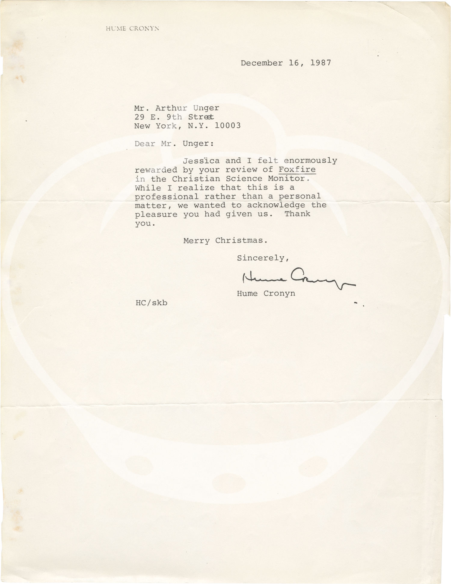New York: International Creative Management [ICM], 1982. Final Draft script for the 1983 play, which opened on November 11, 1982 at the Ethel Barrymore Theatre for a run of 213 performances, closing on May 15, 1983, starring Hume Cronyn, Jessica Tandy, and Keith Carradine. Laid in is a letter written by Cronyn to Christian Science Monitor journalist Arthur Unger expressing gratitude for an enthusiastic review of the television movie adapted from the play, signed in manuscript marker by Cronyn. Missing 15 pages, likely as used or issued.