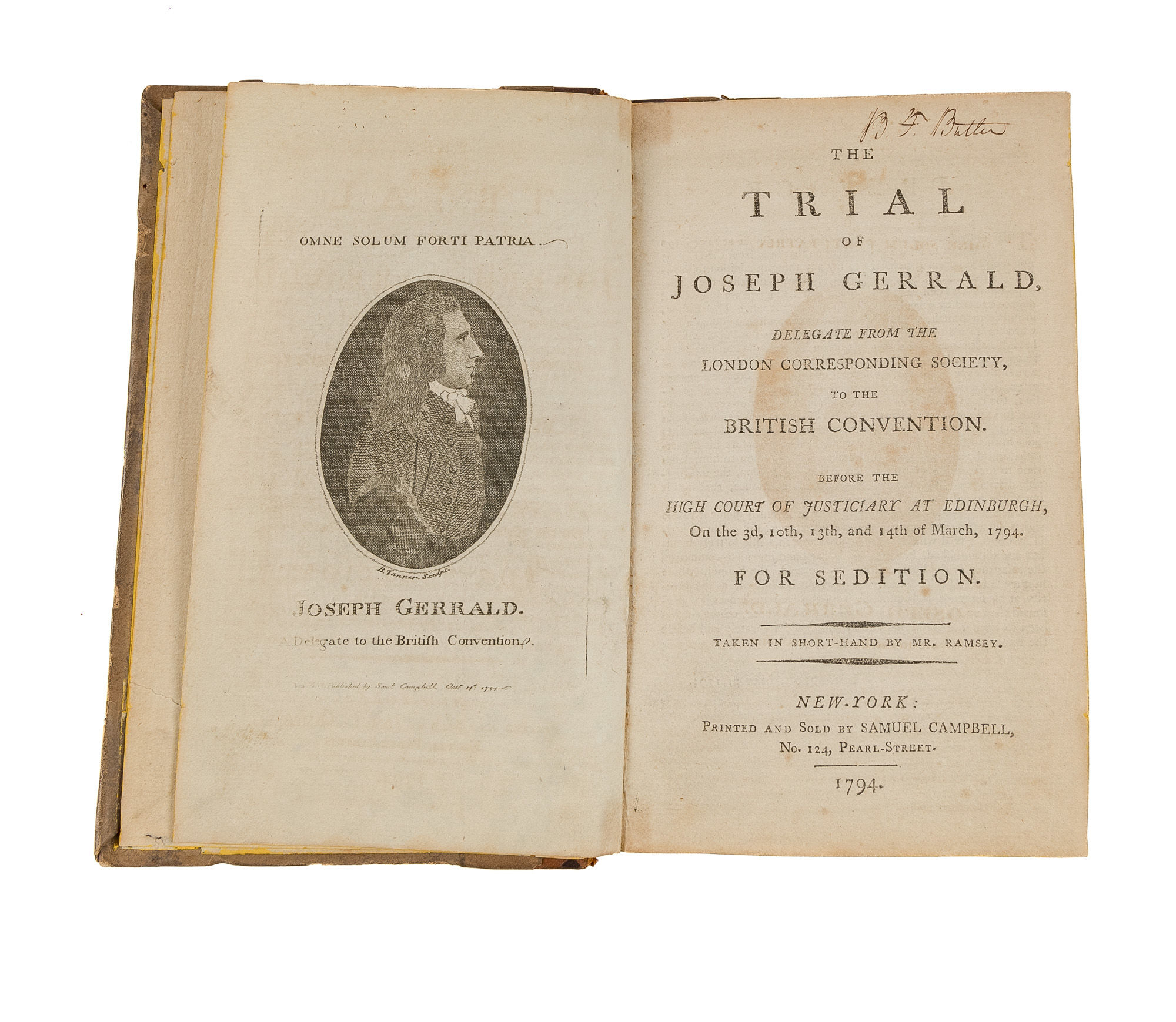 1794. New York: Samuel Campbell, 1794.. New York: Samuel Campbell, 1794. Copy of an Account of an Anti-Radical Crackdown Owned by Two Lawyers Who Were Union Army Officers [Trial]. Gerrald, Joseph [1763-1796]. The Trial of Joseph Gerrald, Delegate from the London Corresponding Society, To the British Convention. Before the High Court of Justiciary at Edinburgh, On the 3d, 10th, 13th, And 14th of March, 1794. For Sedition. Taken in Short-Hand by Mr. Ramsey. New York: Printed and Sold by Samuel Campbell, No. 124, Pearl-Street, 1794. 207, [1] pp. With a frontispiece portrait of Gerrald. Octavo (7-3/4" x 4-3/4"). Contemporary quarter calf over plain paper-covered boards, gilt fillets and hand-lettered title to spine, edges dyed yellow. Light rubbing to boards, a few faint stains to front board, moderate rubbing to extremities, front joint starting at head, corners lightly worn, hinges cracked, later pencil notes to front free endpaper, which has a small clean tear at fore-edge affecting annotations, book label of "H. Scofield's/ Library/ No. 15913" to its verso. Moderate toning to interior, light foxing in a few places, faint offsetting from frontispiece, early owner signature of Benjamin F. Butler to head of title page. A very good copy in a well preserved original and unsophisticated 18th century New York binding. $750. * First American edition. Gerrald, a radical political activist and reformer, was a member of the Society for Constitutional Information and the London Corresponding Society. During a wave of prosecutions of radical activists after the French Revolution, Gerrald was arrested along with four of his colleagues and tried for sedition. Like others carried out during this time, the trials resulted in guilty verdicts; the group of Scottish activists tried between 1793 and 1794 are often referred to as the "Scottish Martyrs." Gerrald was sentenced to fourteen years' transportation and died in 1796 in Botany Bay. Other American editions were published by Campbell the same year. Remembered today as a general in the U.S. Army during the Civil War, Butler [1818-1893] was a leading Massachusetts trial lawyer who practiced in Lowell and Boston. Later, he was a member of the U.S. House of Representatives, where he played a central role in the impeachment of President Andrew Johnson, and governor of Massachusetts. Hiram Scofield [1830-1906] was a prominent lawyer and Civil War colonel. A dedi.