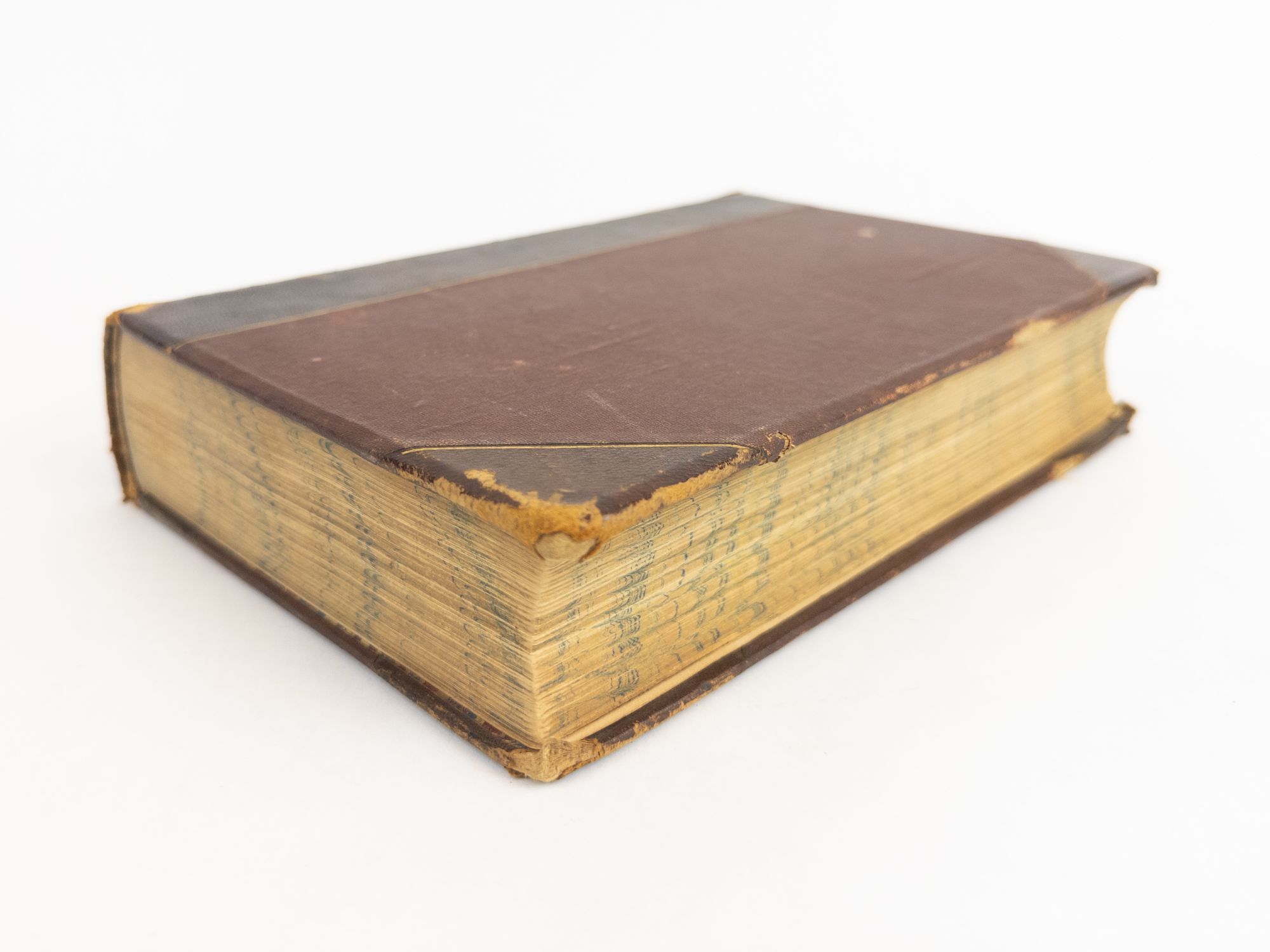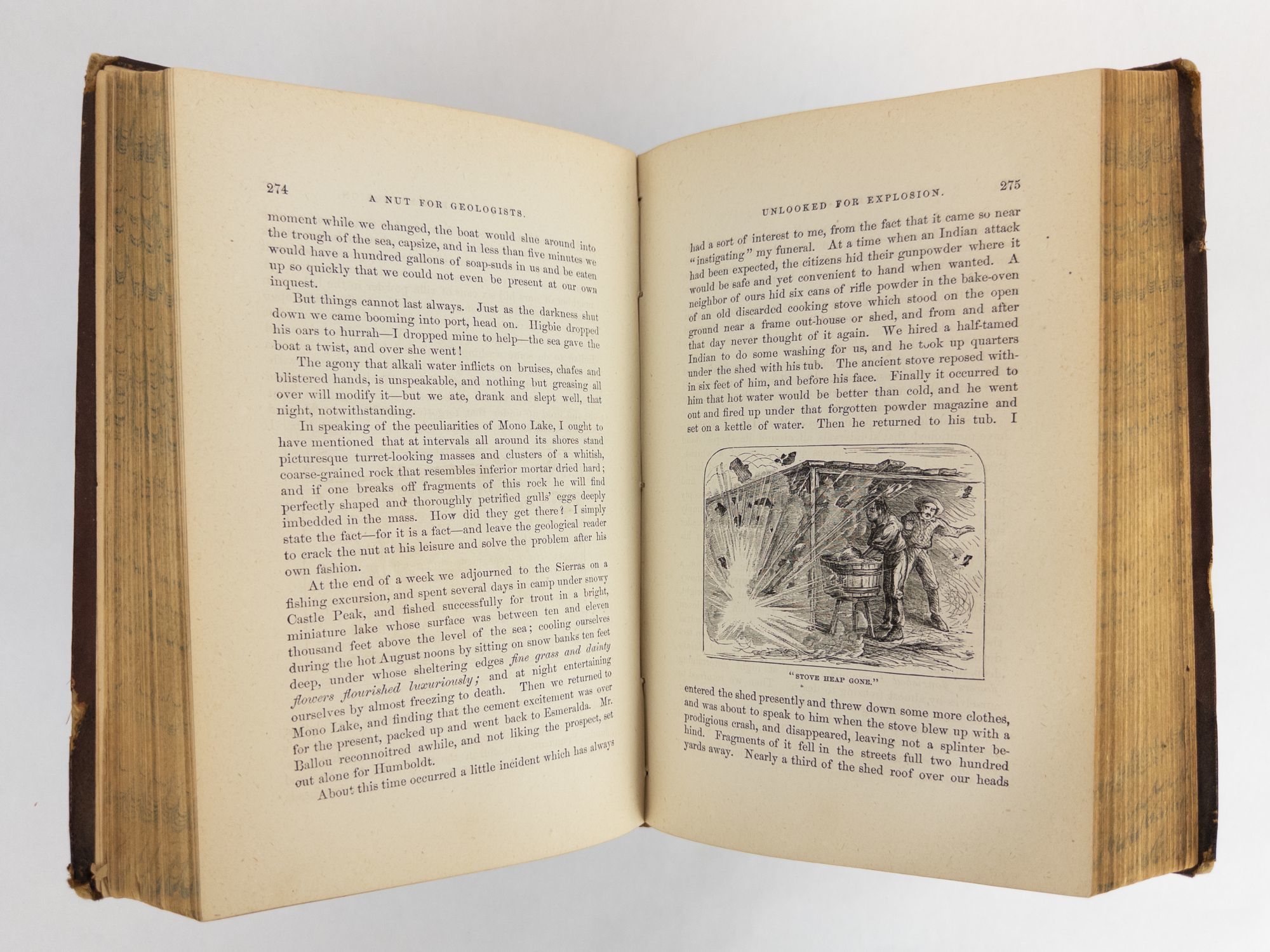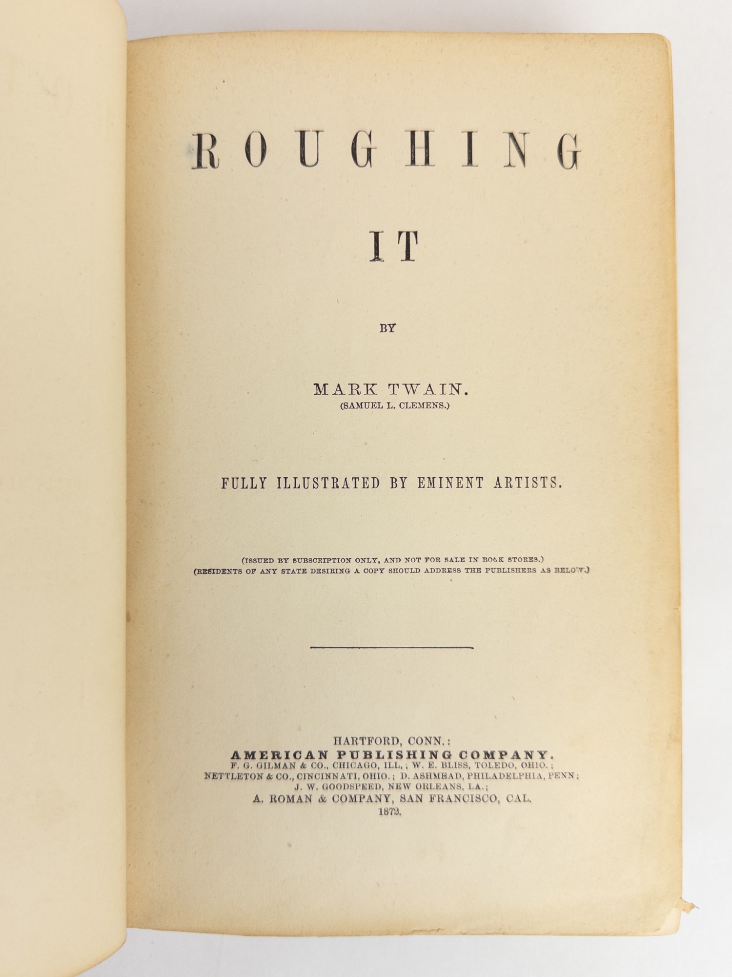 Hartford: American Publishing Company, 1872. First Edition, First State. Hardcover. Octavo, i-xviii, 19-591, [1] pages. In Very Good minus condition. Bound in publisher's half morocco and pebble cloth, with gilt lettering on paneled spine. First state, with the line, "...premises -- said he/was occupying his..." on page 242. Wear to leather on spine and corners. Splitting at hinge, measuring about 2.5 inches from tail. Bubbling to cloth on front and rear boards. Textblock edges dyed marble, though faded. Age-toning and light scattered foxing to interior pages. Features six plates tipped in and illustrations throughout. BAL 3337. Shelved in Case 13. 1376368. Shelved Dupont Bookstore.