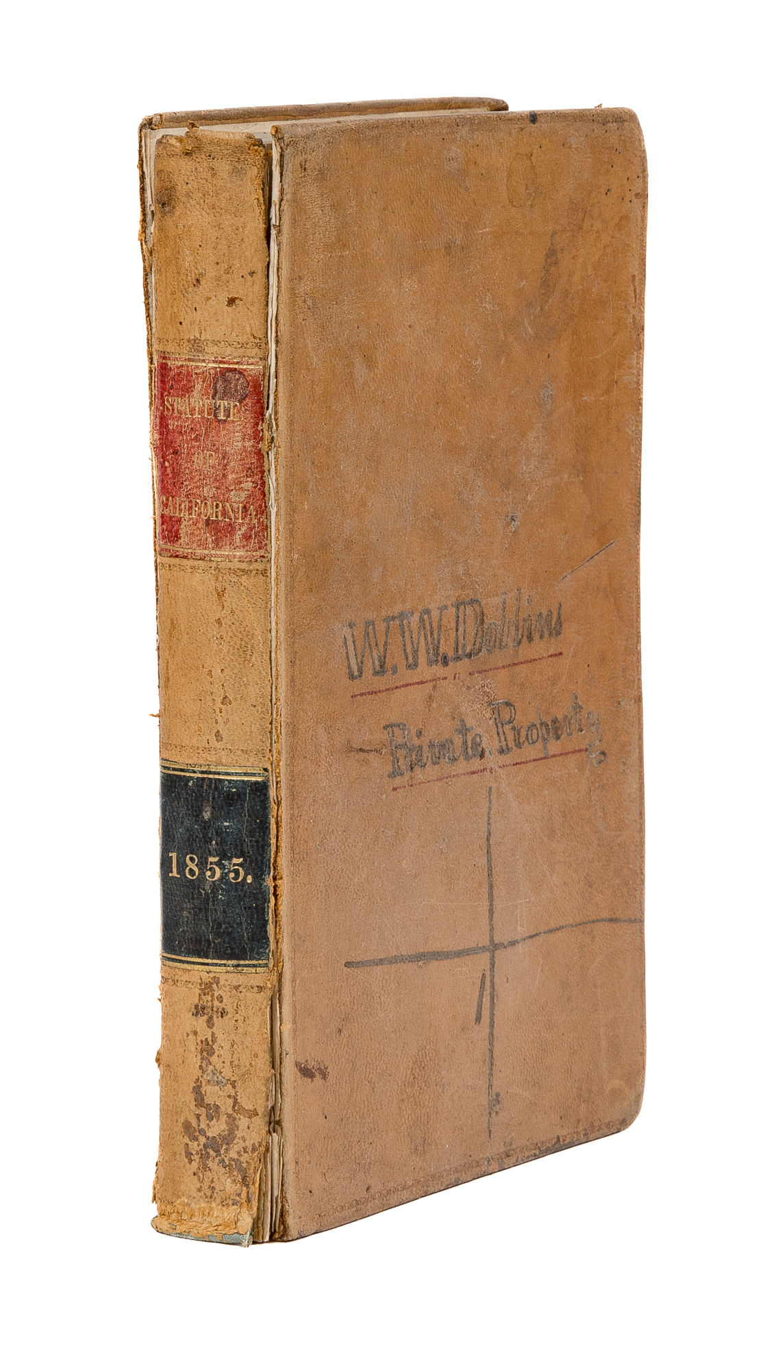 1855. [California]. The Statutes of California, Passed at the Sixth Session of the Legislature, Begun on the First Day of January, One Thousand Eight Hundred and Fifty-Five, and Ended on the Seventh Day of May, One Thousand Eight Hundred and Fifty-Five, at the City of Sacramento. Sacramento: B.B. Redding, State printer, 1855. xv, 326 pp., 1 folded leaf. Publisher's law sheep, red and black gilt spine stamps, scuffed, joints cracked but holding. Previous owner's ink property inscription (of W.W. Dobbins) on front cover. A good copy. $65. * Folded leaf. Tabular statement of receipts into the State Treasury, from January 1, to June 30, 1854.