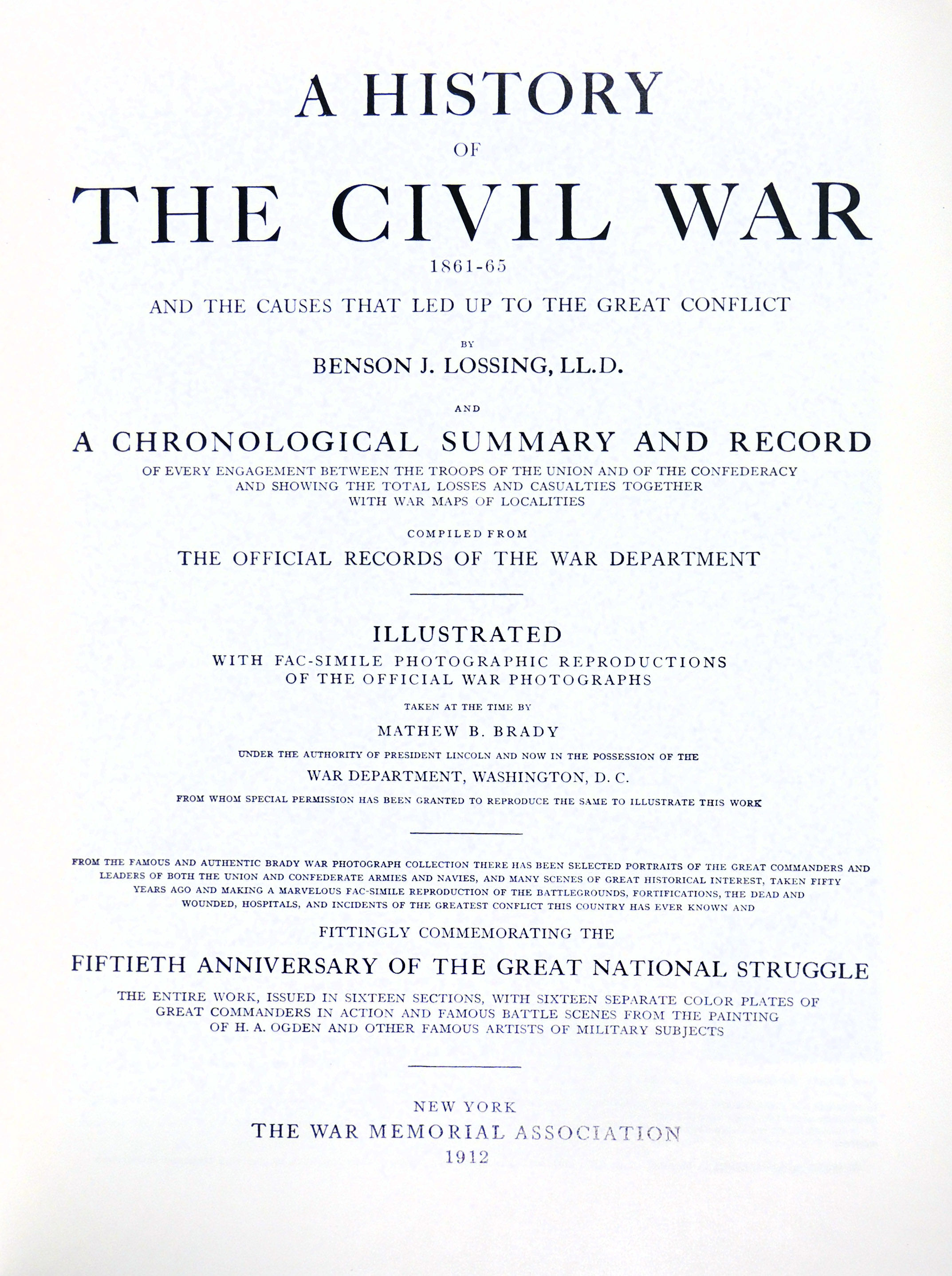 Norwalk, CT: Easton Press, 2012. Hardcover. Fine. Hardcover. Number 343 of 1865 copies. This handsome edition is a reprint of the 1912 edition published by the War Memorial Association on the fiftieth Anniversary of "the great national struggle." It offers a chronological summary and record of every engagement between the troops, showing the total losses and casualties together with maps of the localities. It is illustrated with facsimile photographic reproductions of the official war photographs take at the time by Mathew B. Brady, with color plates by Ogden, Thulstrup, Davidson and others. Bound in red cowhide leather from Italy, with multicolor decoration and custom binding by Kingsport Book. All edges gilt. The text, photographs, and color plates are printed on Utopia Matt by Appleton Papers, with section covers on blue Wausau Exact Vellum Bristol. Housed in a custom slipcase of red cloth with repeat of book's cover design. Accompanied with a certificate of limititation and in the original packing box. In fine condition. Measures 8.75 x 12 inches. 512 pages.