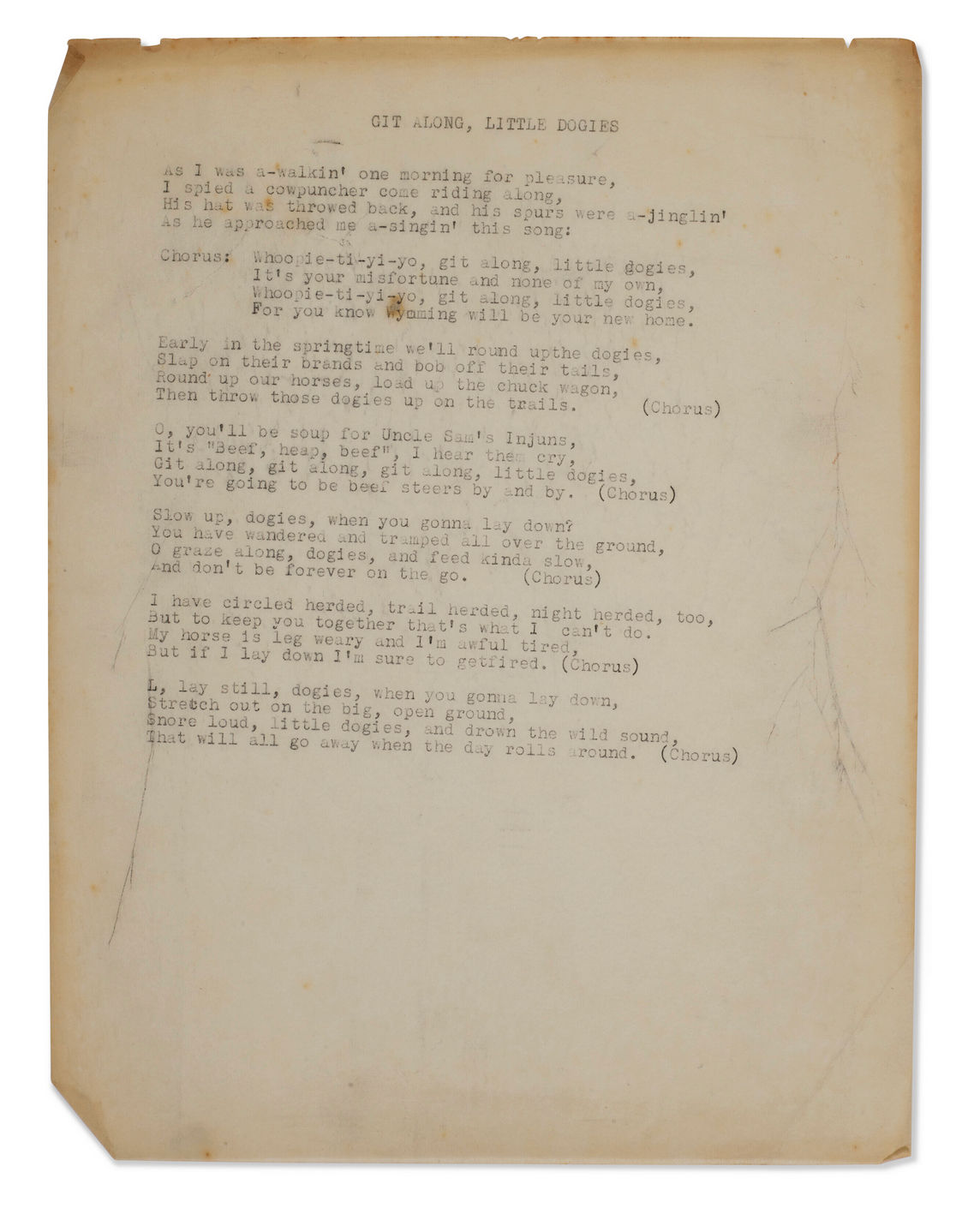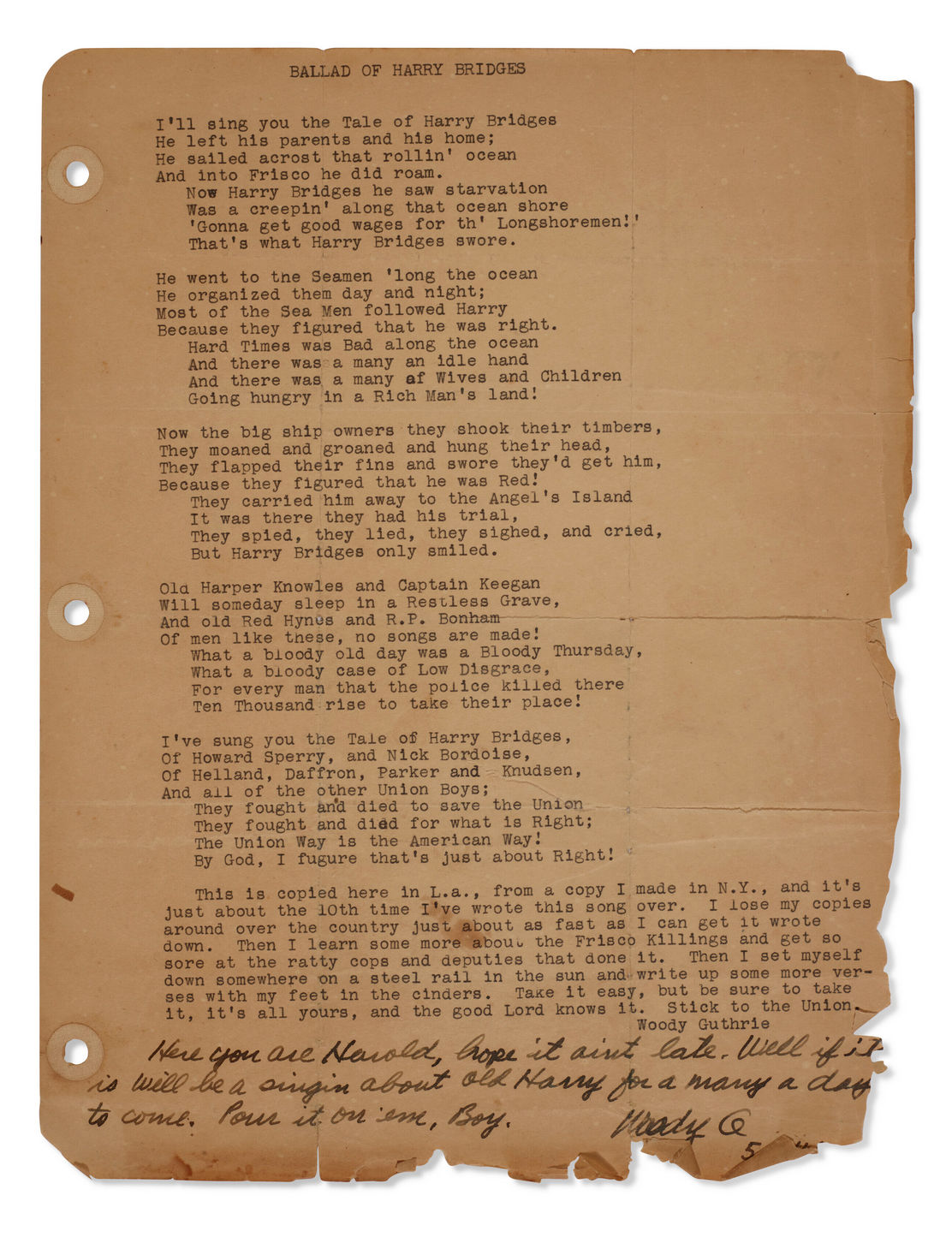 New York, 1940. Eighty-five pages, including sixty loose pages and a partial draft of Guthrie’s Hard Hitting Songs for Hard Hit People, totaling twenty-five pages. With one handwritten page. One page - a typewritten copy of “The Ballad of Harry Bridges” - with a handwritten note by Guthrie to Ambellan. With photocopies of several letters from Guthrie to Ambellan included. Also with a broadside of the Carol Tree Carol by Alan and Elizabeth Lomax (1940) and a notecard with the lyrics to “Hawl Away Joe” written Inscription states “Here you are Harold, hope it aint late. Well if it is will be singing about old Harry for a many a day to come. Pour it on em, Boy. Woody G.”. A fascinating collection of material from the collection of Harold Ambellan, Woodie Guthrie’s friend, collaborator and landlord during an important creative period for Guthrie in the 1940s. The group contains a partial draft of Guthrie’s Hard Hitting Songs for Hard Hit People, which was written while Guthrie was living in Ambellan’s loft, as well as a collection of over sixty loose songsheets not included in the book. Of these, over thirty are not listed in Tulsa’s Woody Guthrie Center finding aid. The sixty pages include variant titles and verses to recorded and published versions, with some items attributed to Ledbelly, and overall the group should shed light on scholar’s efforts to map out the landscape of the American folk song at the time of Guthrie’s work. The typescript draft generally matches the published version, with the occasional typo.