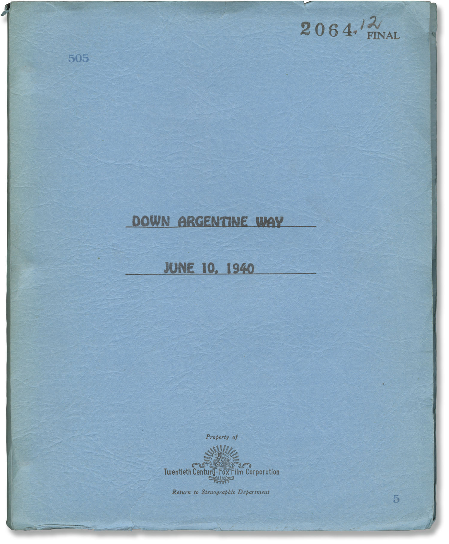 Blue titled wrappers, noted as FINAL on the front wrapper, rubber-stamped production No. 505, dated JUNE 10 1940. Distribution page present, stamped copy No. 5, with receipt intact. Title page present, dated June 10, 1940, noted as Final Script, with credits for screenwriters Darrell Ware and Karl Tunberg. 144 leaves, with last page of text numbered 142. Mimeograph duplication, rectos only, with two blue revision pages dated 6-10-40. Pages Near Fine, wrapper Very Good plus, bound internally with three gold brads.